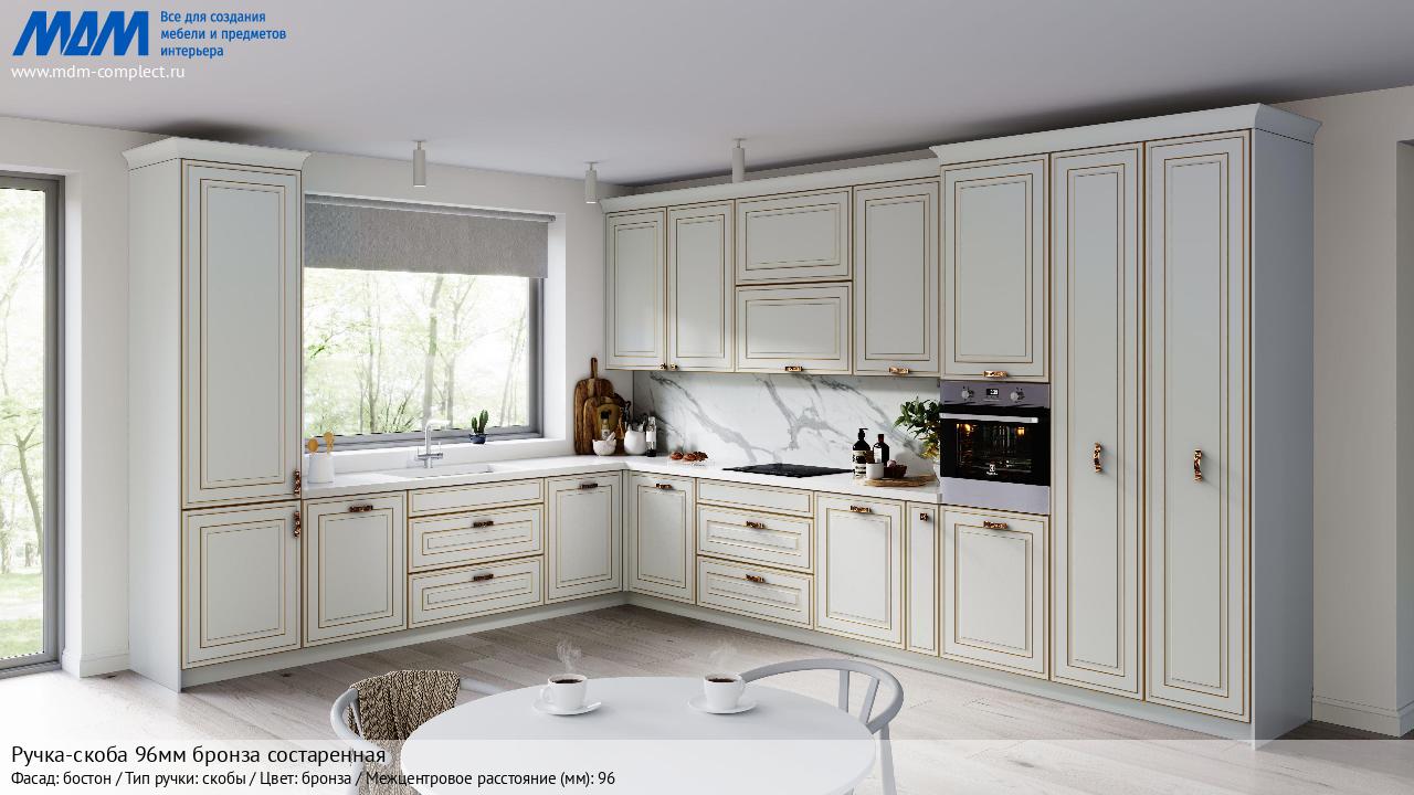 Мебельная Ручка-скоба 96мм бронза состаренная на различных фасадах в кухонном интерьере в стиле классика, лофт, модерн.