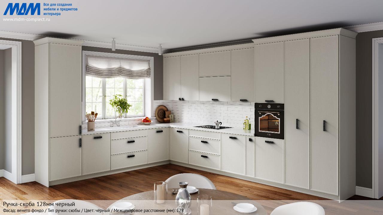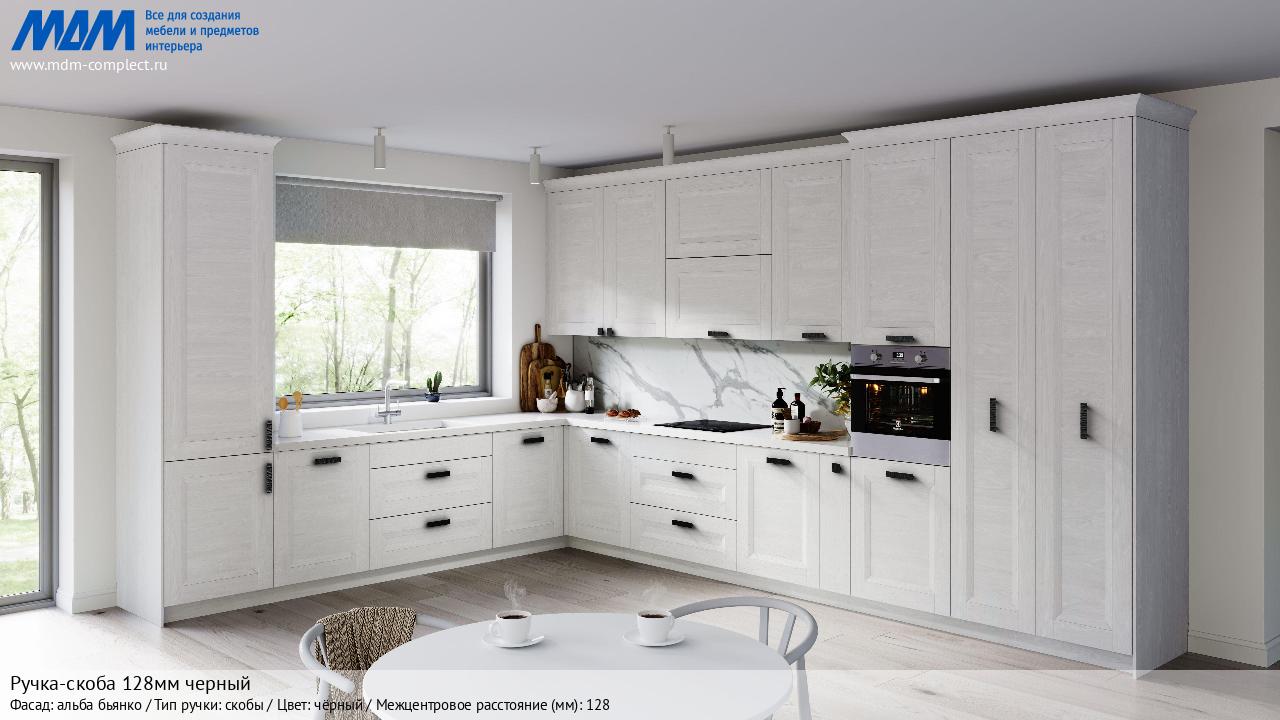 Мебельная Ручка-скоба 128мм черный на различных фасадах в кухонном интерьере в стиле классика, лофт, модерн.