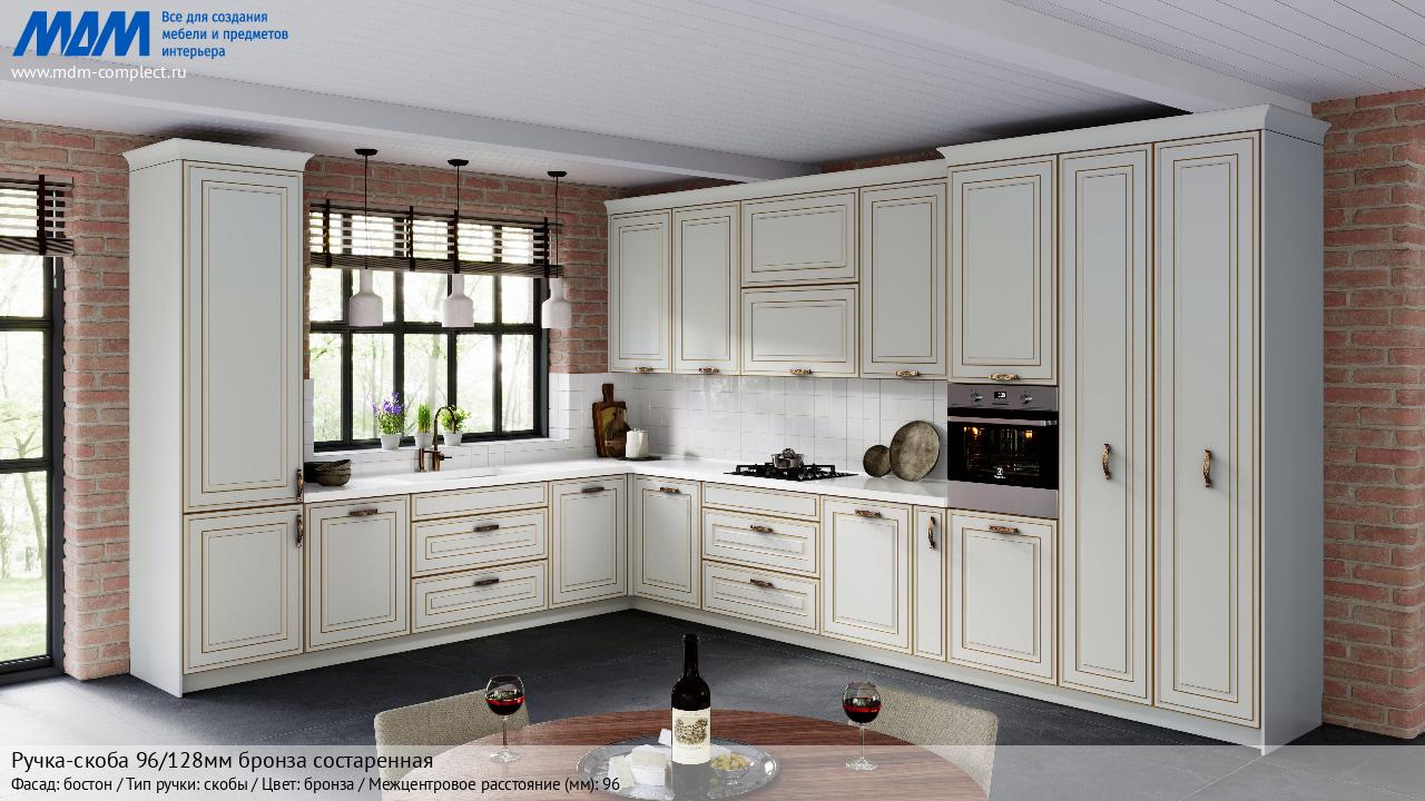 Мебельная Ручка-скоба 96/128мм бронза состаренная на различных фасадах в кухонном интерьере в стиле классика, лофт, модерн.