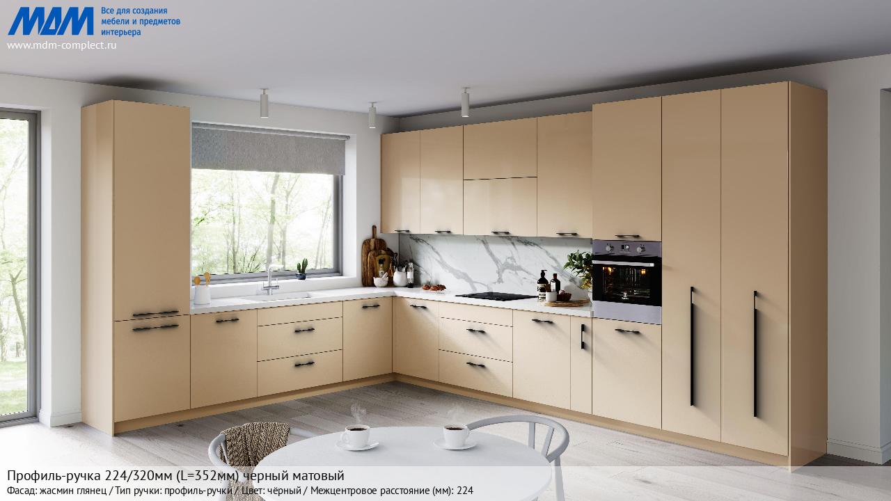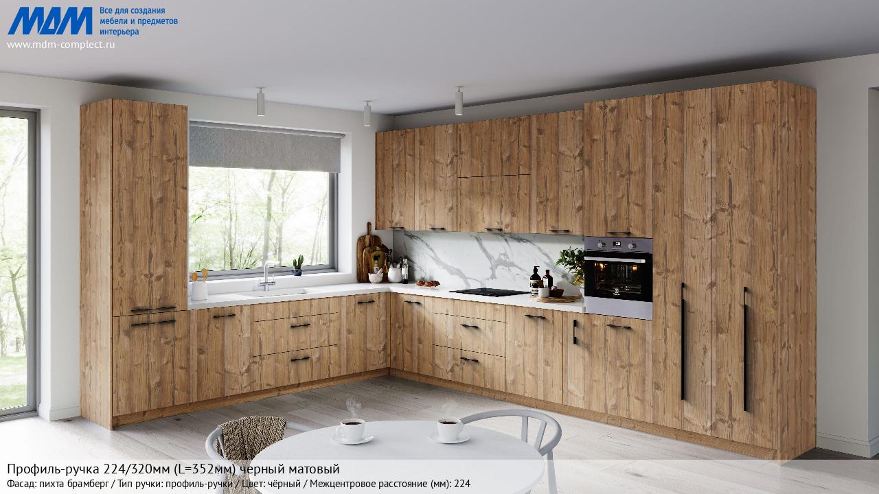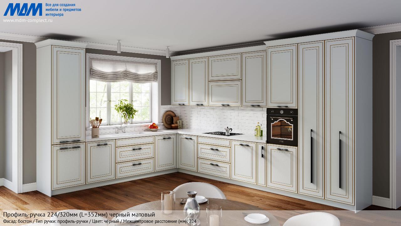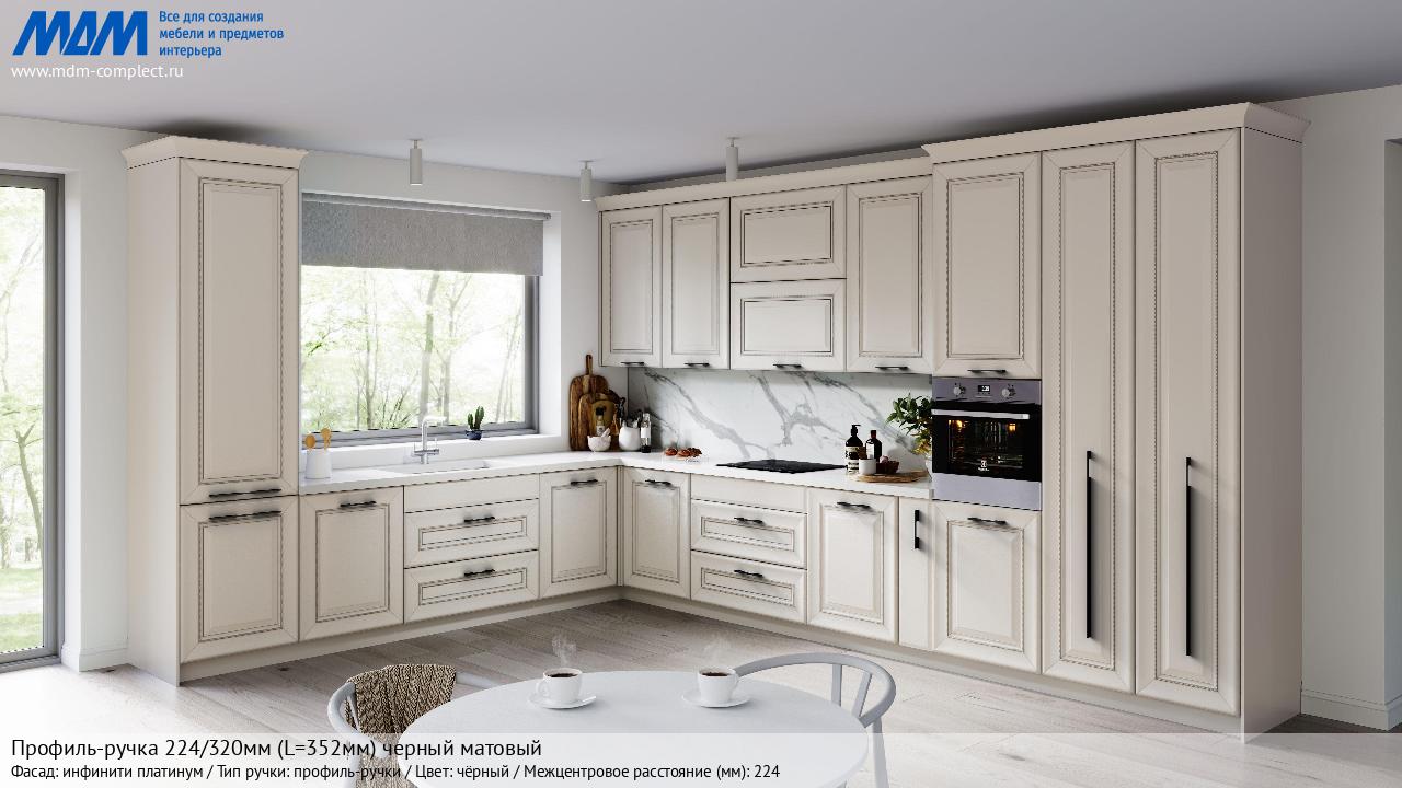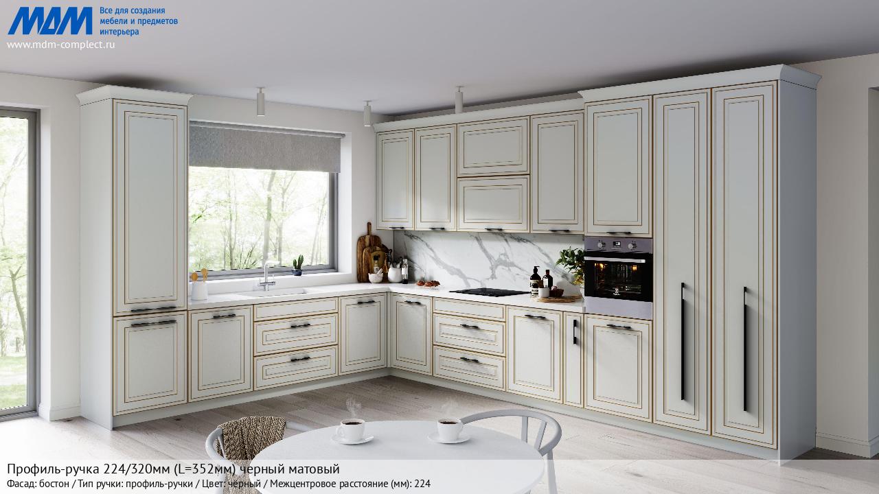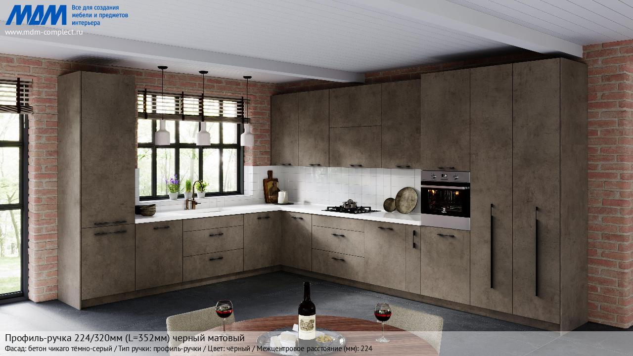 Мебельная Профиль-ручка 224/320мм (L=352мм) черный матовый на различных фасадах в кухонном интерьере в стиле классика, лофт, модерн.