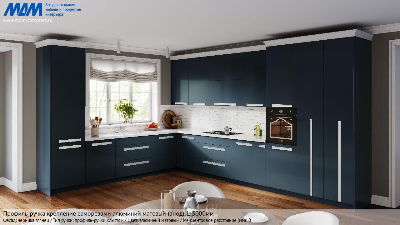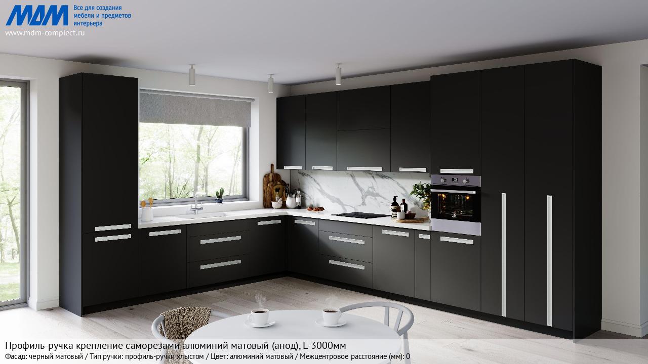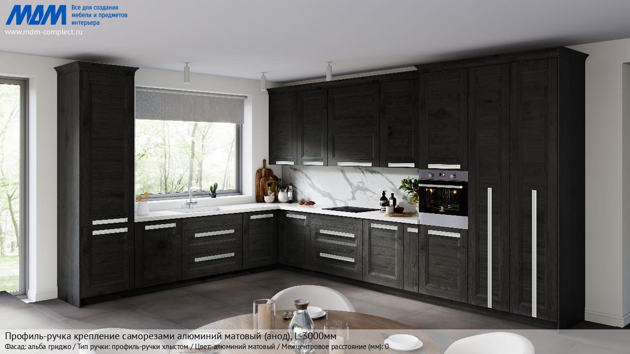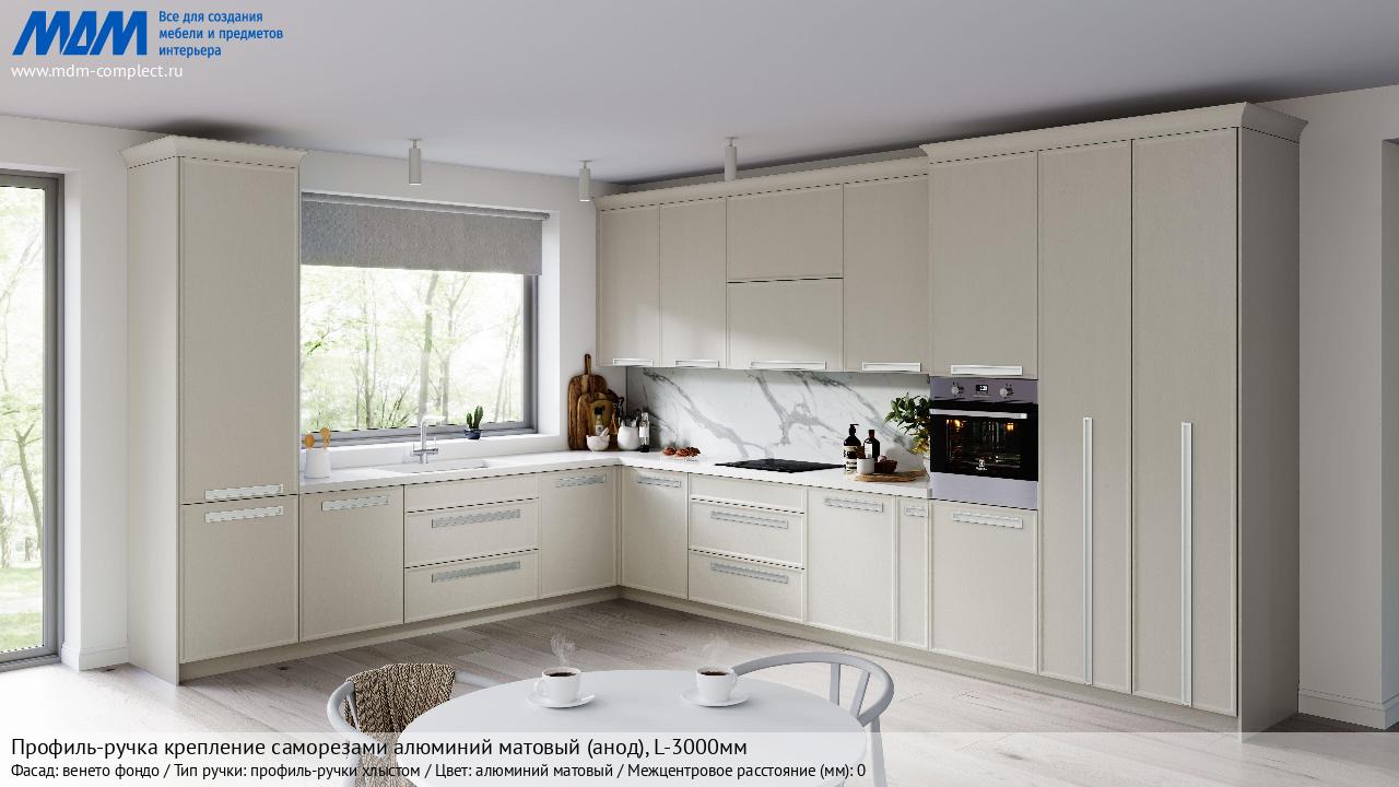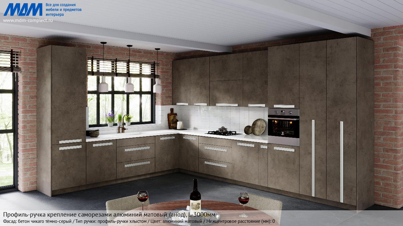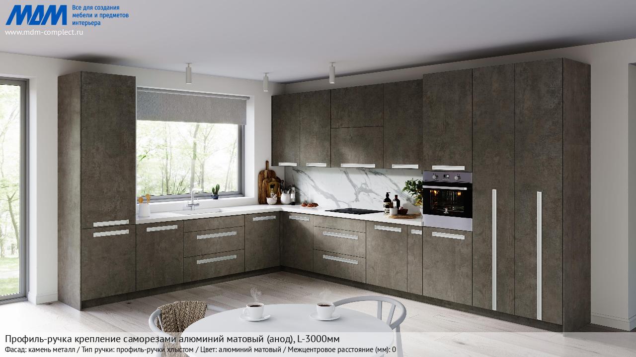 Мебельная Профиль-ручка крепление саморезами алюминий матовый (анод), L-3000мм на различных фасадах в кухонном интерьере в стиле классика, лофт, модерн.