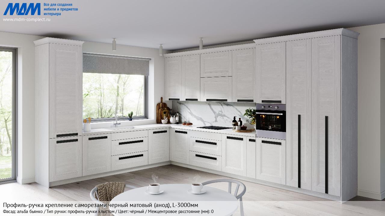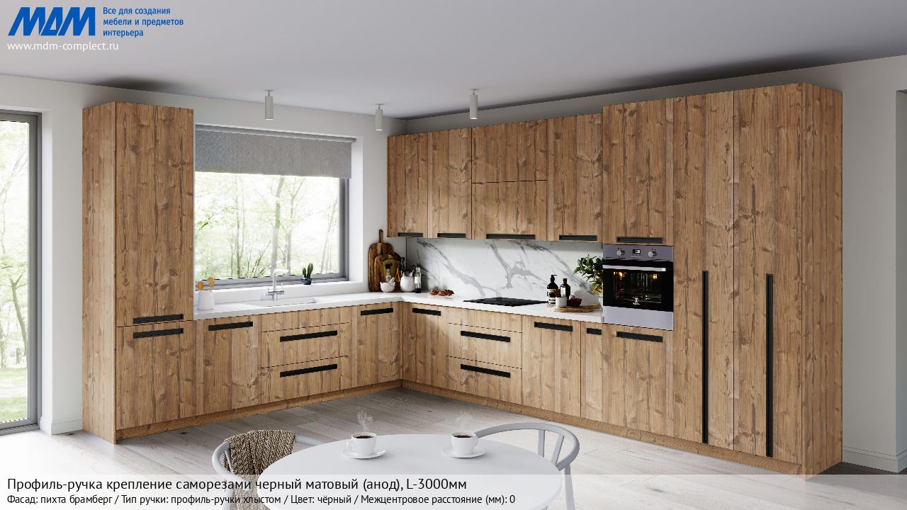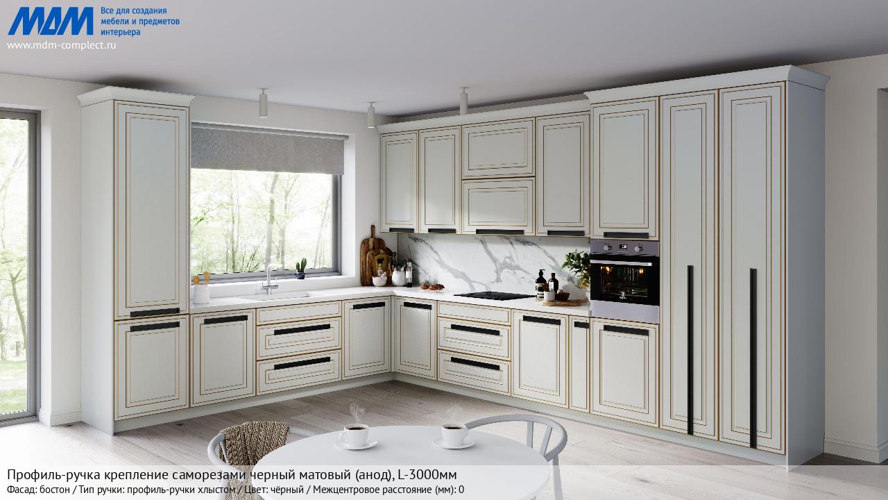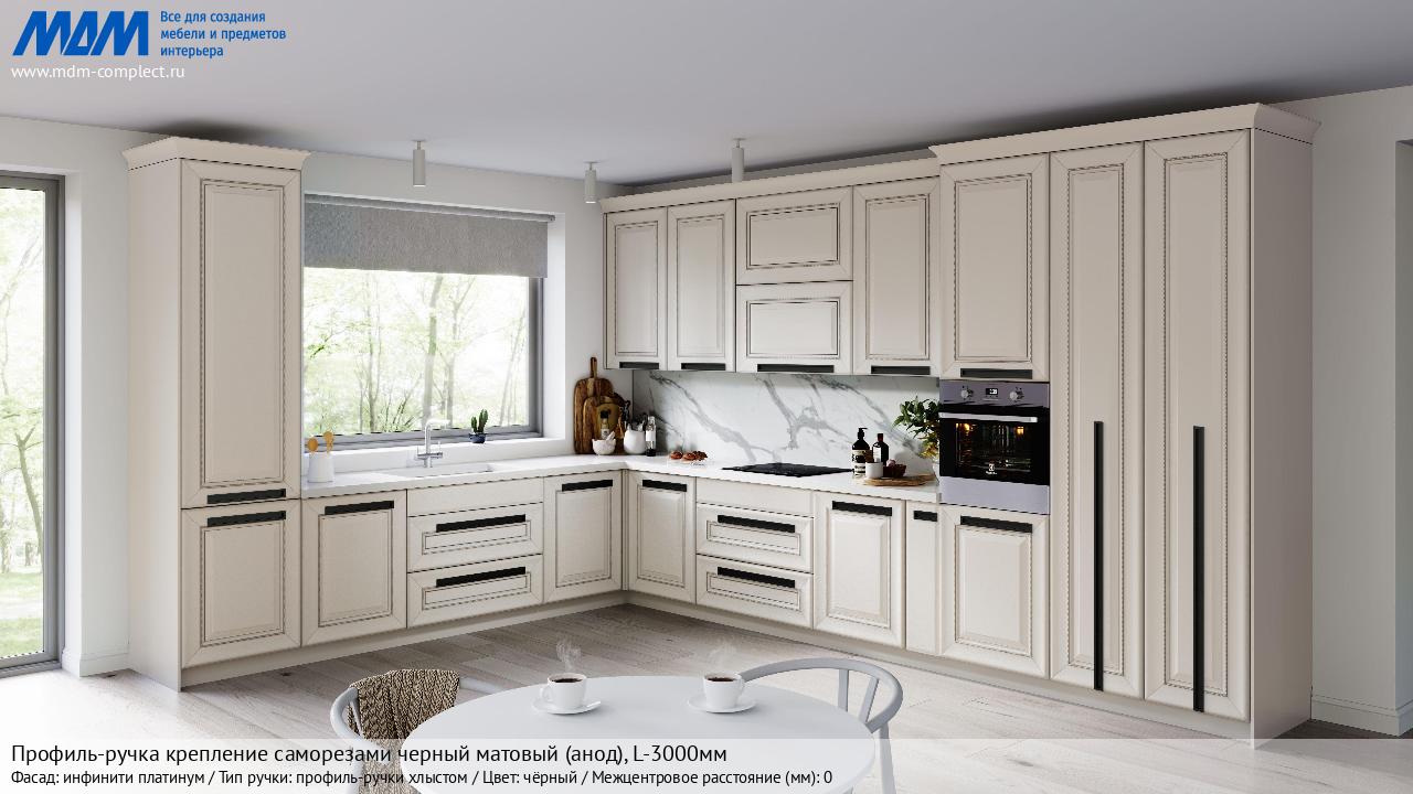 Мебельная Профиль-ручка крепление саморезами черный матовый (анод), L-3000мм на различных фасадах в кухонном интерьере в стиле классика, лофт, модерн.