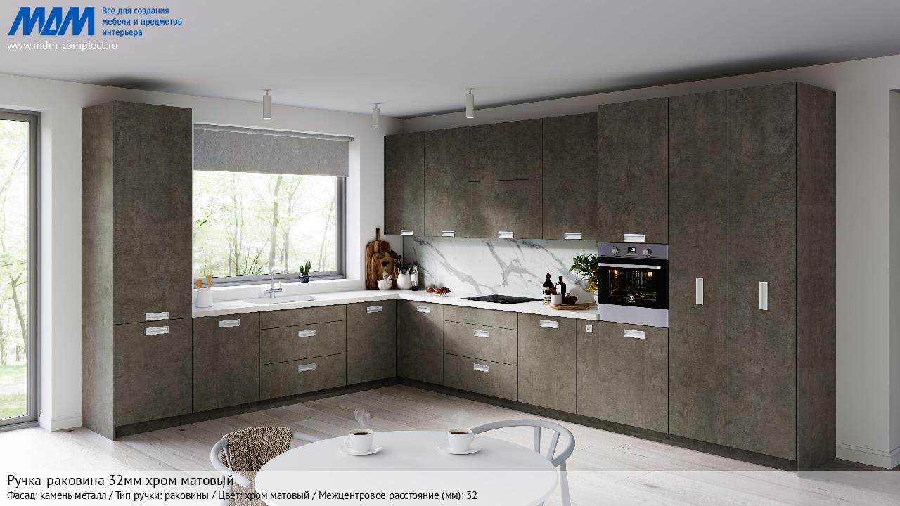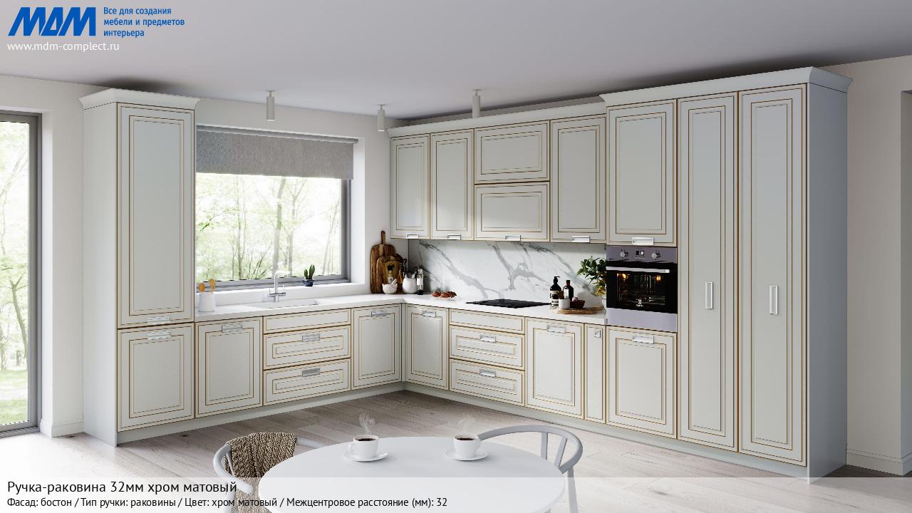 Мебельная Ручка-раковина 32мм хром матовый на различных фасадах в кухонном интерьере в стиле классика, лофт, модерн.