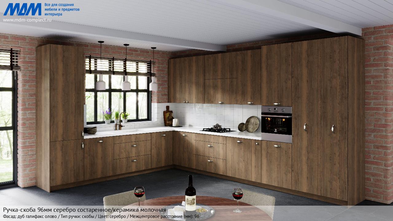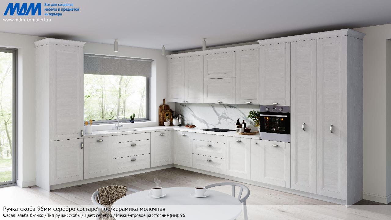 Мебельная Ручка-скоба 96мм серебро состаренное/керамика молочная на различных фасадах в кухонном интерьере в стиле классика, лофт, модерн.