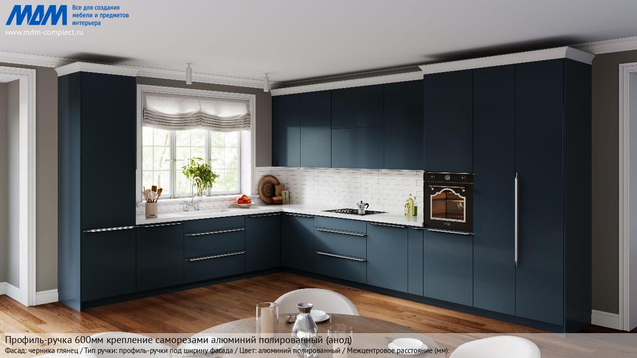 Мебельная Профиль-ручка 600мм крепление саморезами алюминий полированный (анод) на различных фасадах в кухонном интерьере в стиле классика, лофт, модерн.