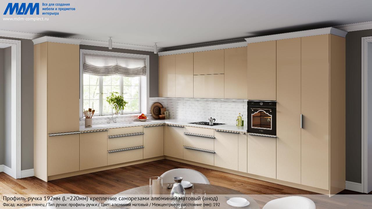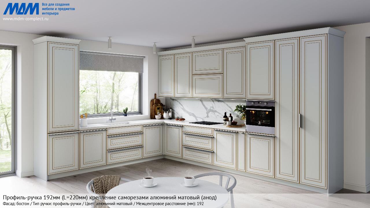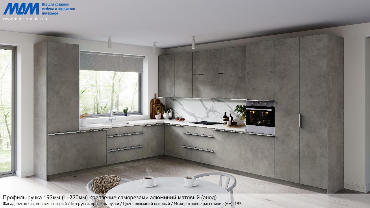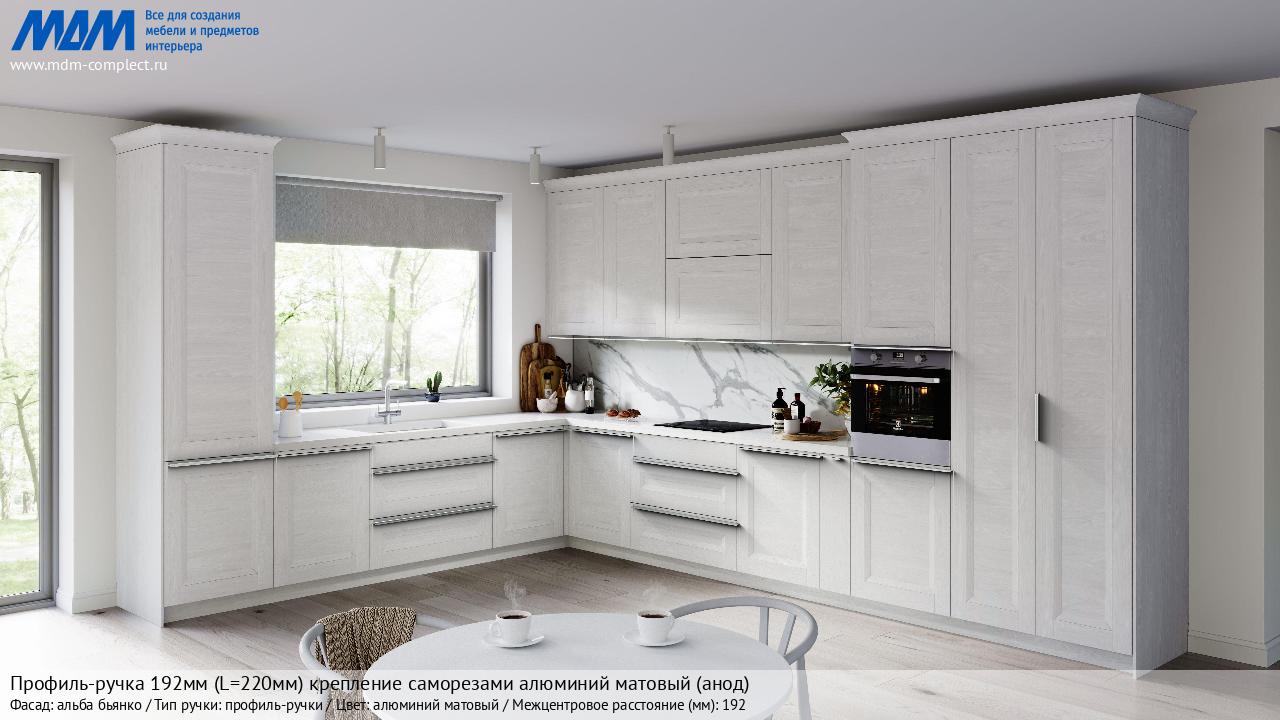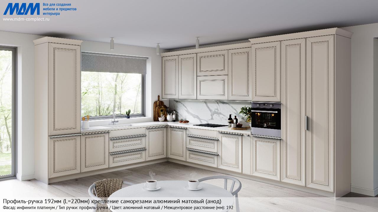 Мебельная Профиль-ручка 192мм (L=220мм) крепление саморезами алюминий матовый (анод) на различных фасадах в кухонном интерьере в стиле классика, лофт, модерн.