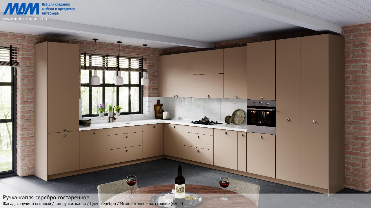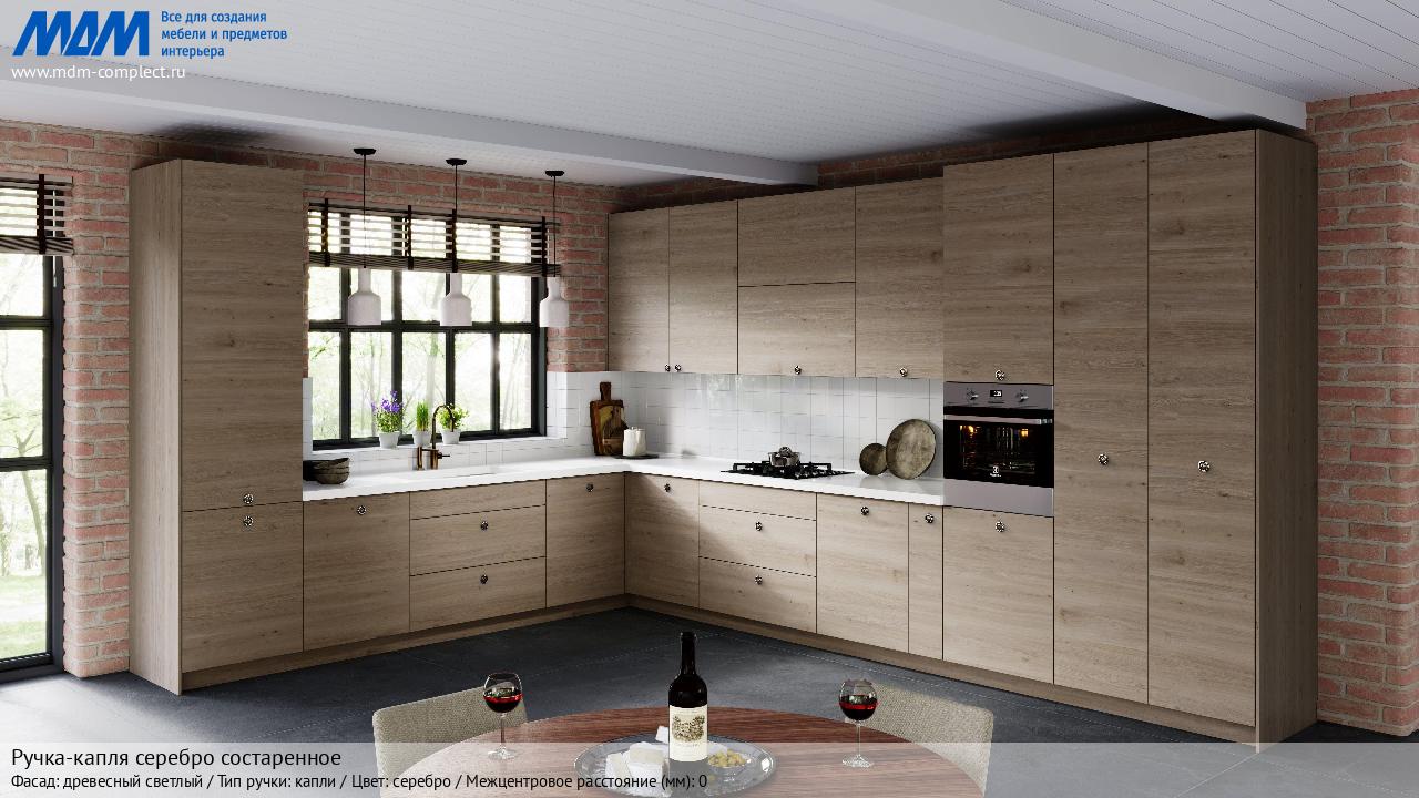 Мебельная Ручка-капля серебро состаренное на различных фасадах в кухонном интерьере в стиле классика, лофт, модерн.