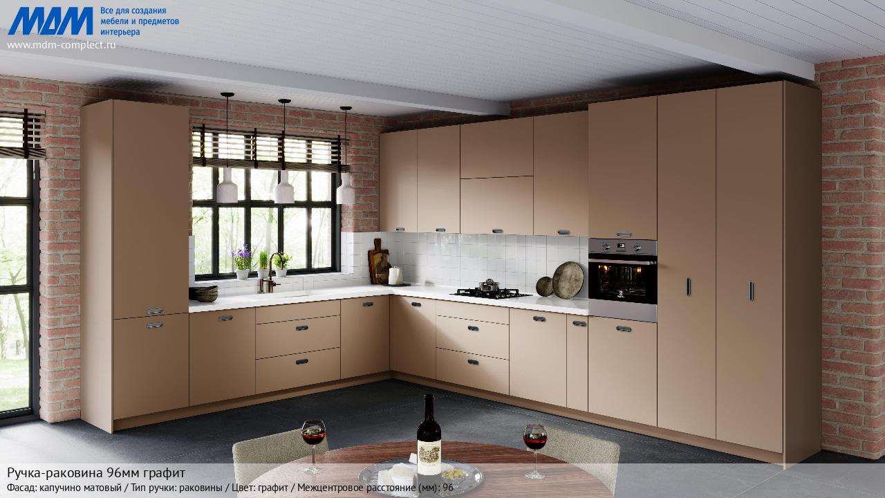 Мебельная Ручка-раковина 96мм графит на различных фасадах в кухонном интерьере в стиле классика, лофт, модерн.