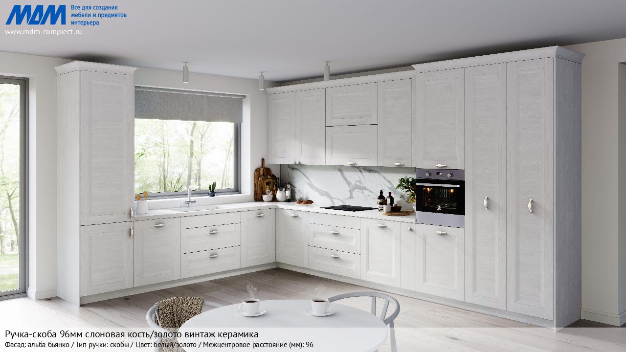 Ручка-скоба 96мм cлоновая кость/золото винтаж керамика (WMN.77.01.00.096.T5) в готовой кухне на различных фасадах