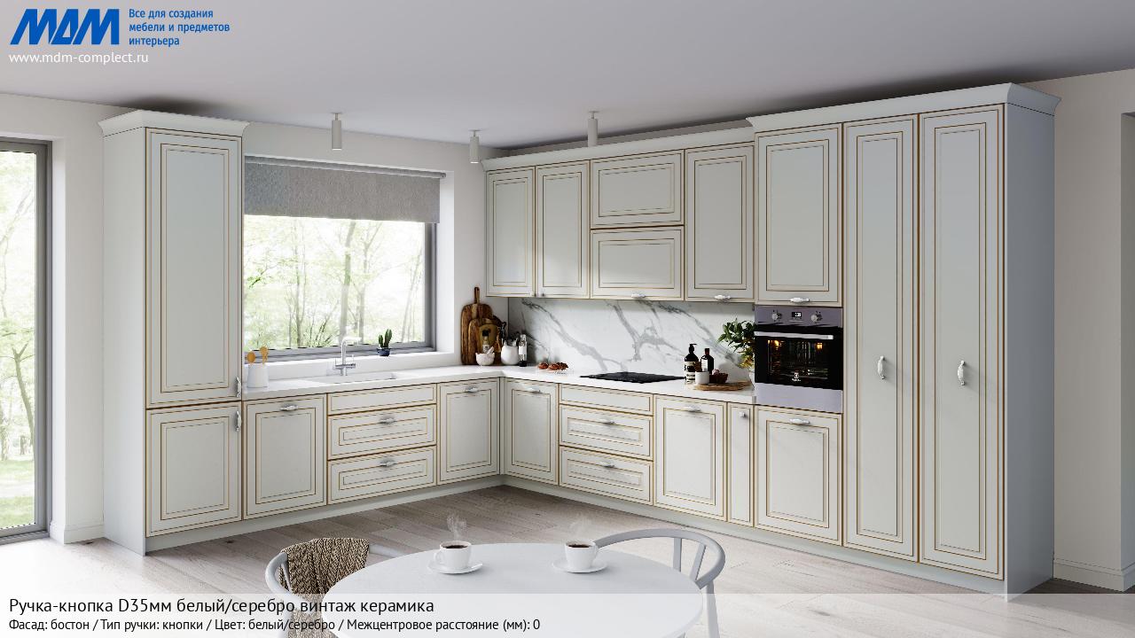 Мебельная Ручка-кнопка D35мм белый/серебро винтаж керамика на различных фасадах в кухонном интерьере в стиле классика, лофт, модерн.
