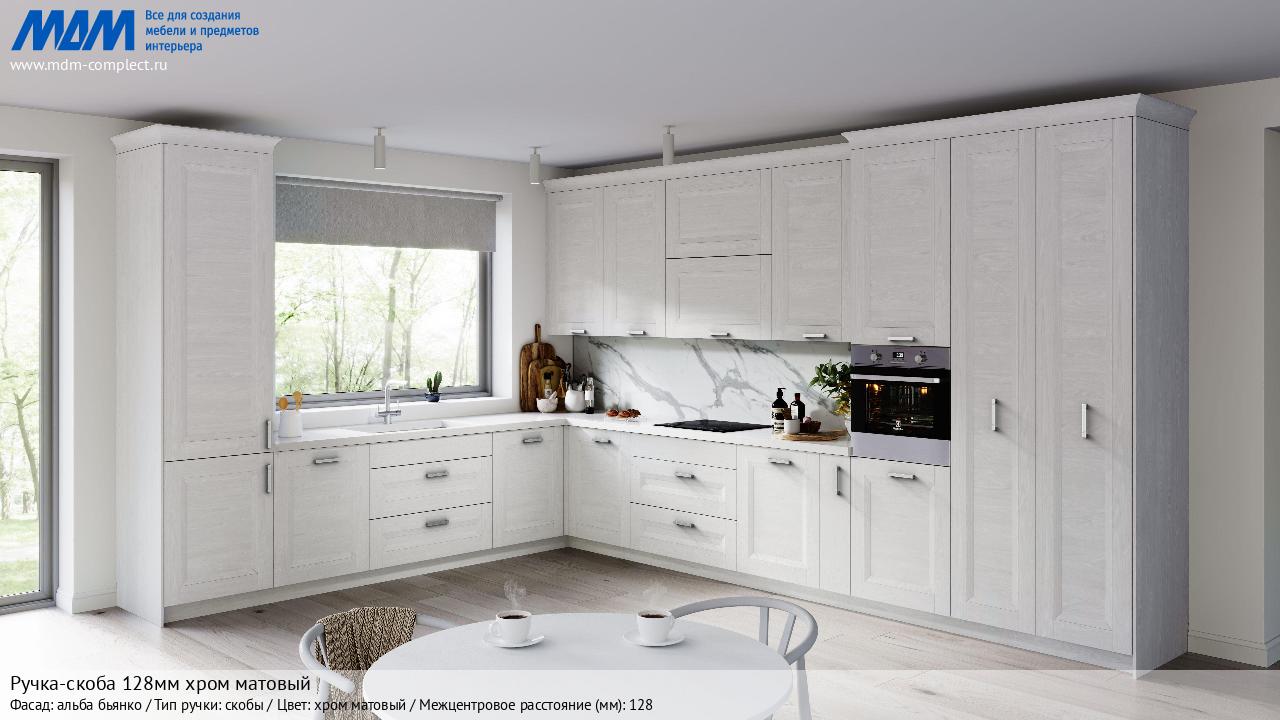 Мебельная Ручка-скоба 128мм хром матовый на различных фасадах в кухонном интерьере в стиле классика, лофт, модерн.