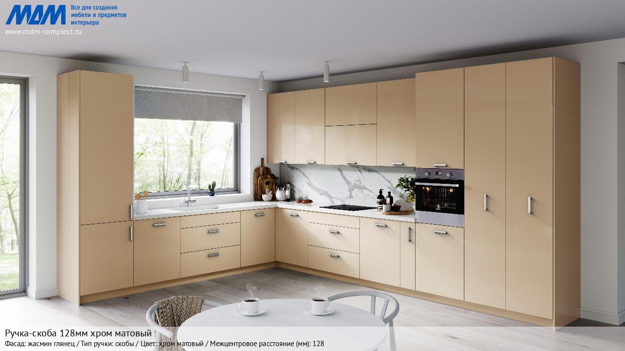 Ручка-скоба 128мм хром матовый (BH.66.128.SC) в готовой кухне на различных фасадах