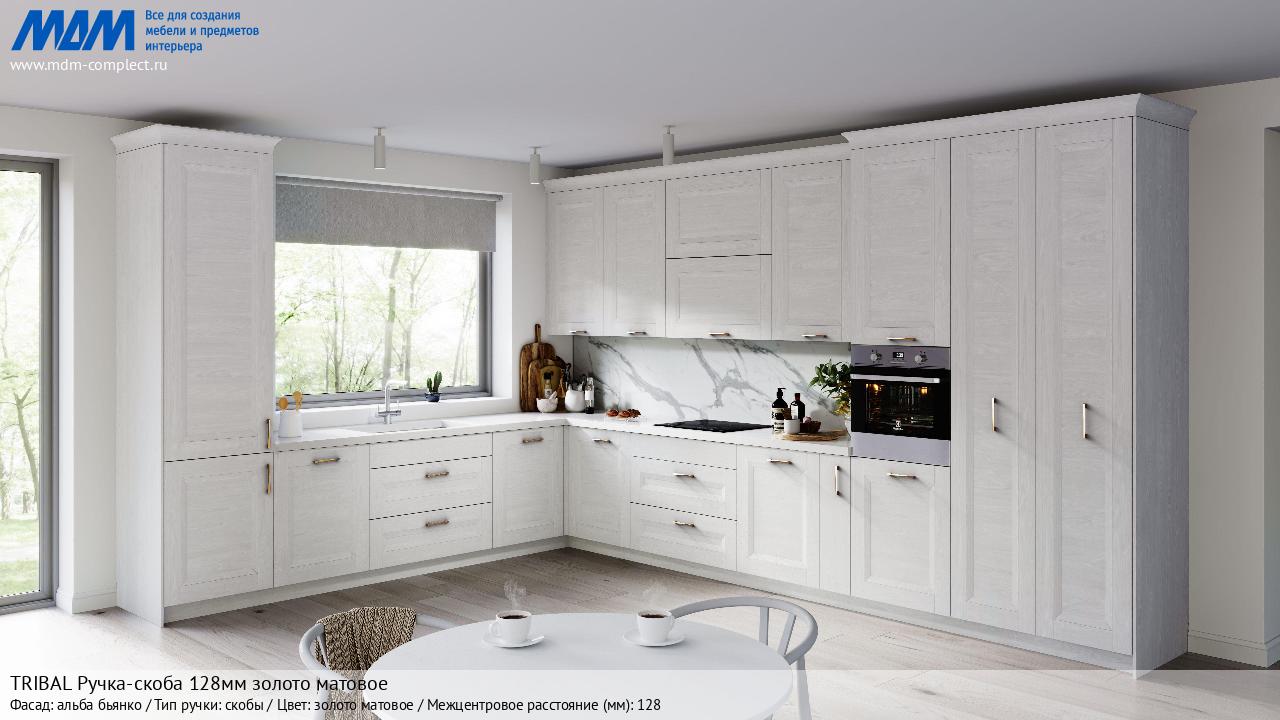 Мебельная TRIBAL Ручка-скоба 128мм золото матовое на различных фасадах в кухонном интерьере в стиле классика, лофт, модерн.
