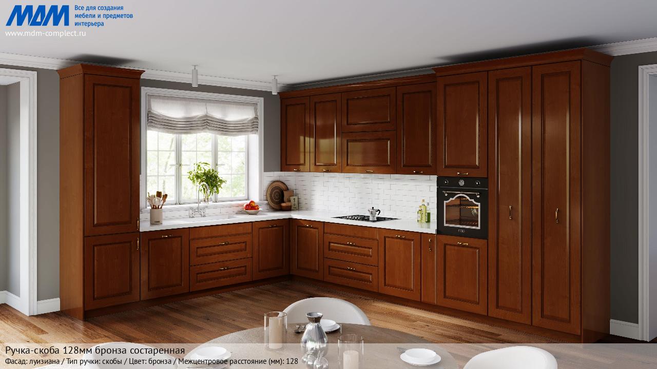 Мебельная Ручка-скоба 128мм бронза состаренная на различных фасадах в кухонном интерьере в стиле классика, лофт, модерн.
