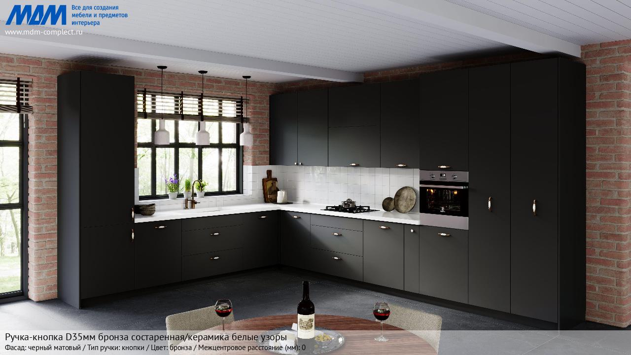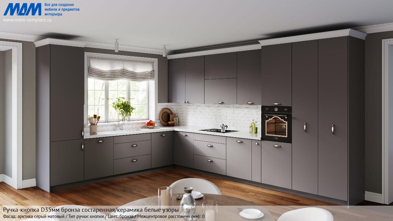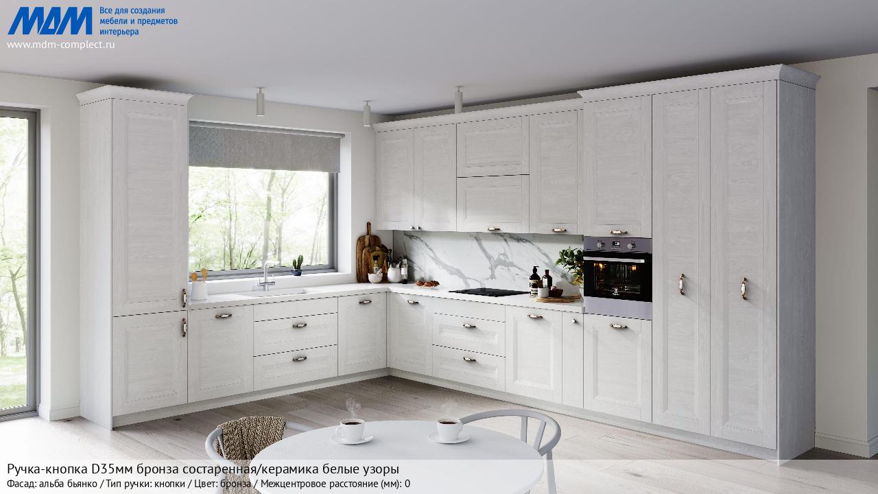 Мебельная Ручка-кнопка D35мм бронза состаренная/керамика белые узоры на различных фасадах в кухонном интерьере в стиле классика, лофт, модерн.