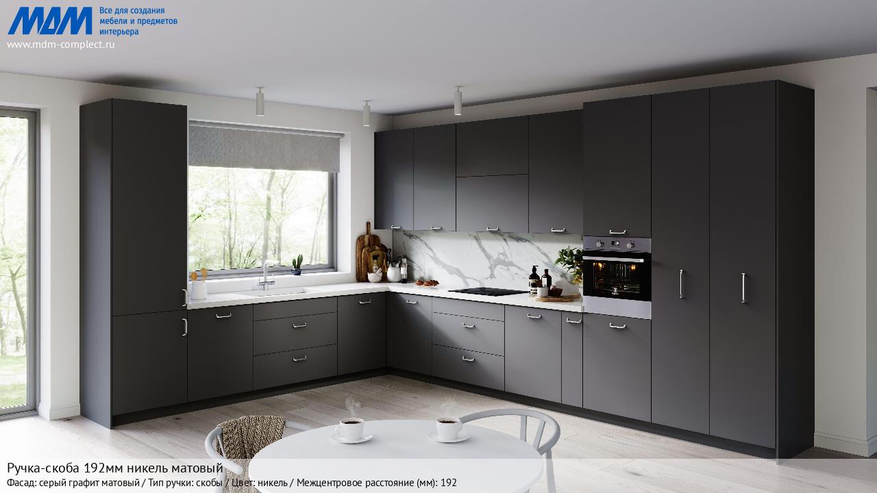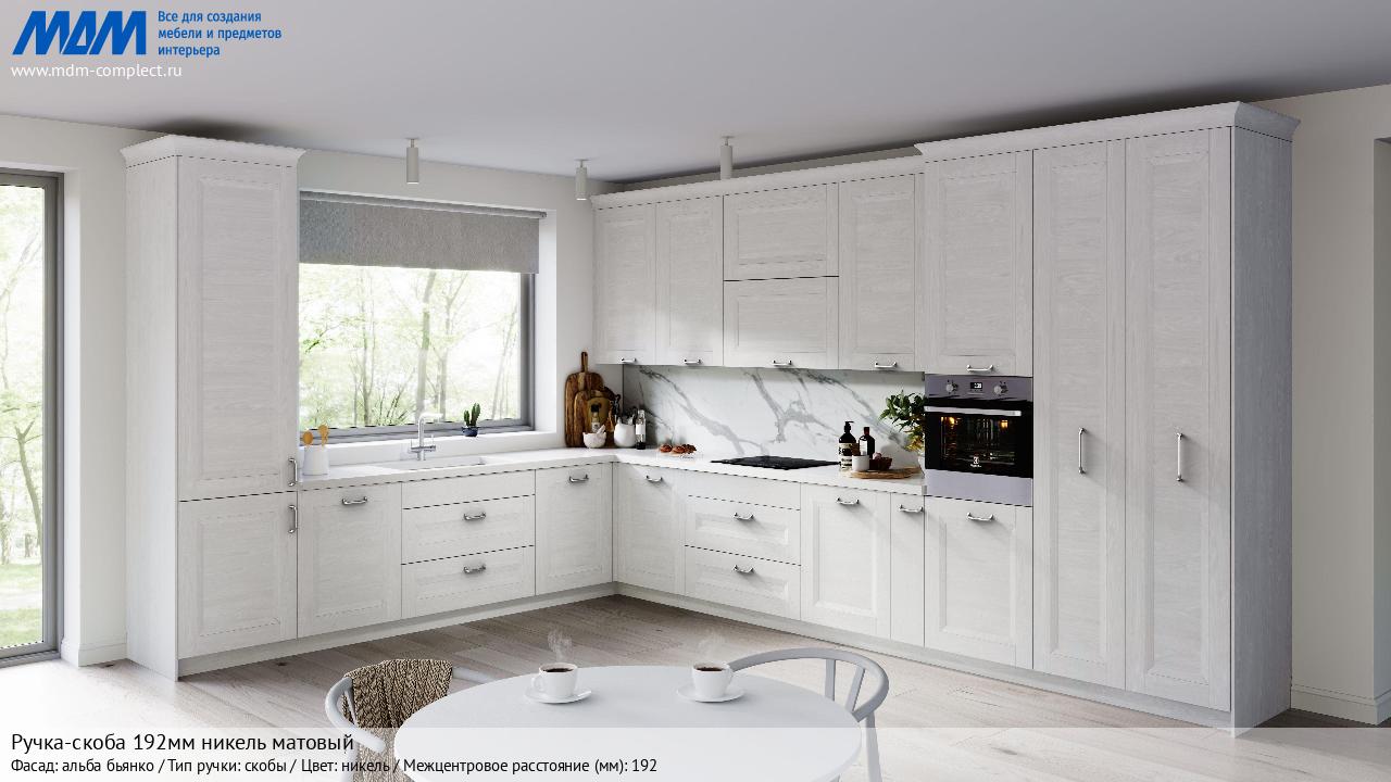 Мебельная Ручка-скоба 192мм никель матовый на различных фасадах в кухонном интерьере в стиле классика, лофт, модерн.