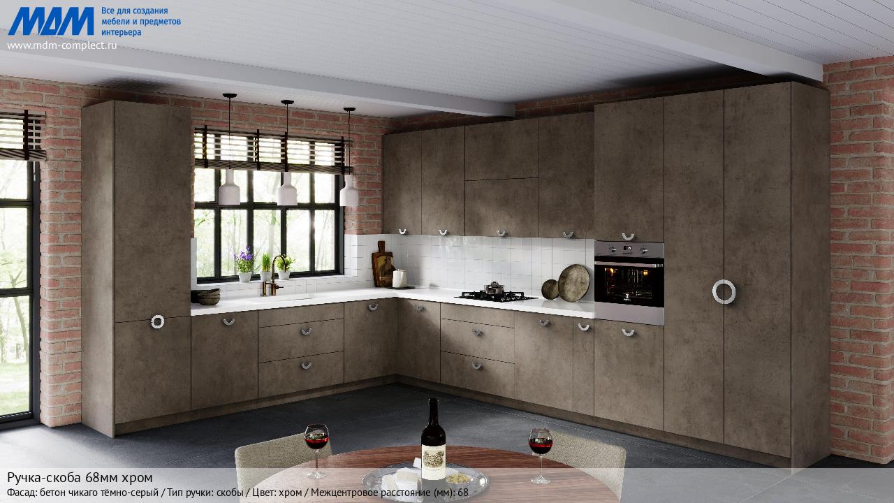 Мебельная Ручка-скоба 68мм хром на различных фасадах в кухонном интерьере в стиле классика, лофт, модерн.