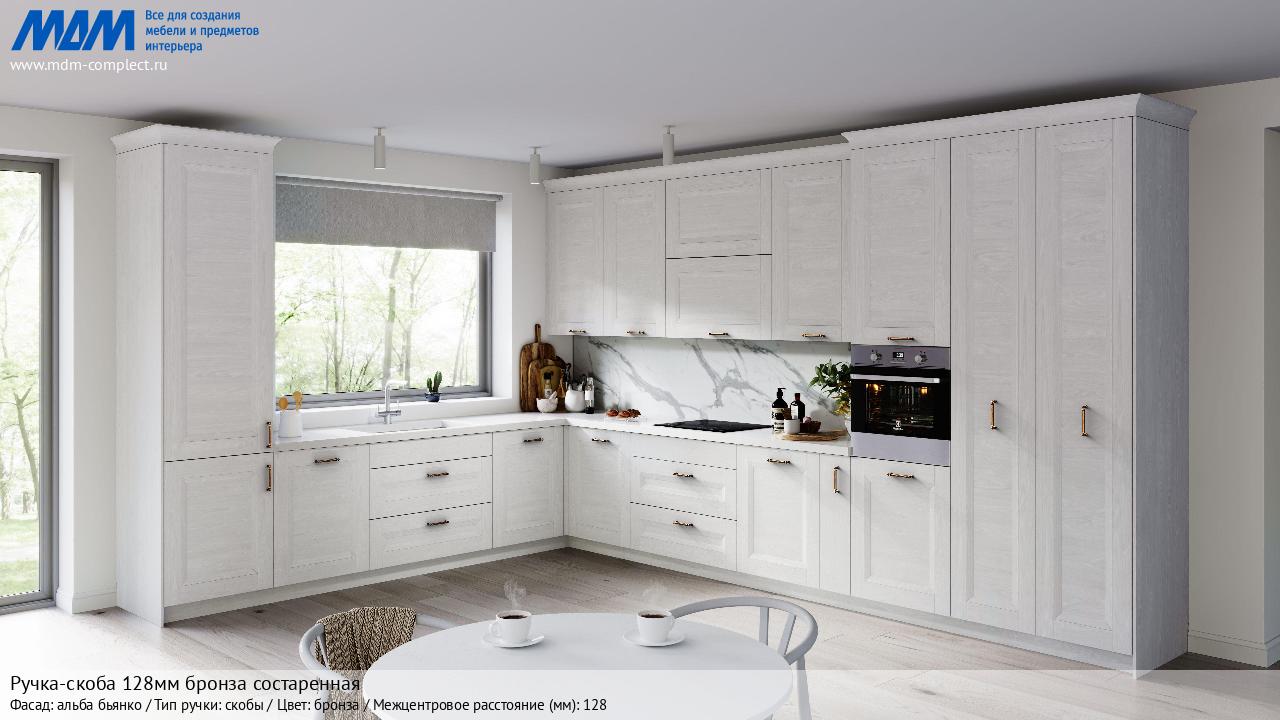 Мебельная Ручка-скоба 128мм бронза состаренная на различных фасадах в кухонном интерьере в стиле классика, лофт, модерн.