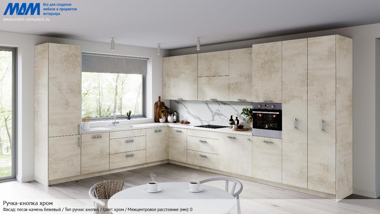 Мебельная Ручка-кнопка хром на различных фасадах в кухонном интерьере в стиле классика, лофт, модерн.