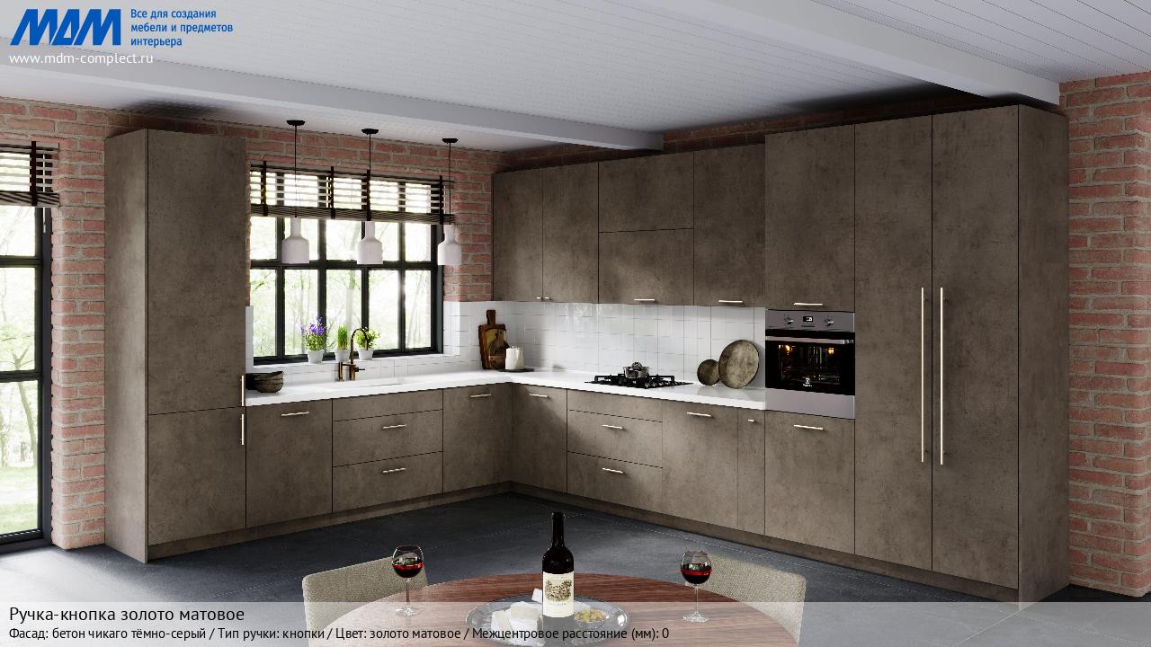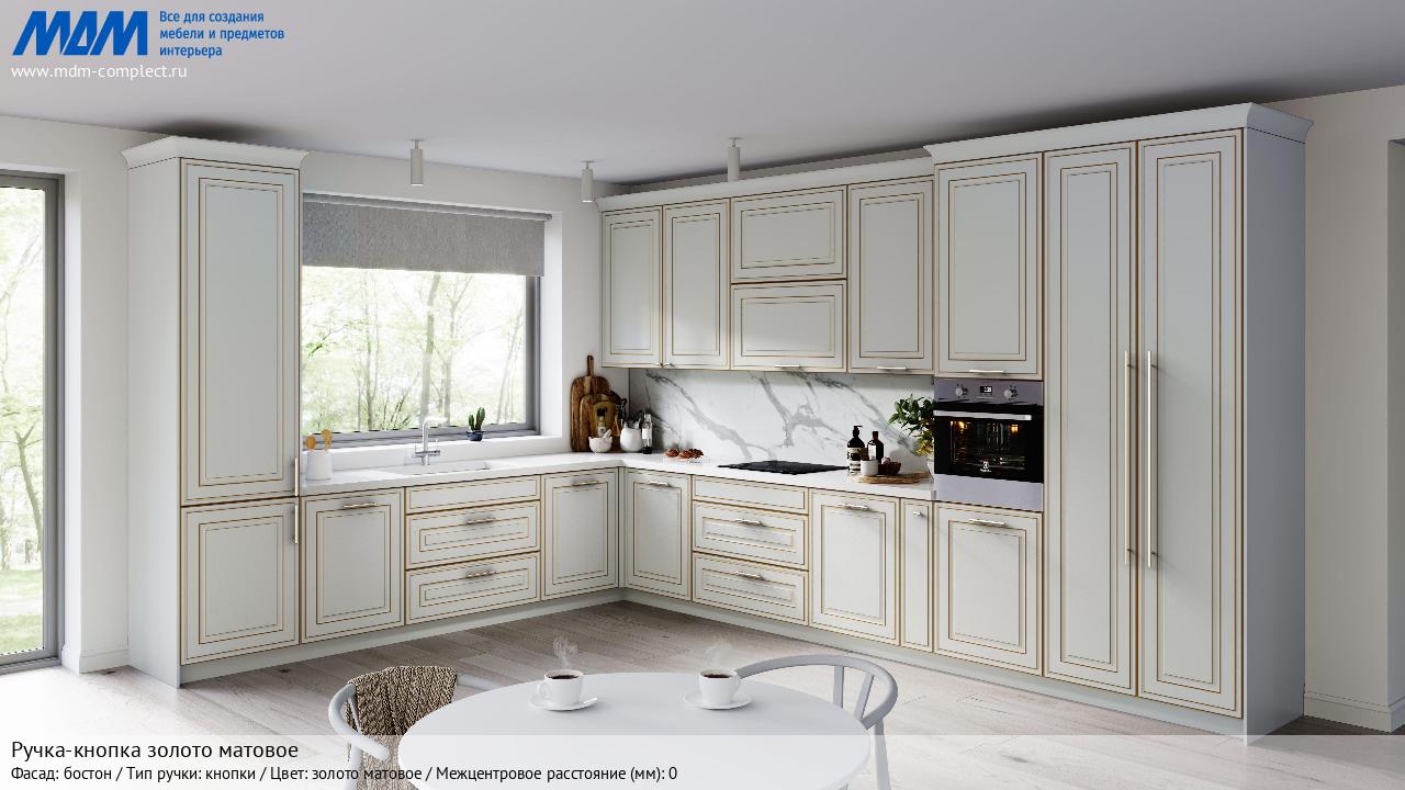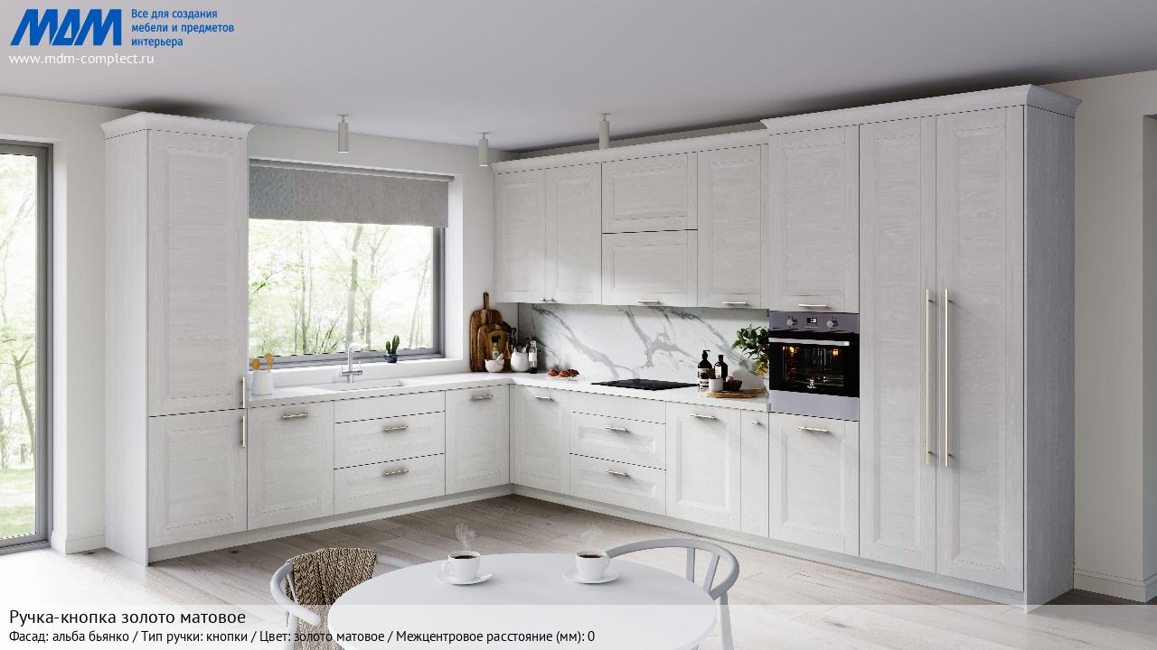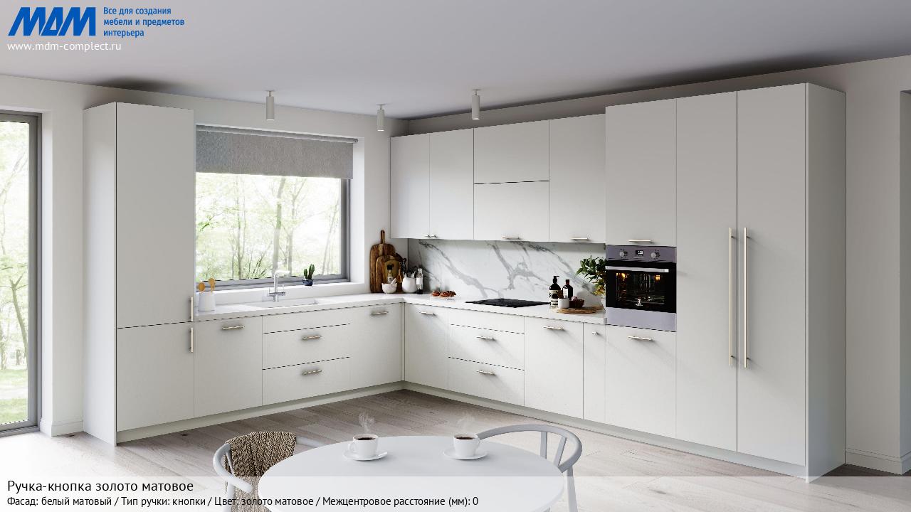 Мебельная Ручка-кнопка золото матовое на различных фасадах в кухонном интерьере в стиле классика, лофт, модерн.