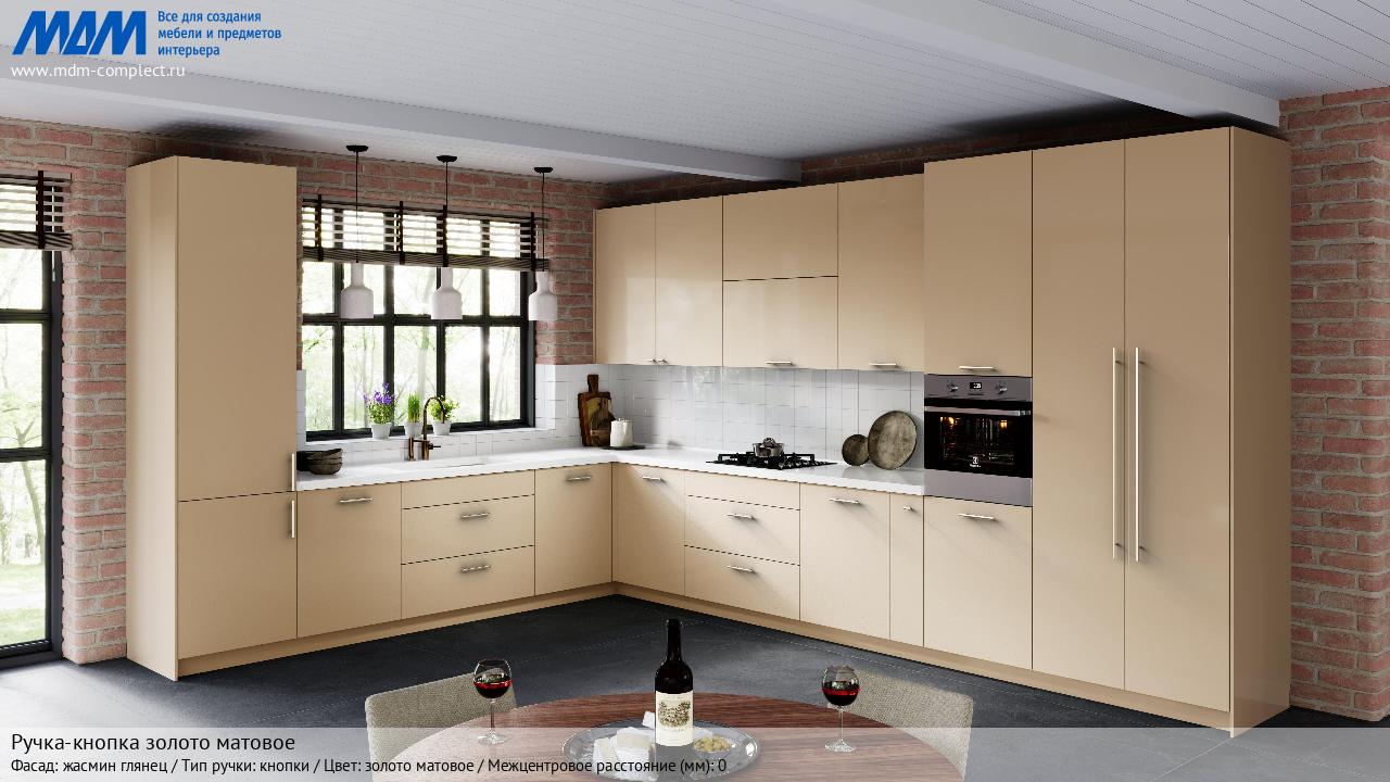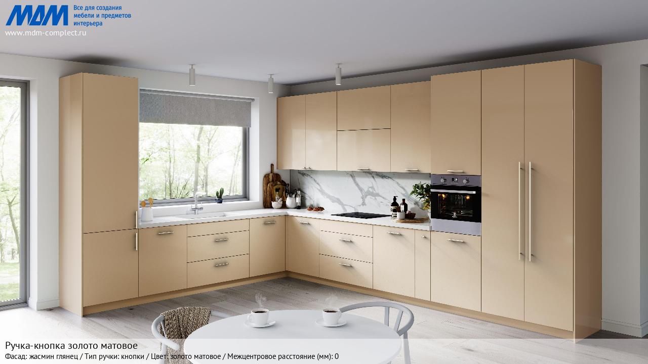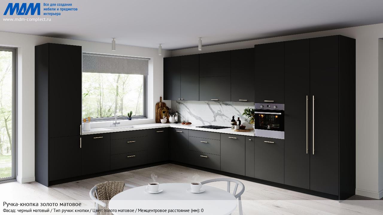 Ручка-кнопка золото матовое (KH.39.000.GA) в готовой кухне на различных фасадах