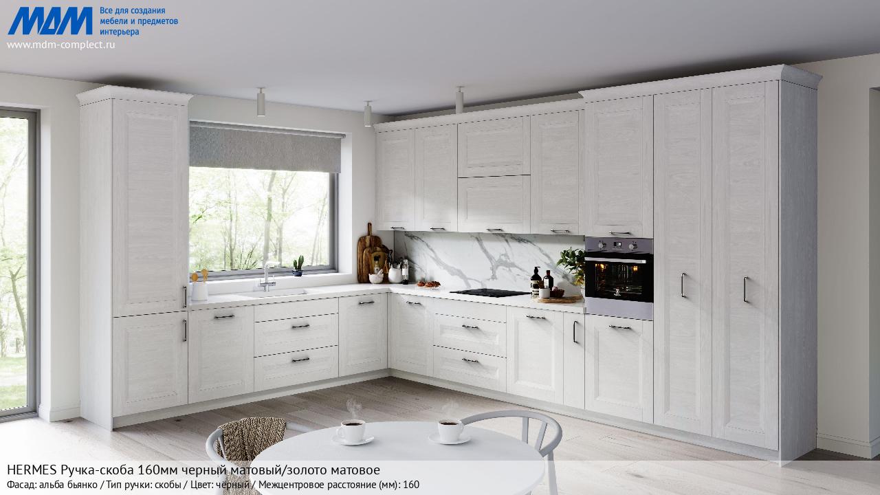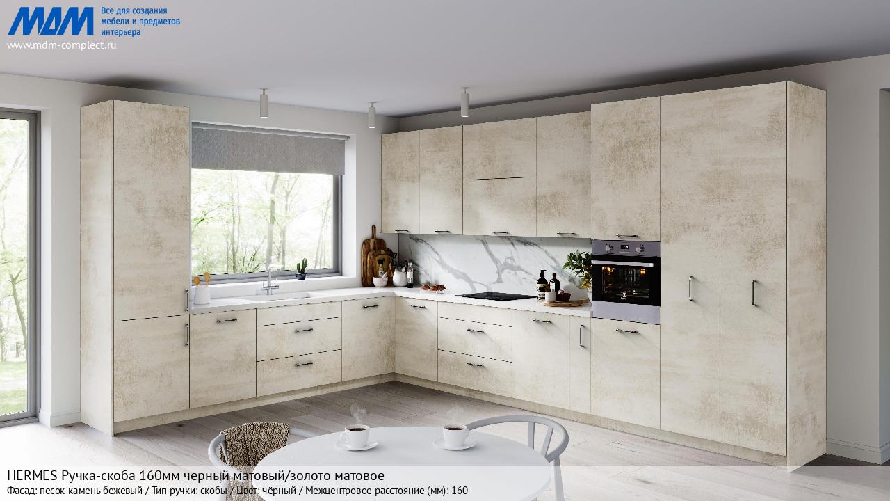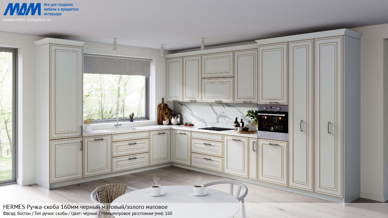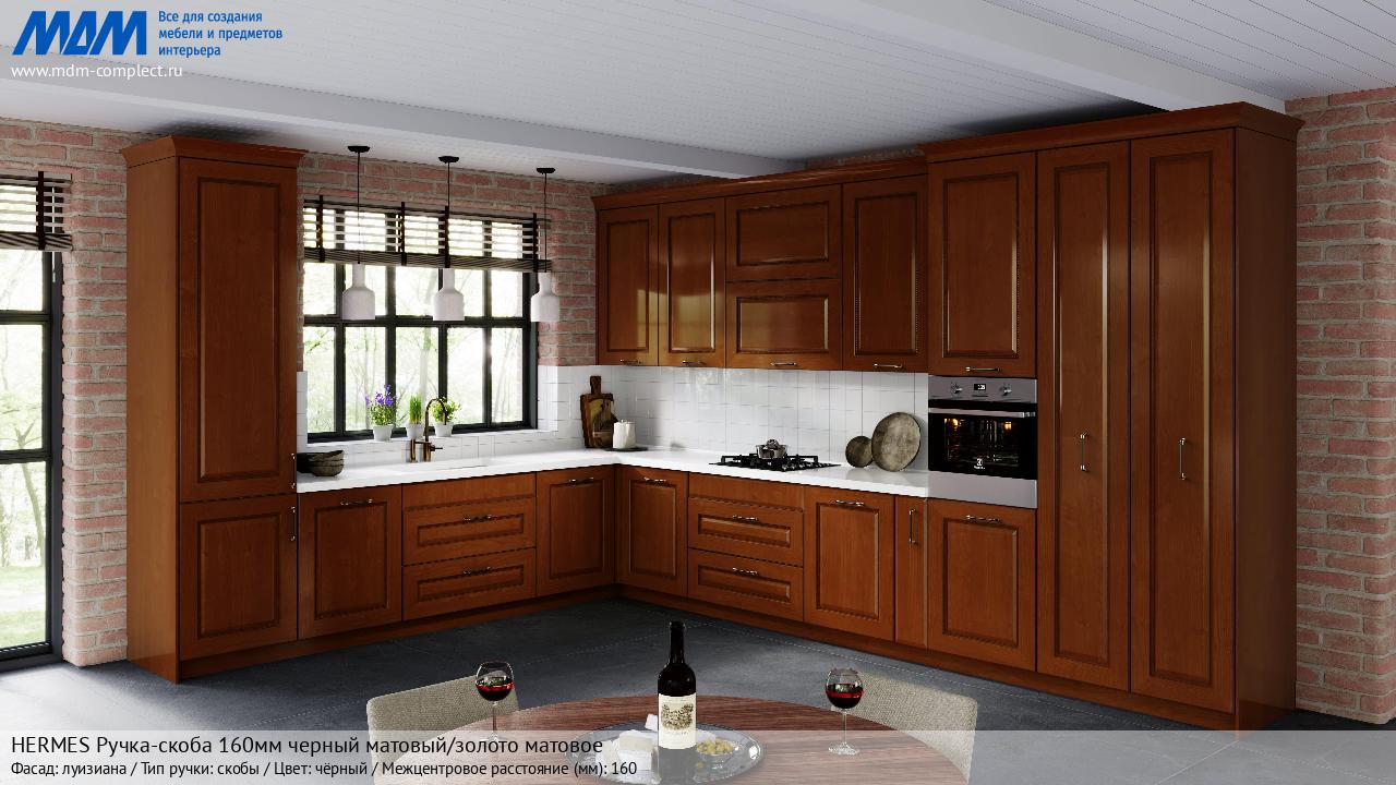 Мебельная HERMES Ручка-скоба 160мм черный матовый/золото матовое на различных фасадах в кухонном интерьере в стиле классика, лофт, модерн.