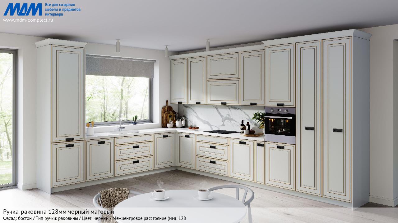 Мебельная Ручка-раковина 128мм черный матовый на различных фасадах в кухонном интерьере в стиле классика, лофт, модерн.