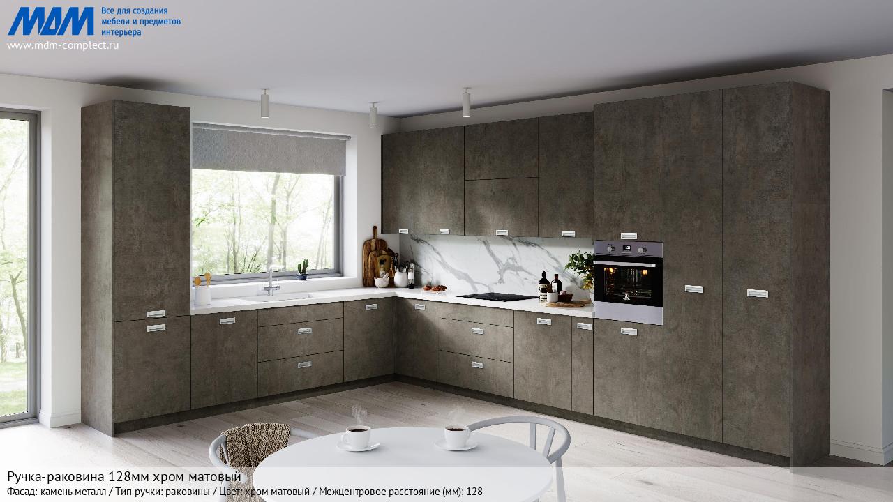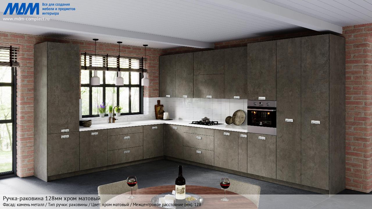Мебельная Ручка-раковина 128мм хром матовый на различных фасадах в кухонном интерьере в стиле классика, лофт, модерн.
