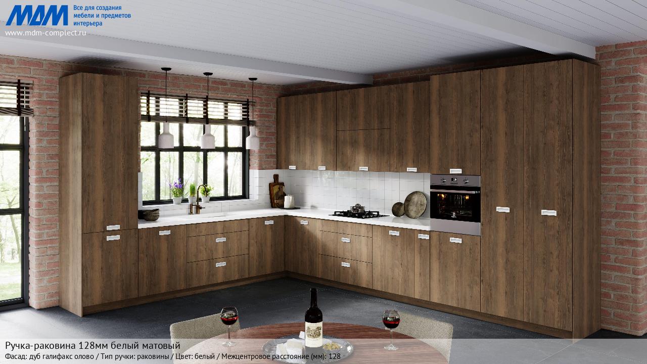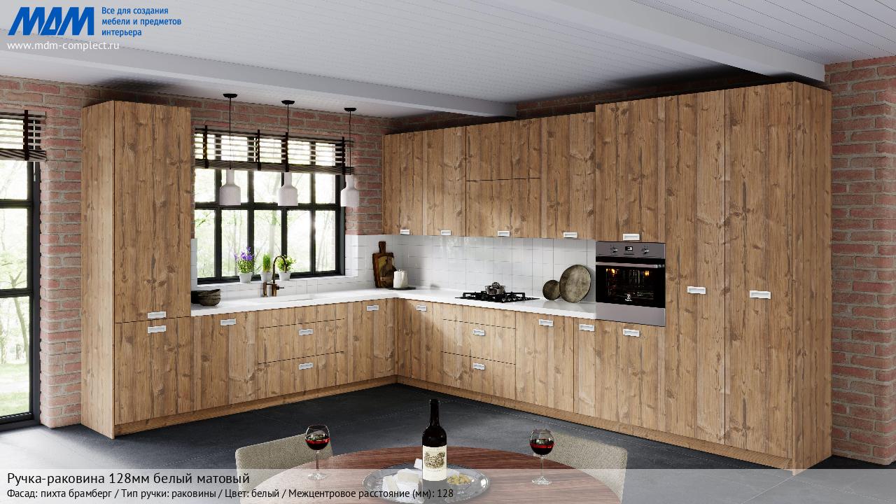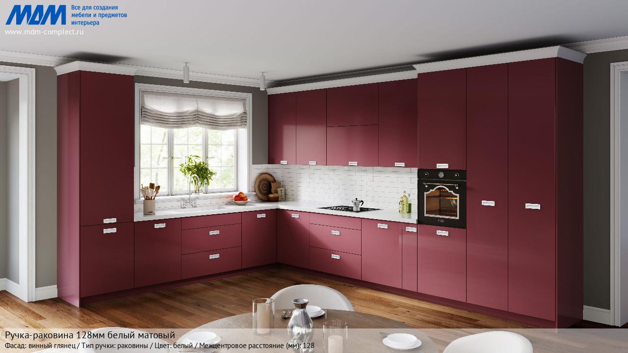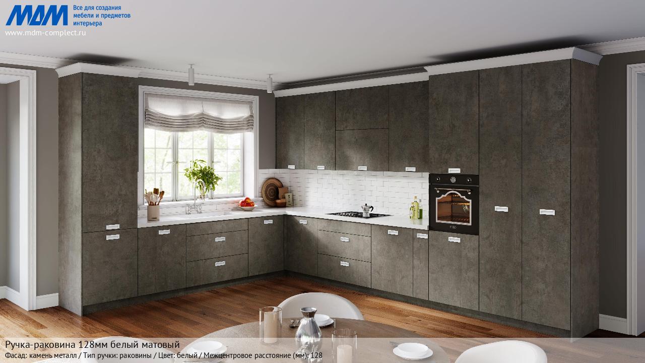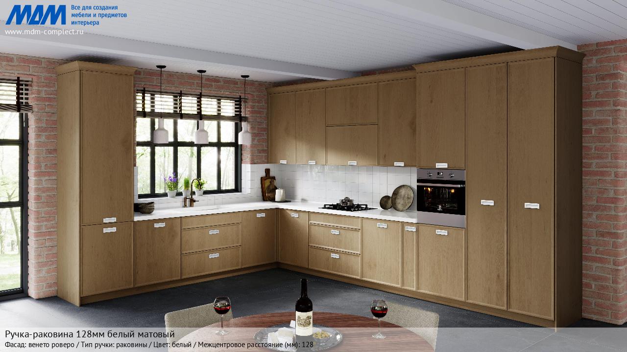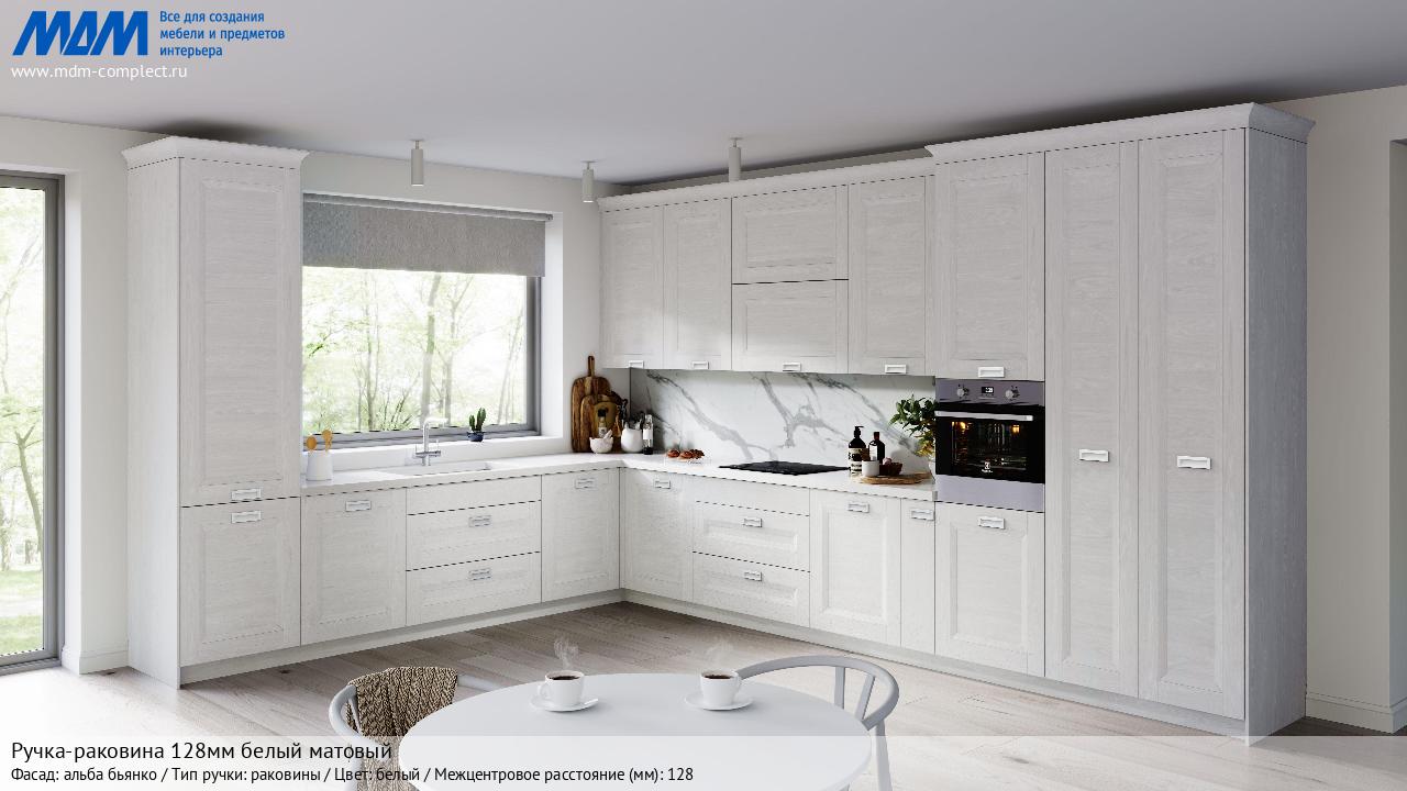 Мебельная Ручка-раковина 128мм белый матовый на различных фасадах в кухонном интерьере в стиле классика, лофт, модерн.