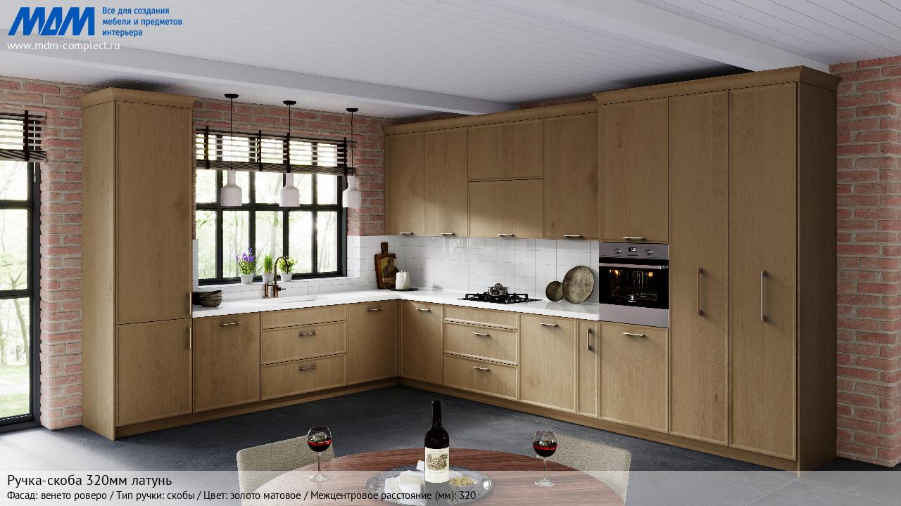 Мебельная Ручка-скоба 320мм латунь на различных фасадах в кухонном интерьере в стиле классика, лофт, модерн.
