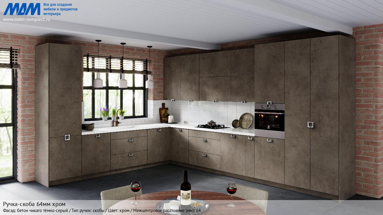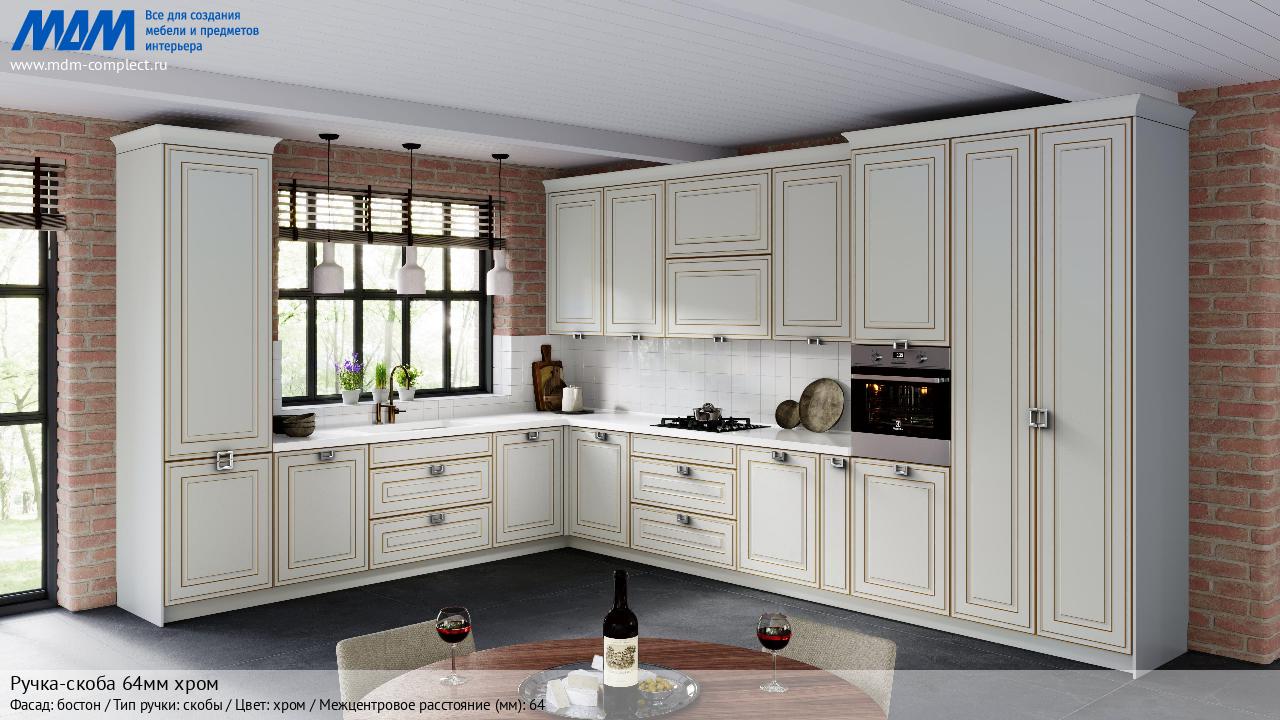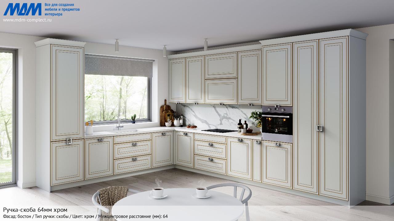 Мебельная Ручка-скоба 64мм хром на различных фасадах в кухонном интерьере в стиле классика, лофт, модерн.