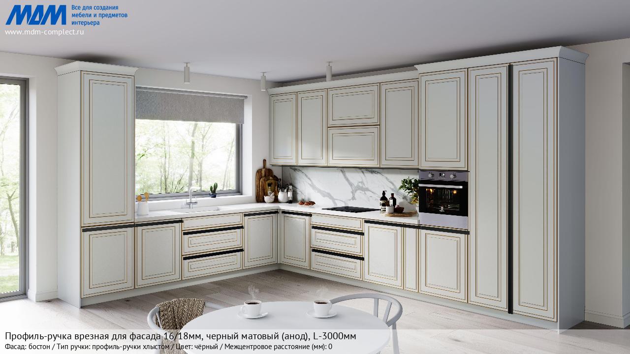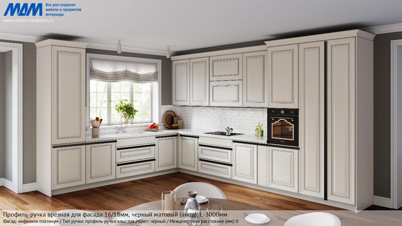Мебельная Профиль-ручка врезная для фасада 16/18мм, черный матовый (анод), L-3000мм на различных фасадах в кухонном интерьере в стиле классика, лофт, модерн.