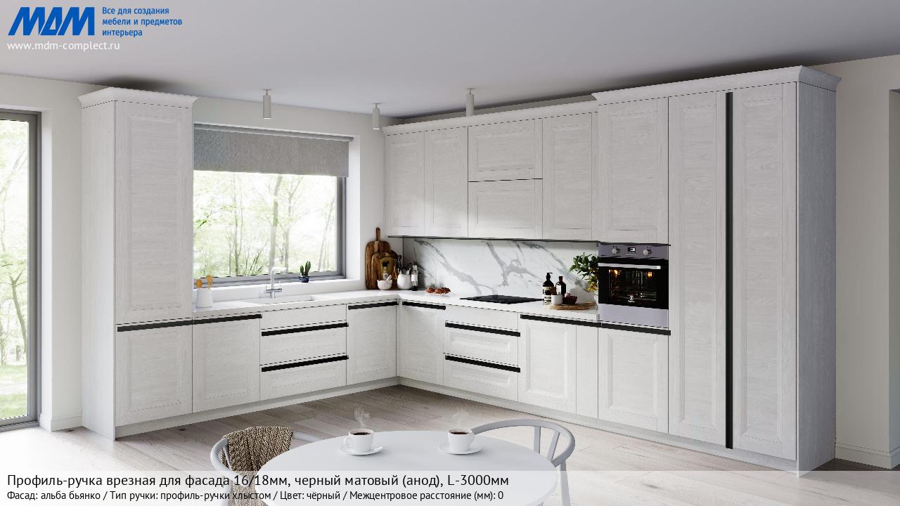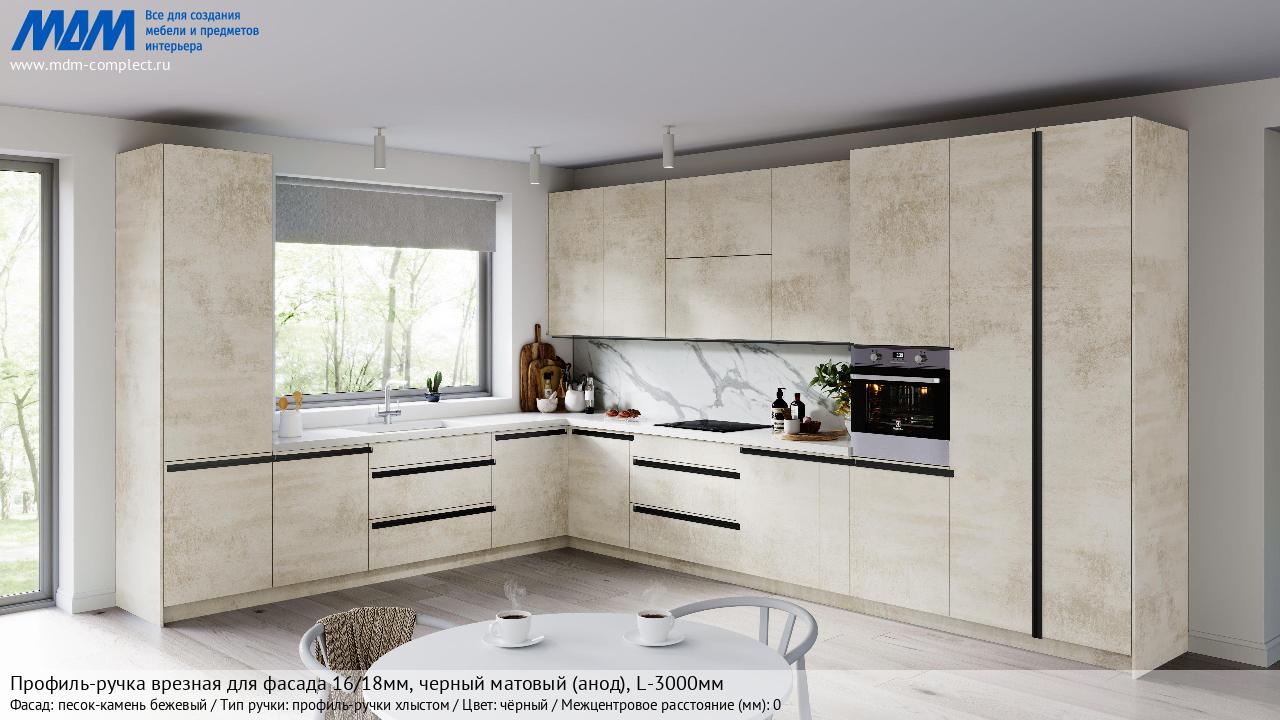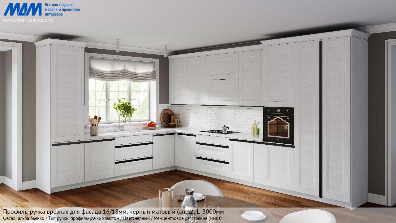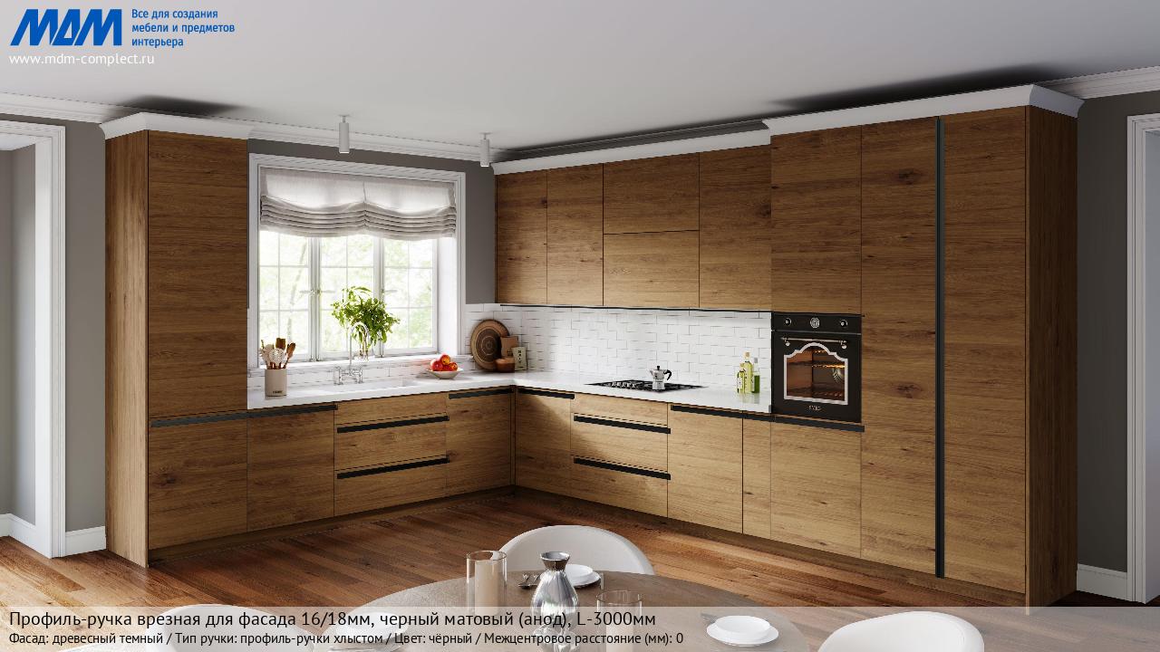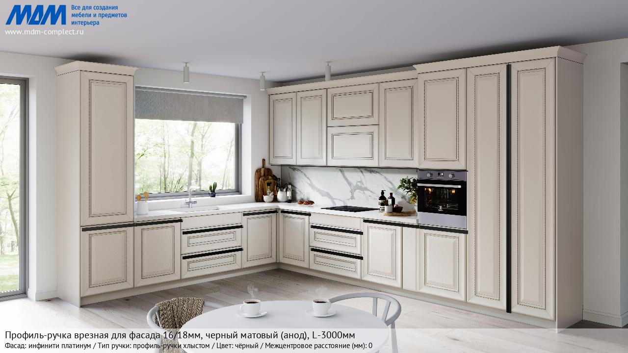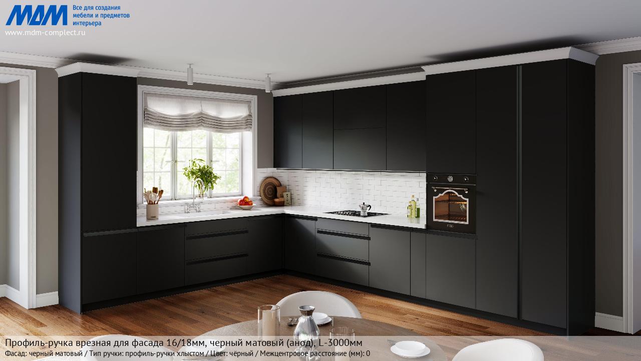 Мебельная Профиль-ручка врезная для фасада 16/18мм, черный матовый (анод), L-3000мм на различных фасадах в кухонном интерьере в стиле классика, лофт, модерн.