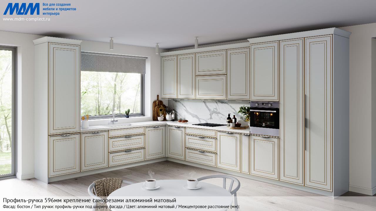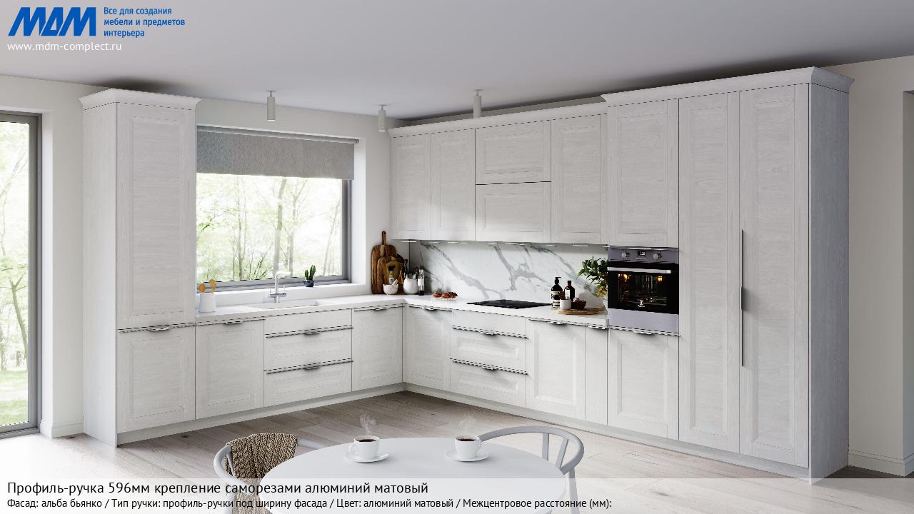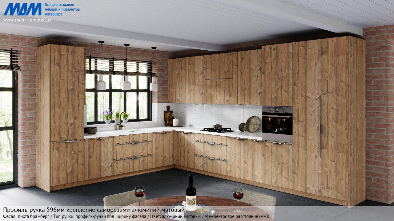 Мебельная Профиль-ручка 596мм крепление саморезами алюминий матовый на различных фасадах в кухонном интерьере в стиле классика, лофт, модерн.