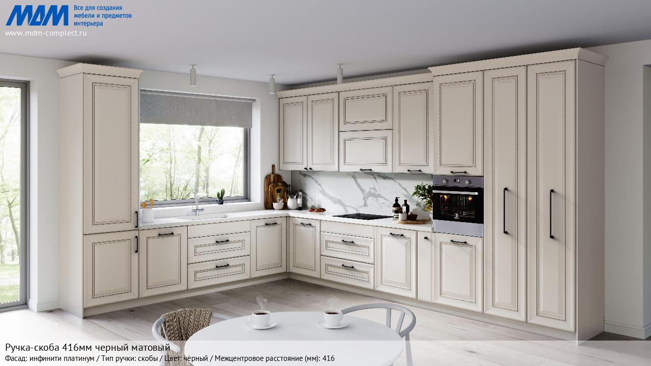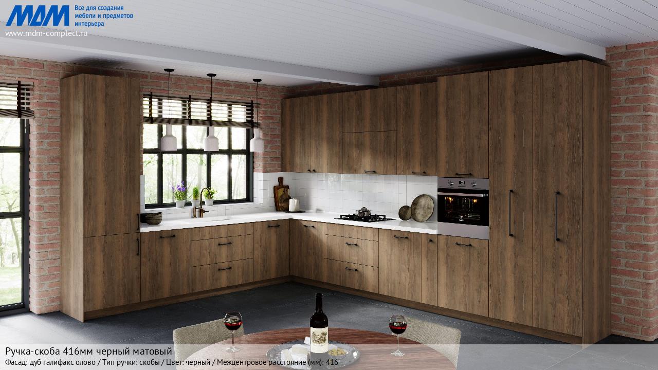 Мебельная Ручка-скоба 416мм черный матовый на различных фасадах в кухонном интерьере в стиле классика, лофт, модерн.