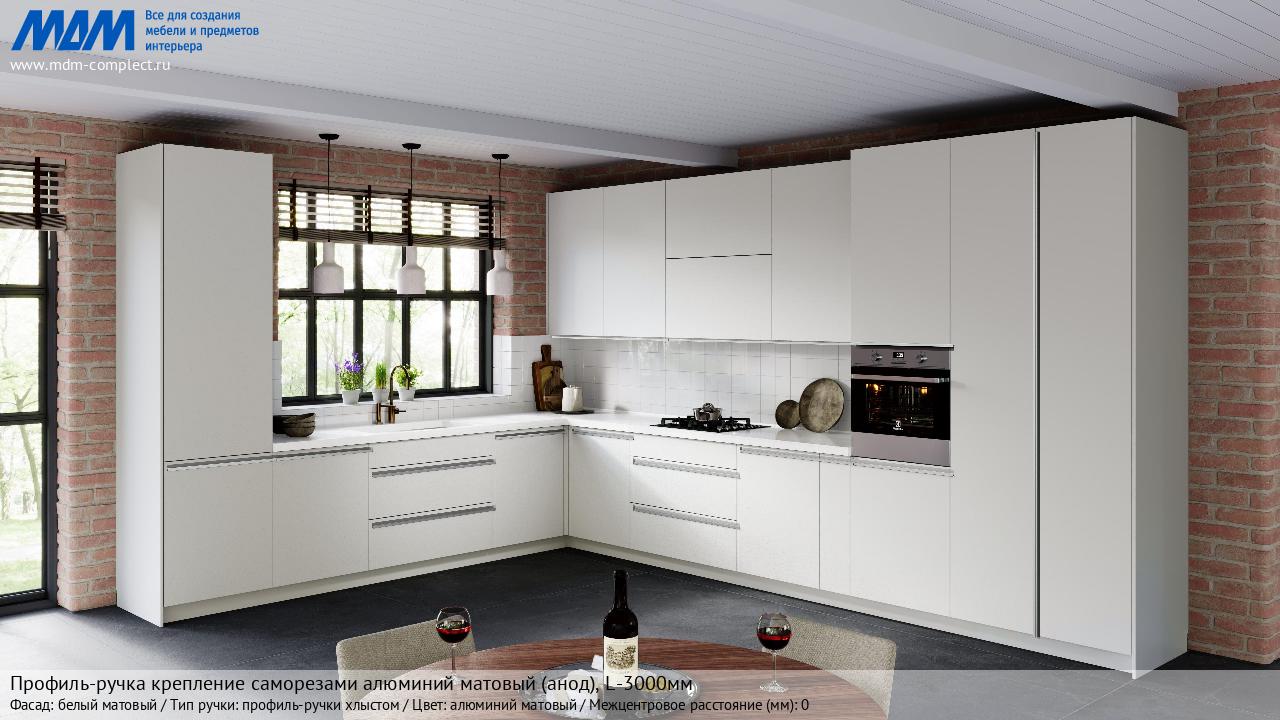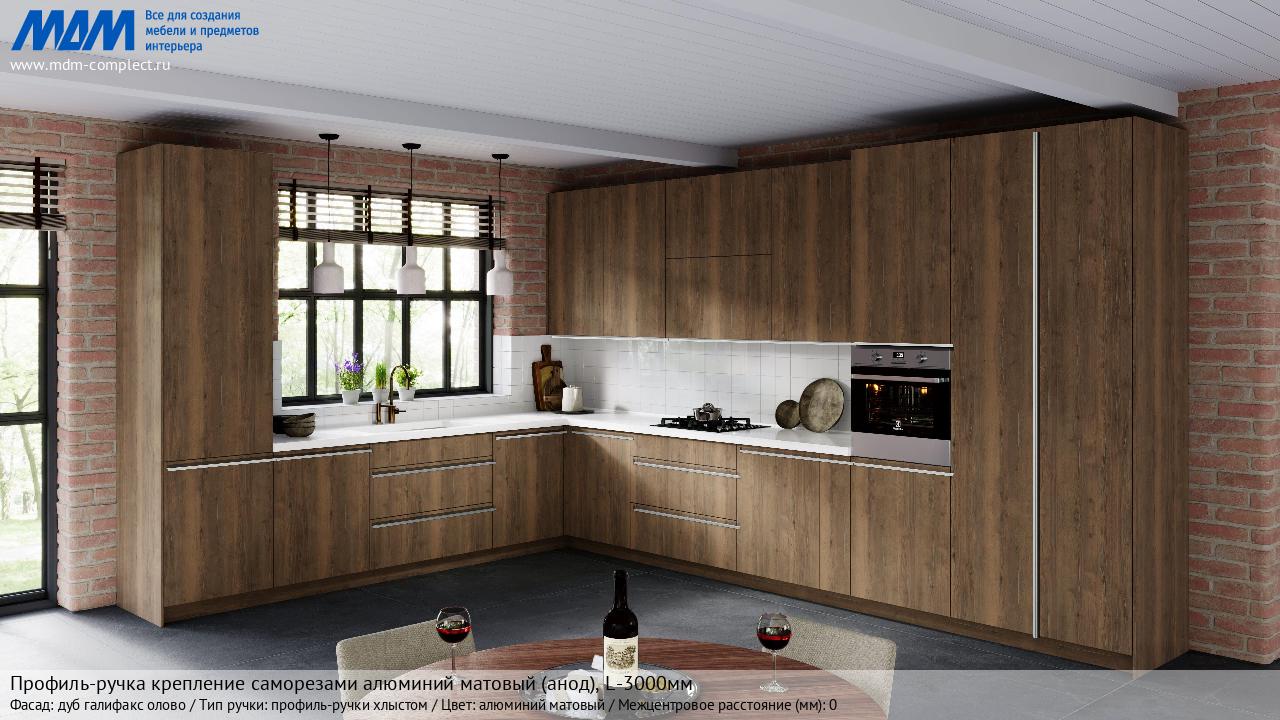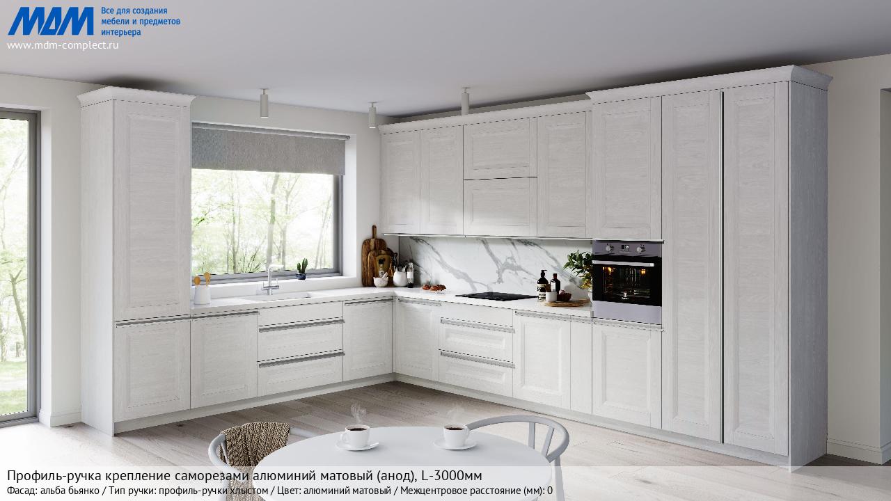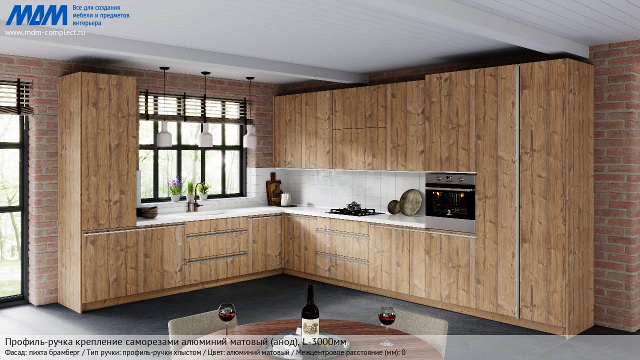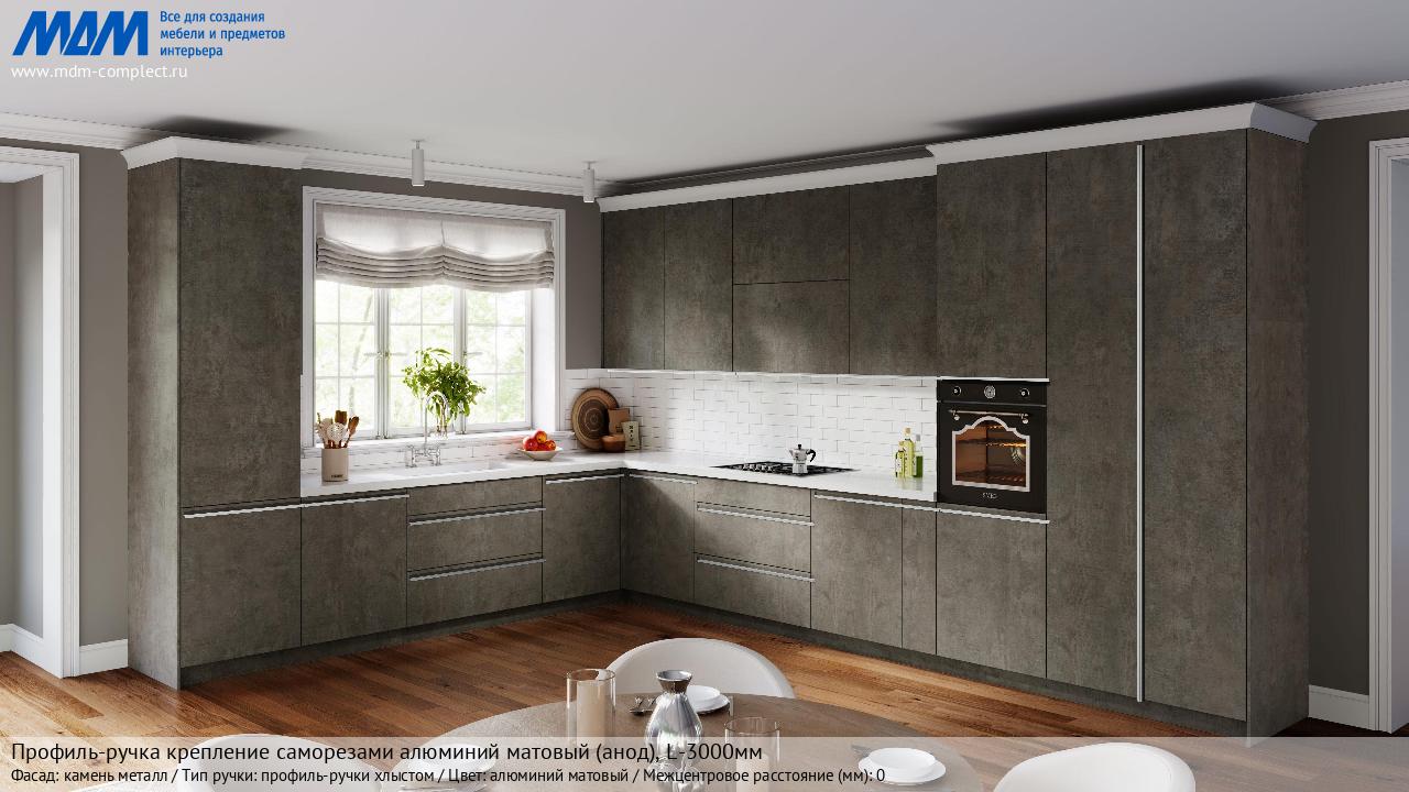 Мебельная Профиль-ручка крепление саморезами алюминий матовый (анод), L-3000мм на различных фасадах в кухонном интерьере в стиле классика, лофт, модерн.