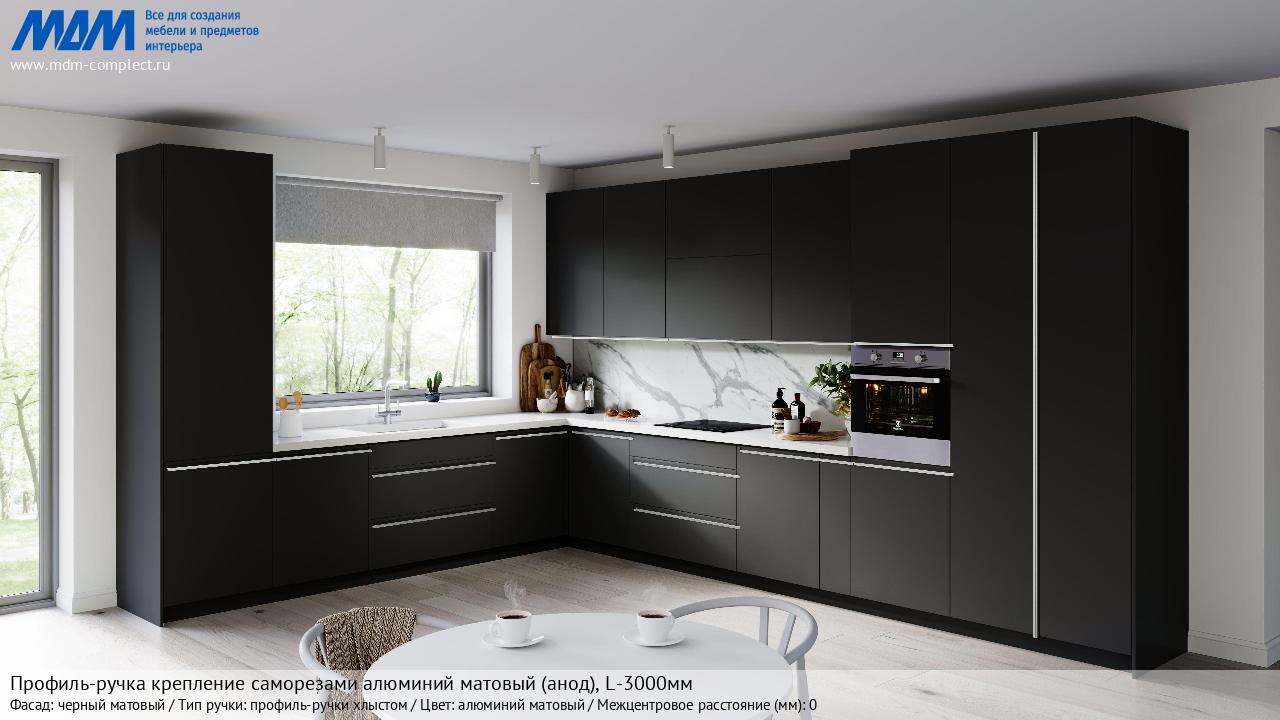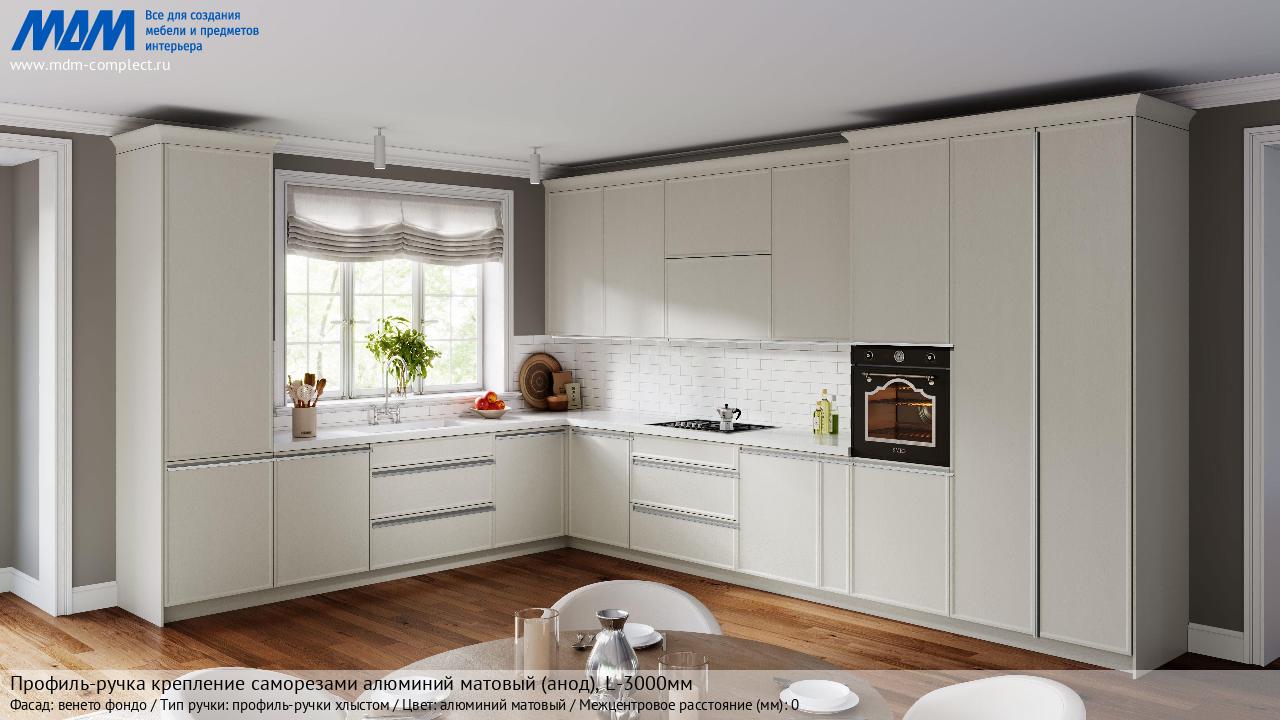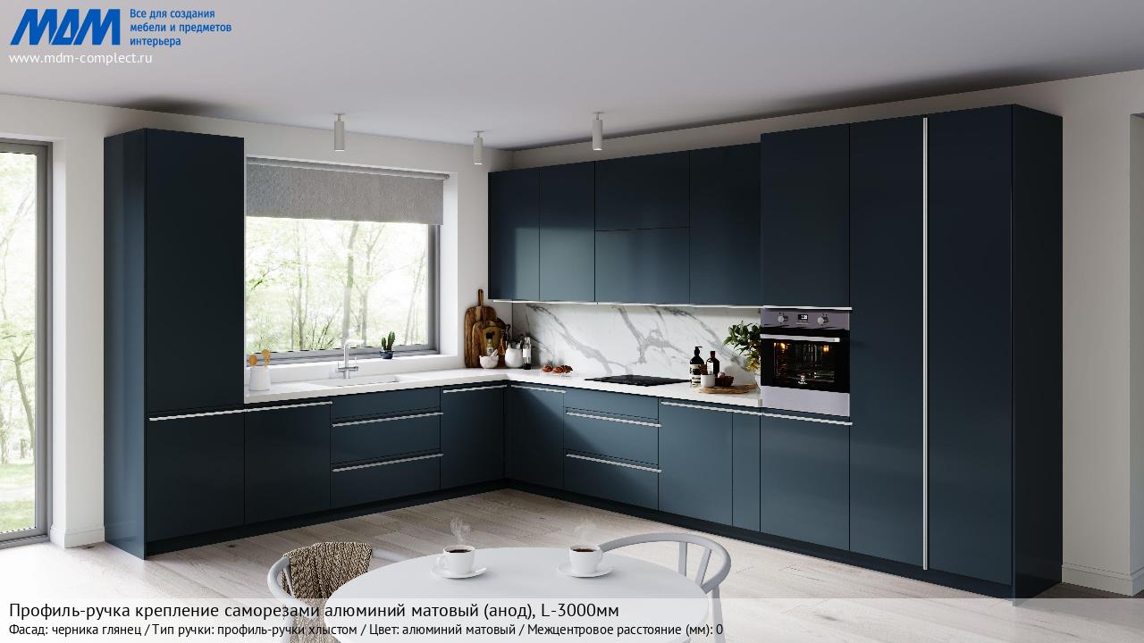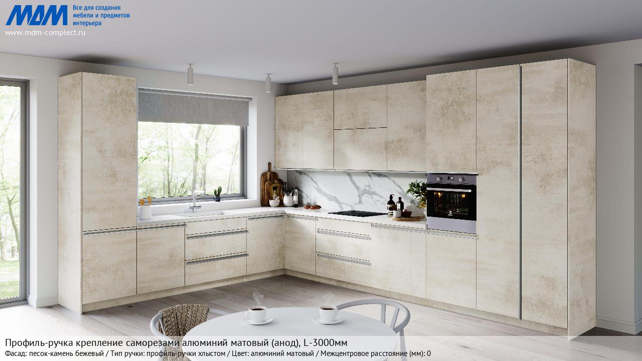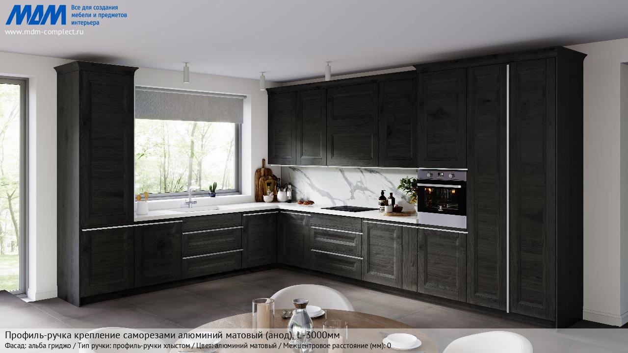 Мебельная Профиль-ручка крепление саморезами алюминий матовый (анод), L-3000мм на различных фасадах в кухонном интерьере в стиле классика, лофт, модерн.