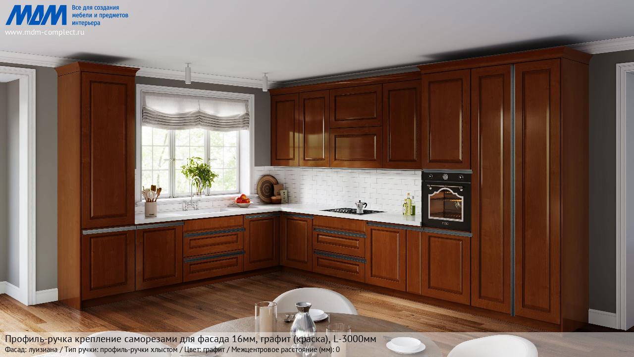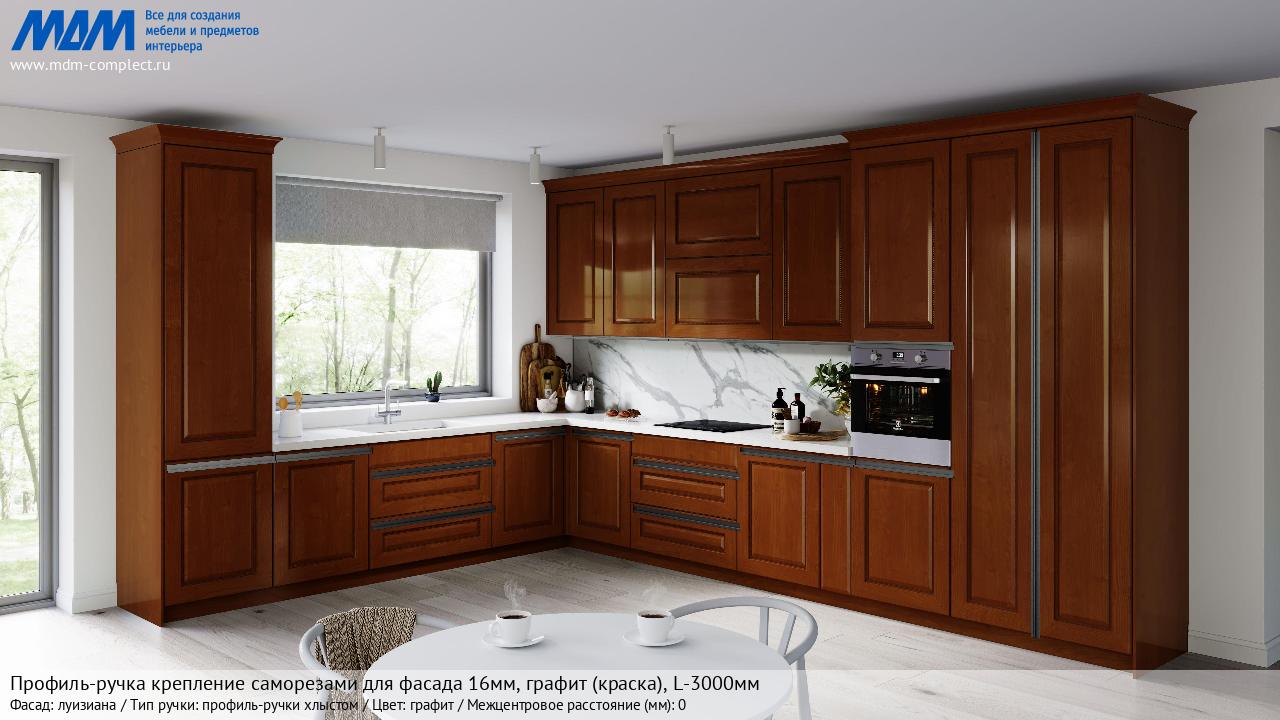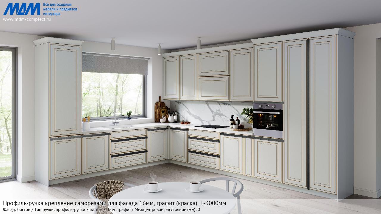 Мебельная Профиль-ручка крепление саморезами для фасада 16мм, графит (краска), L-3000мм на различных фасадах в кухонном интерьере в стиле классика, лофт, модерн.