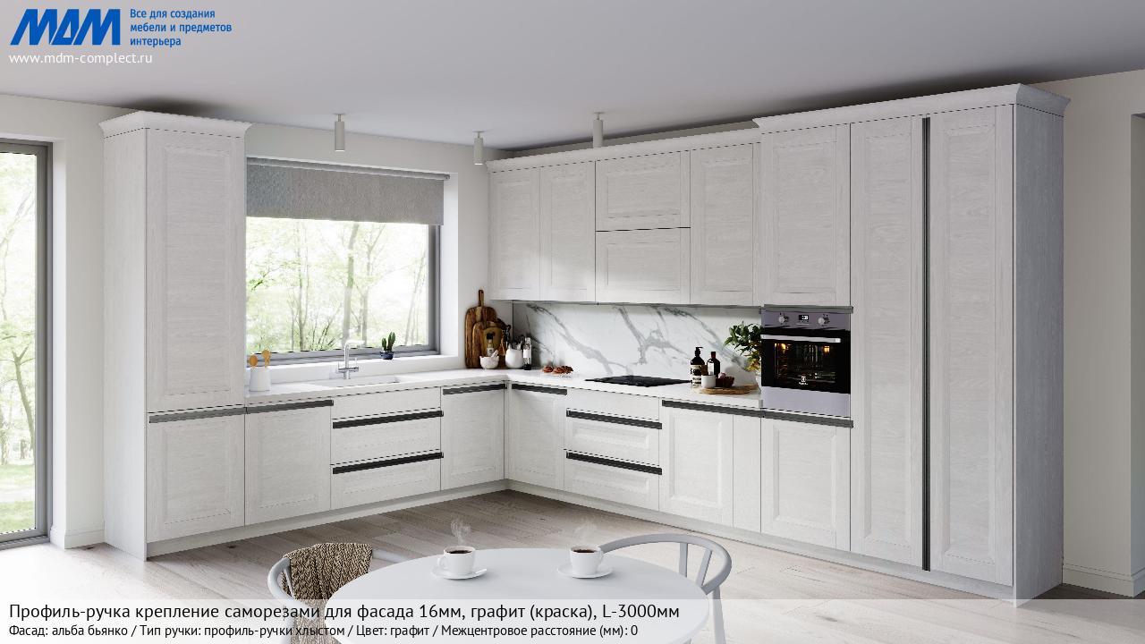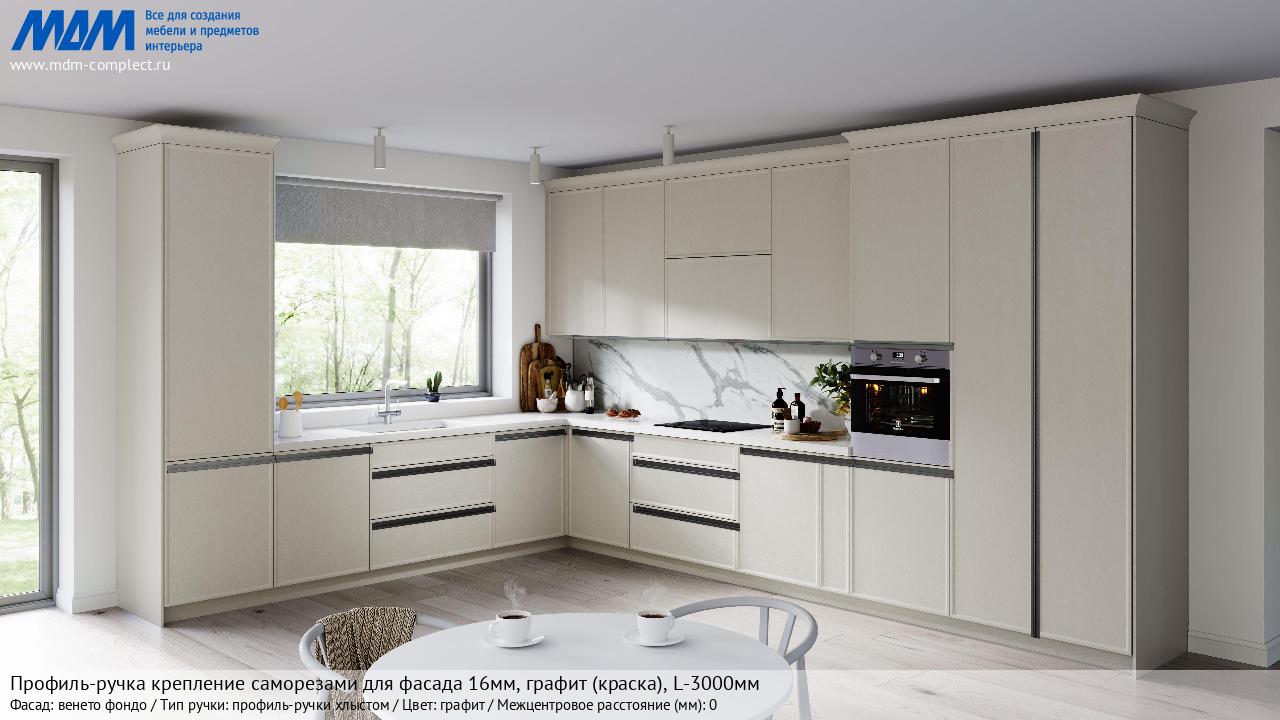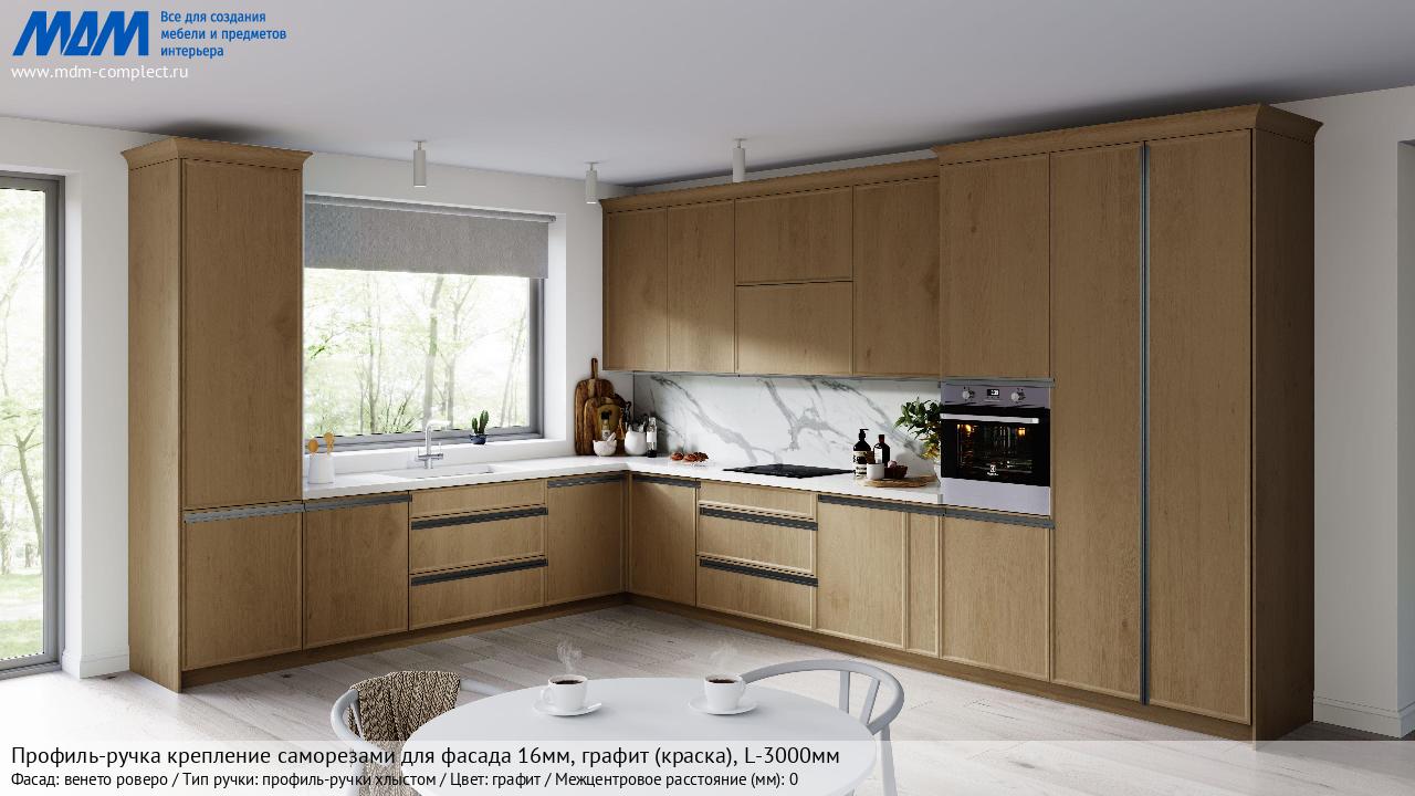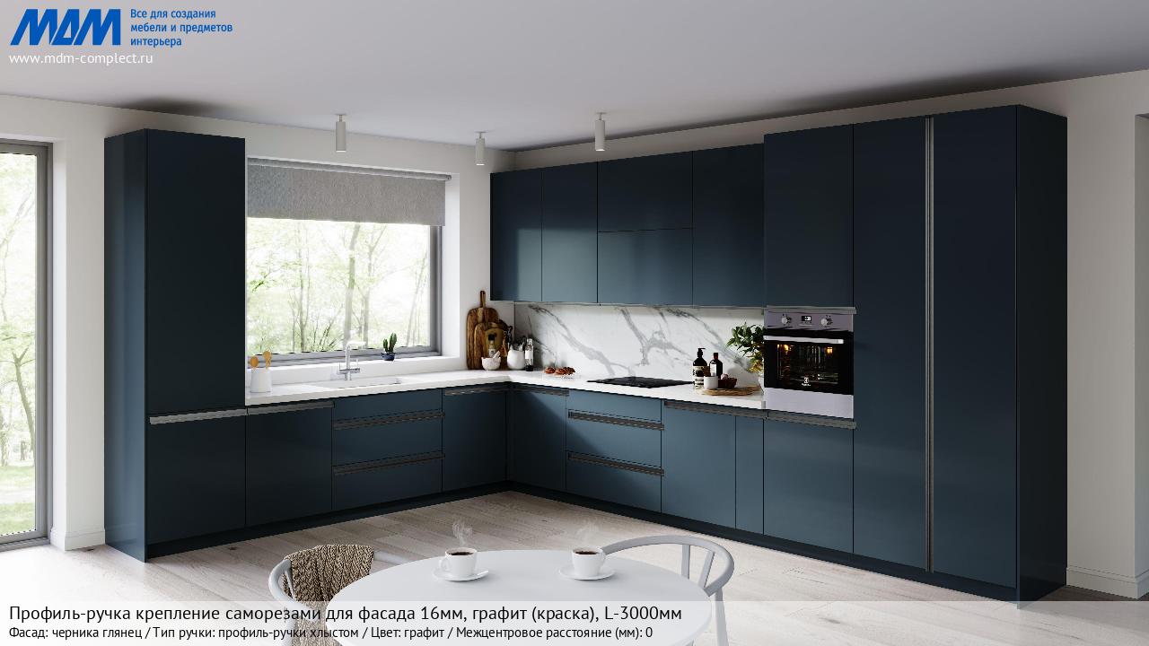 Мебельная Профиль-ручка крепление саморезами для фасада 16мм, графит (краска), L-3000мм на различных фасадах в кухонном интерьере в стиле классика, лофт, модерн.