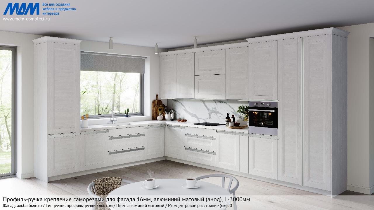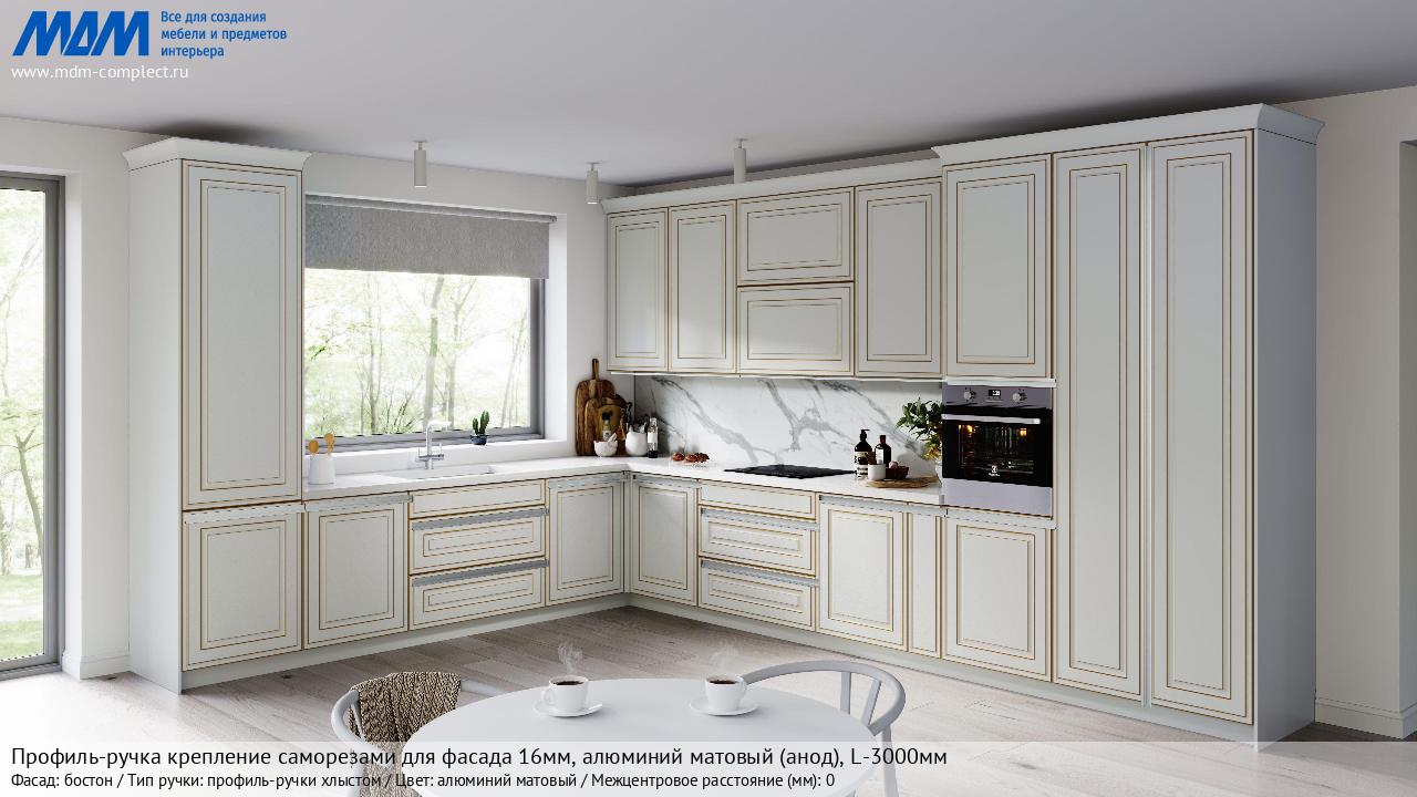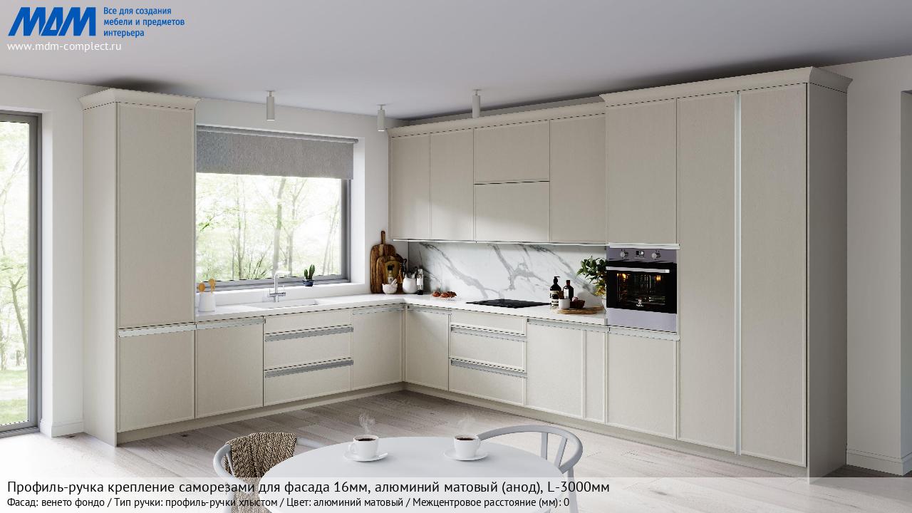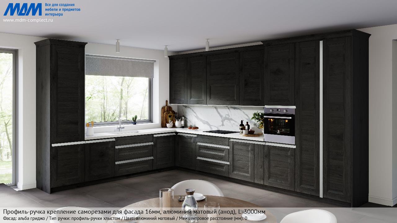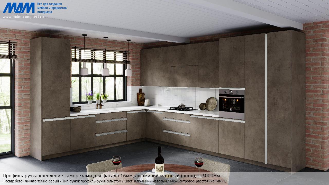 Мебельная Профиль-ручка крепление саморезами для фасада 16мм, алюминий матовый (анод), L-3000мм на различных фасадах в кухонном интерьере в стиле классика, лофт, модерн.