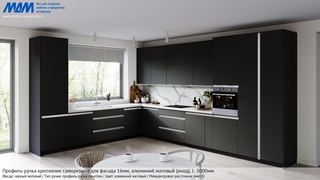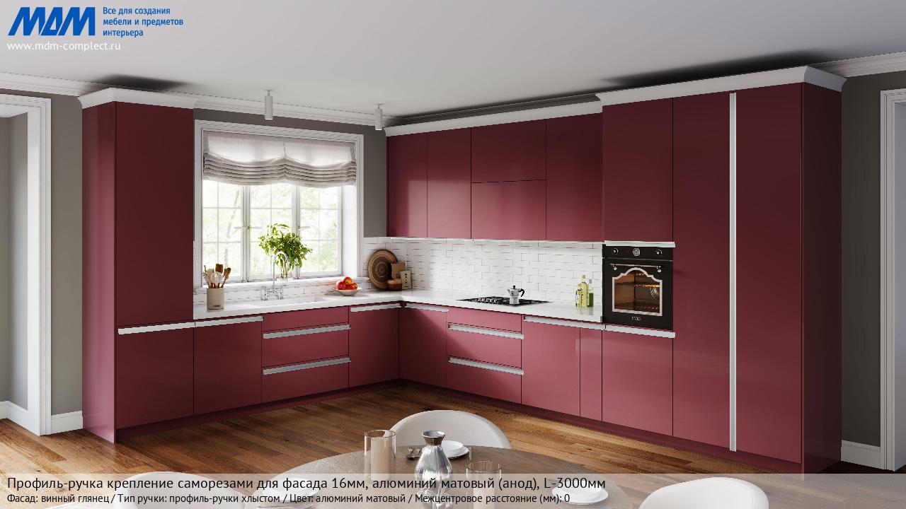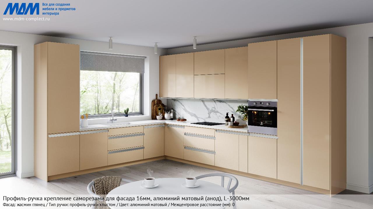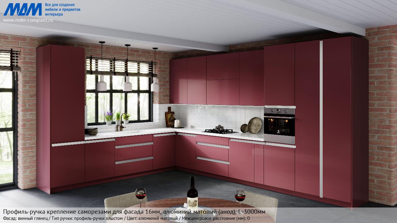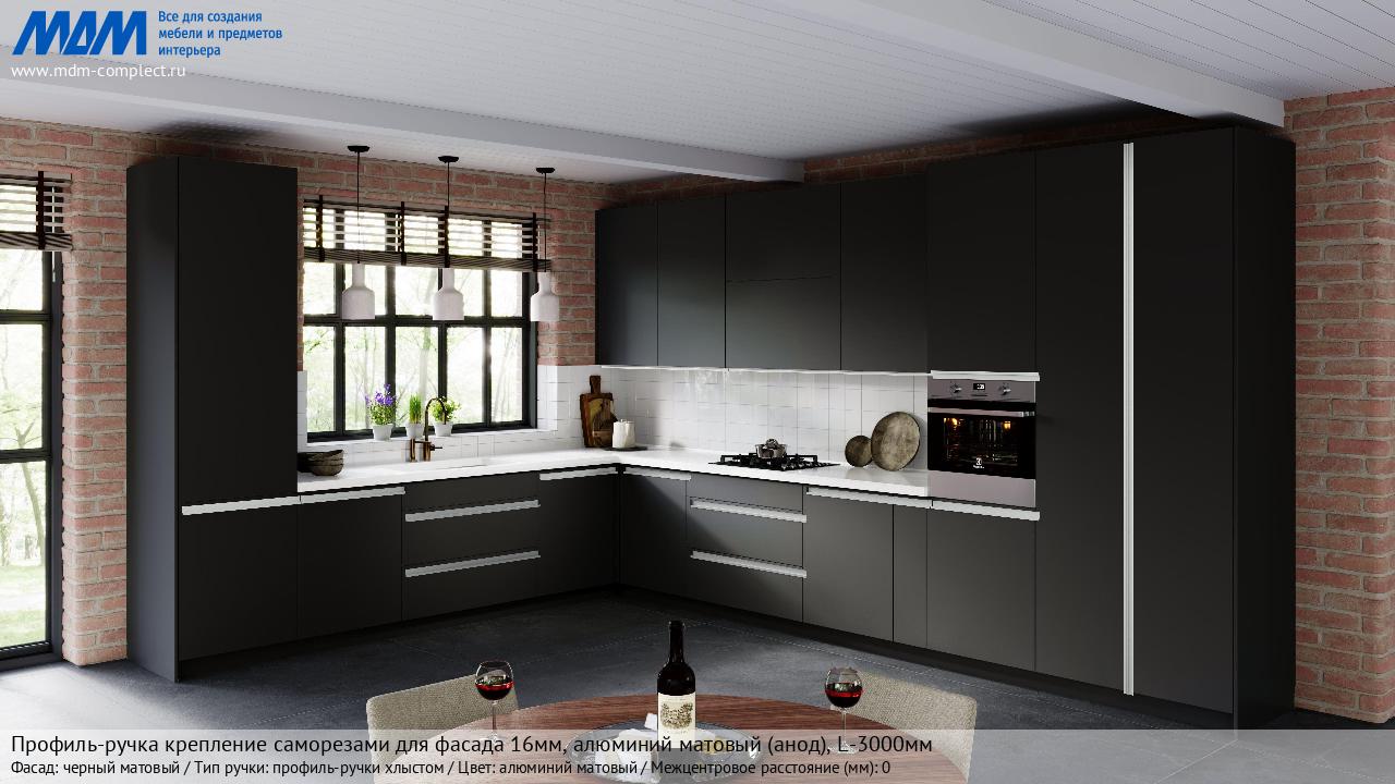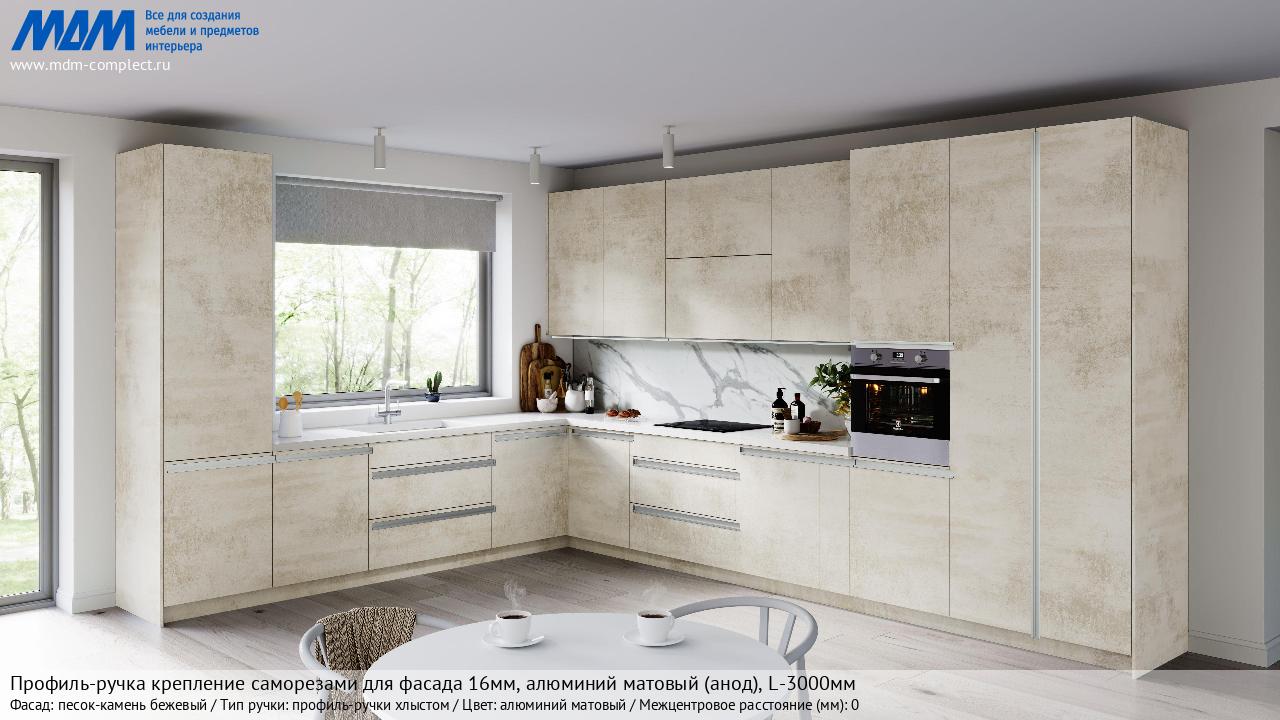 Мебельная Профиль-ручка крепление саморезами для фасада 16мм, алюминий матовый (анод), L-3000мм на различных фасадах в кухонном интерьере в стиле классика, лофт, модерн.