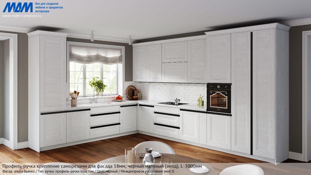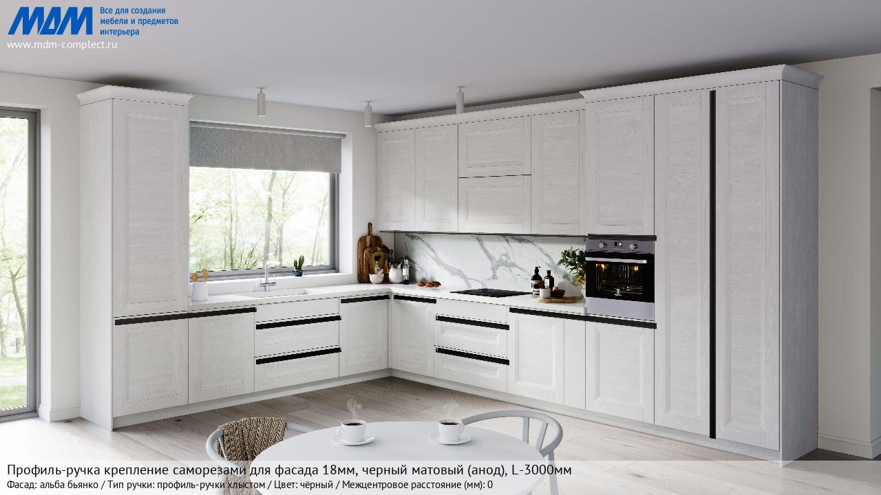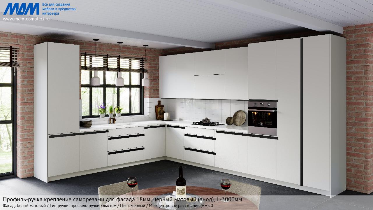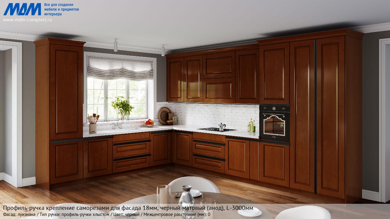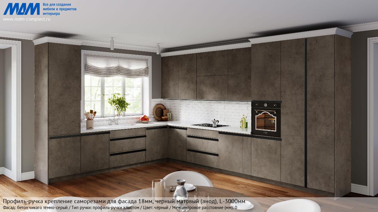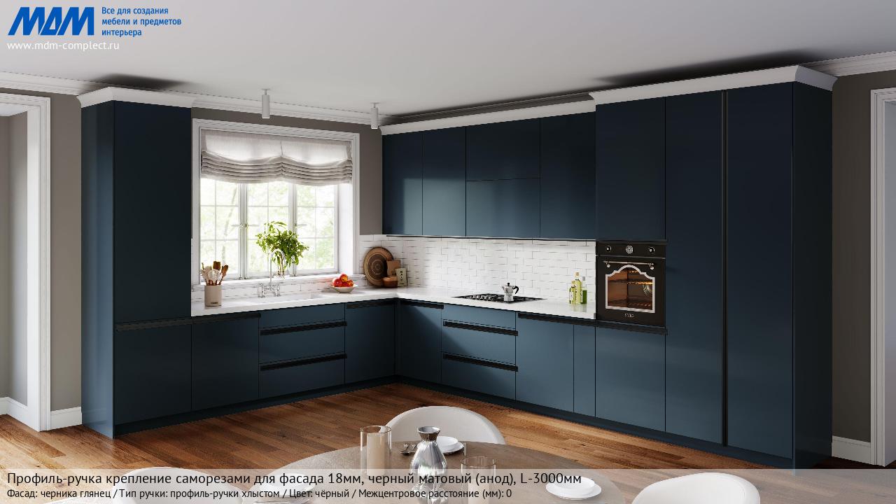 Мебельная Профиль-ручка крепление саморезами для фасада 18мм, черный матовый (анод), L-3000мм на различных фасадах в кухонном интерьере в стиле классика, лофт, модерн.