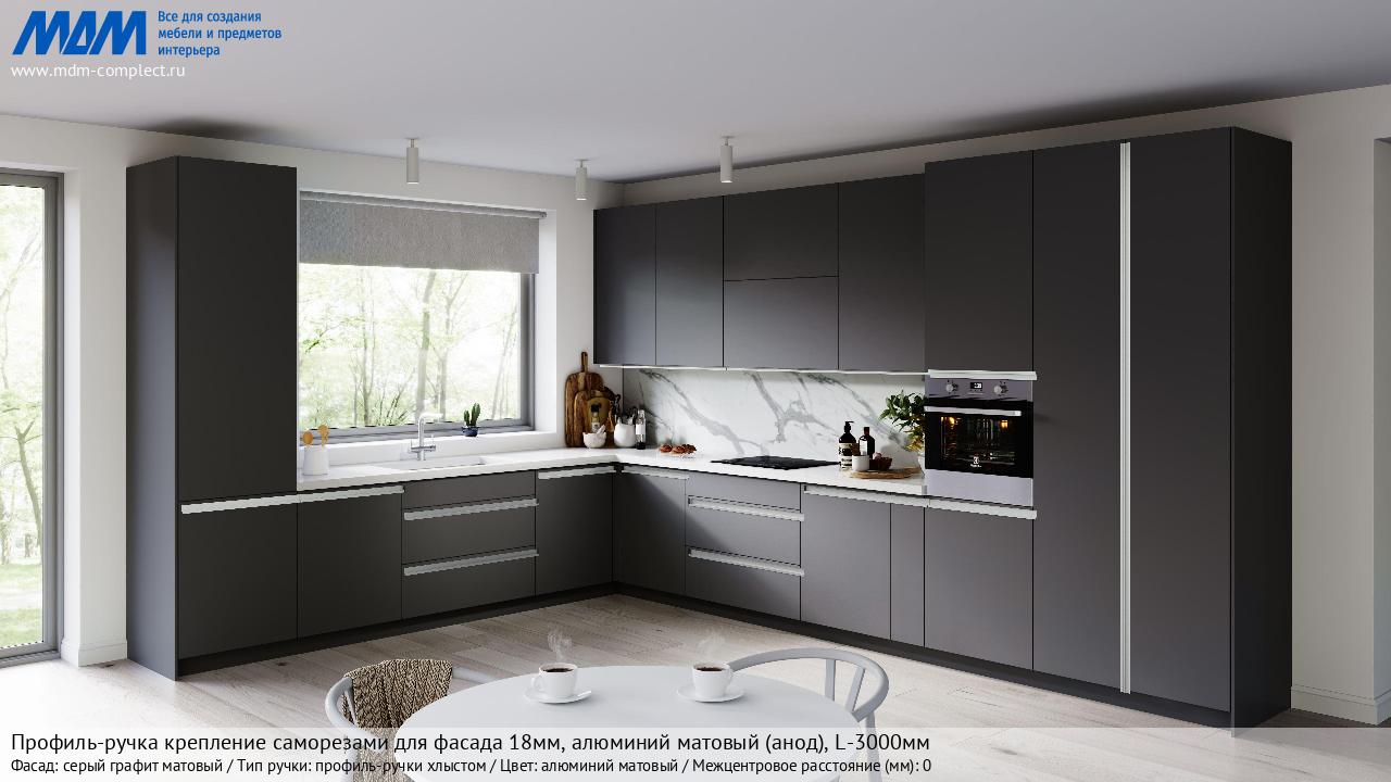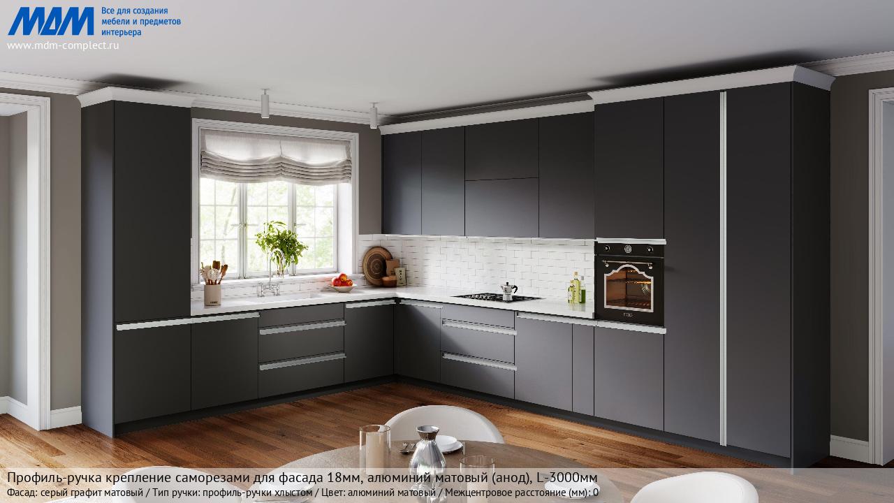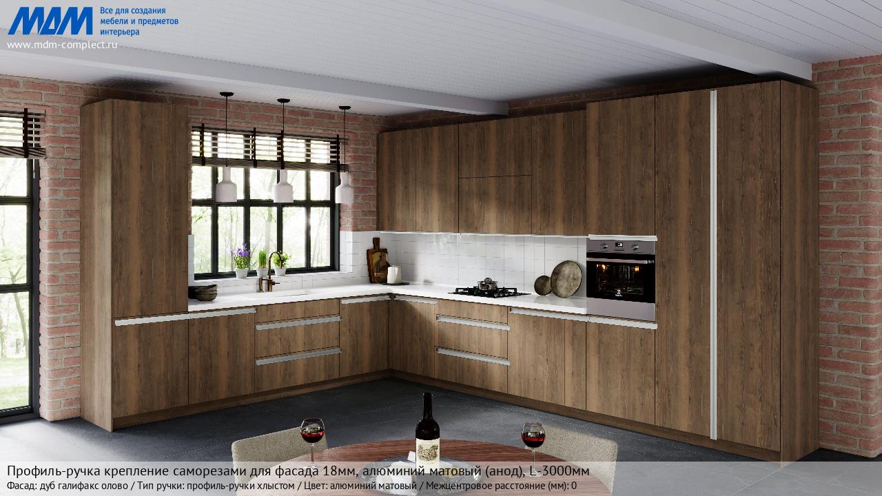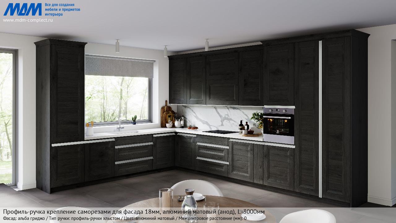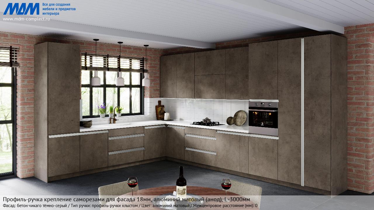 Мебельная Профиль-ручка крепление саморезами для фасада 18мм, алюминий матовый (анод), L-3000мм на различных фасадах в кухонном интерьере в стиле классика, лофт, модерн.