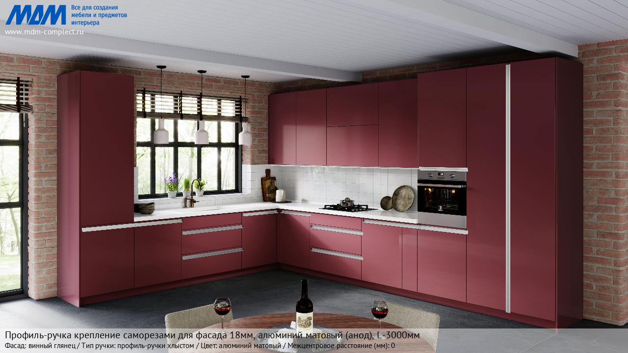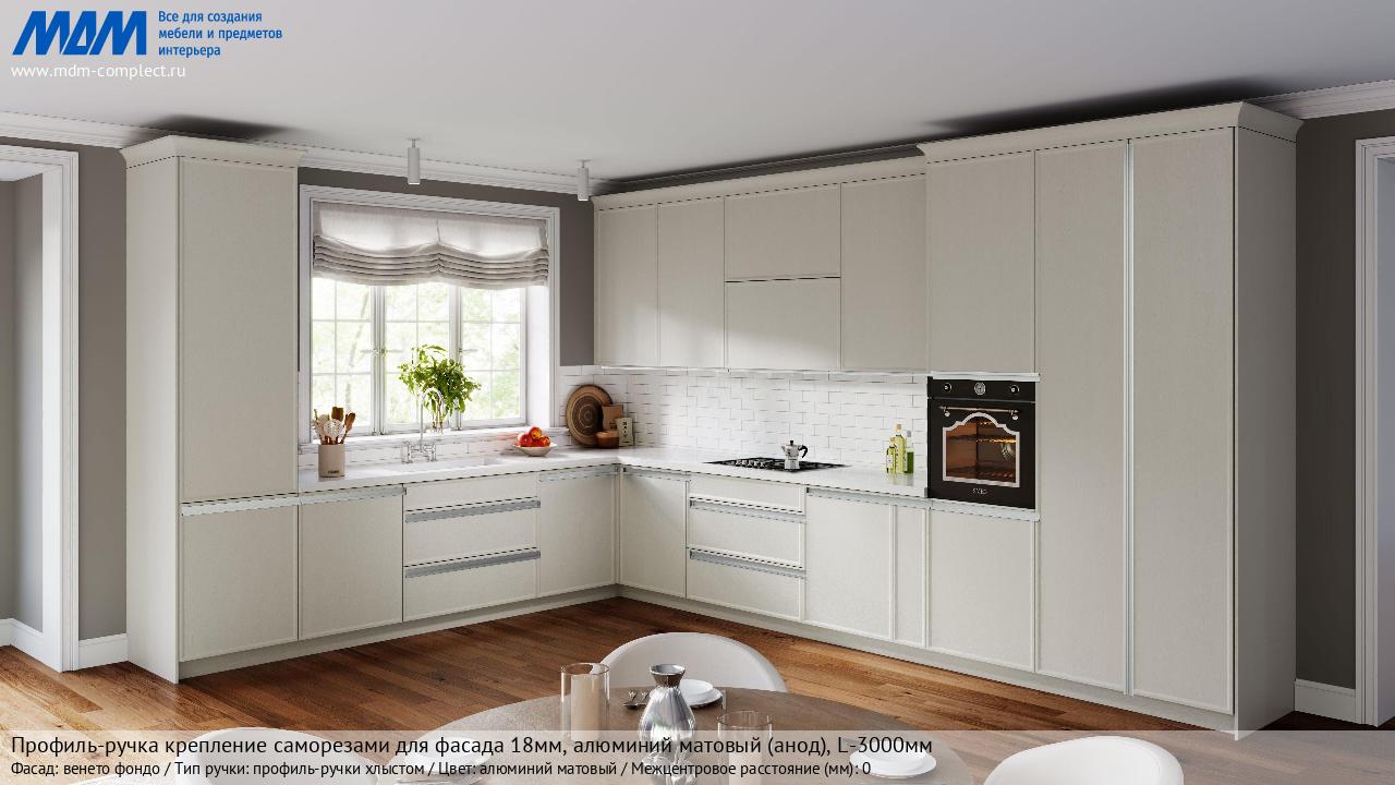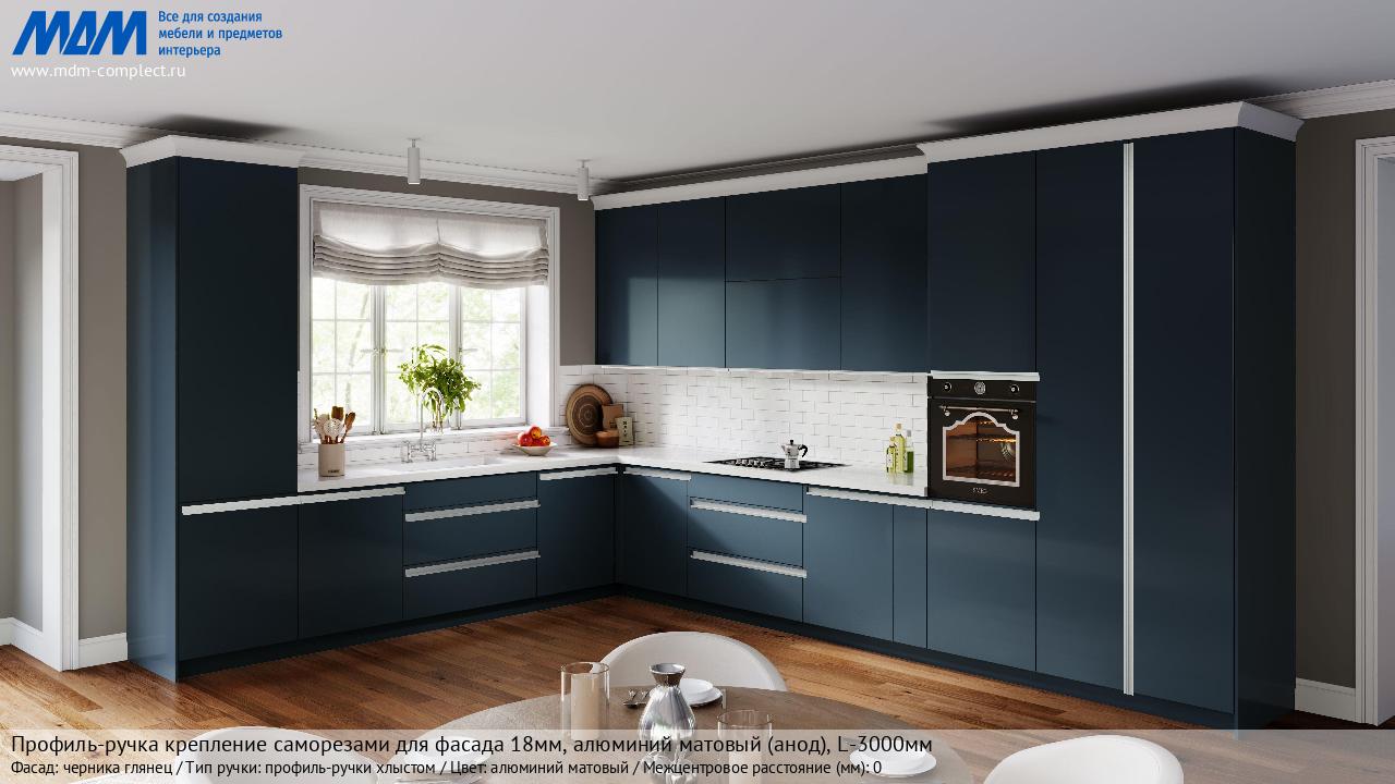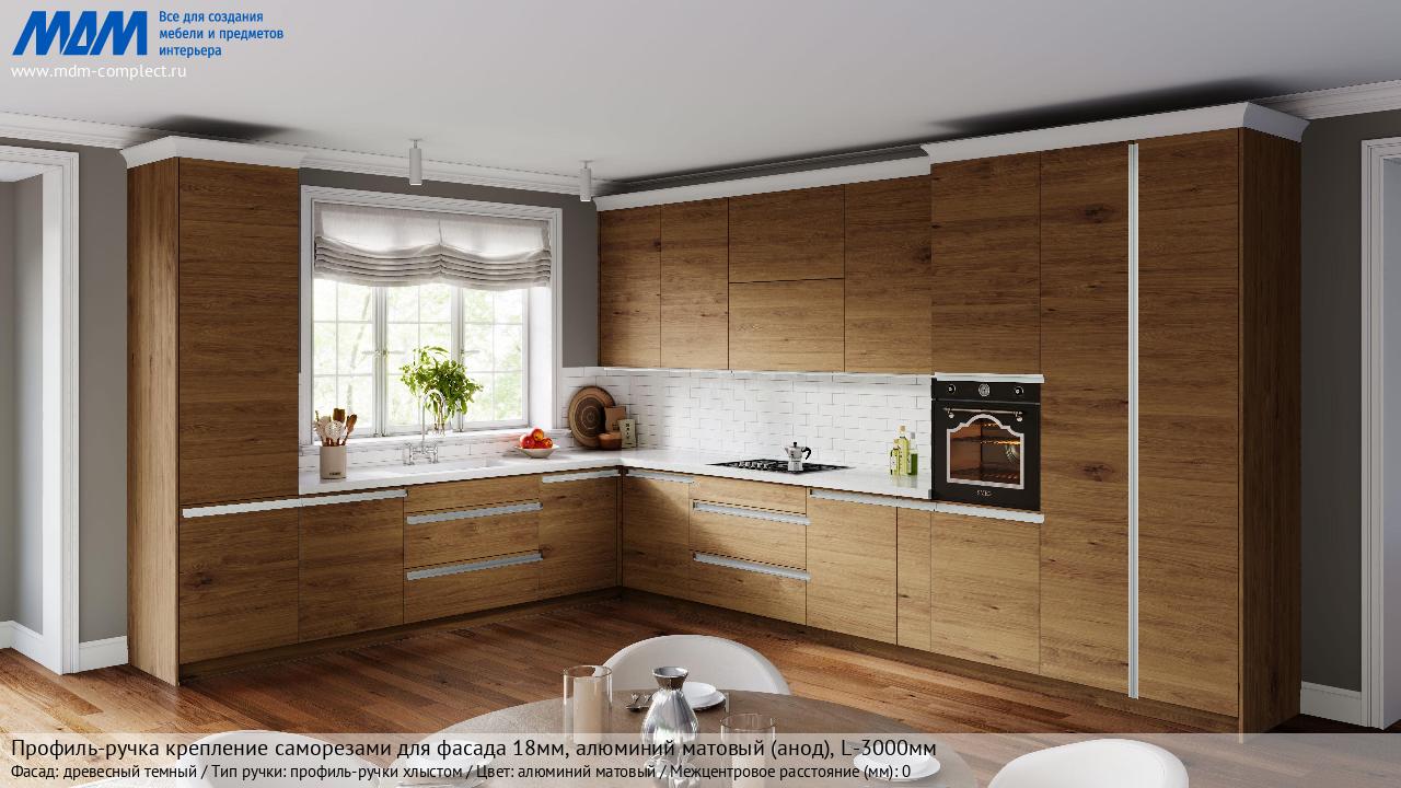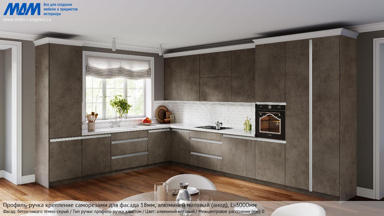 Мебельная Профиль-ручка крепление саморезами для фасада 18мм, алюминий матовый (анод), L-3000мм на различных фасадах в кухонном интерьере в стиле классика, лофт, модерн.