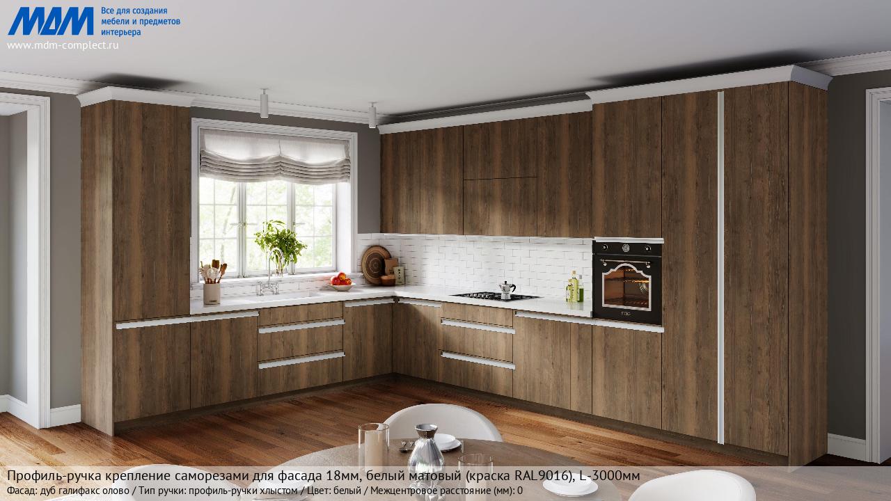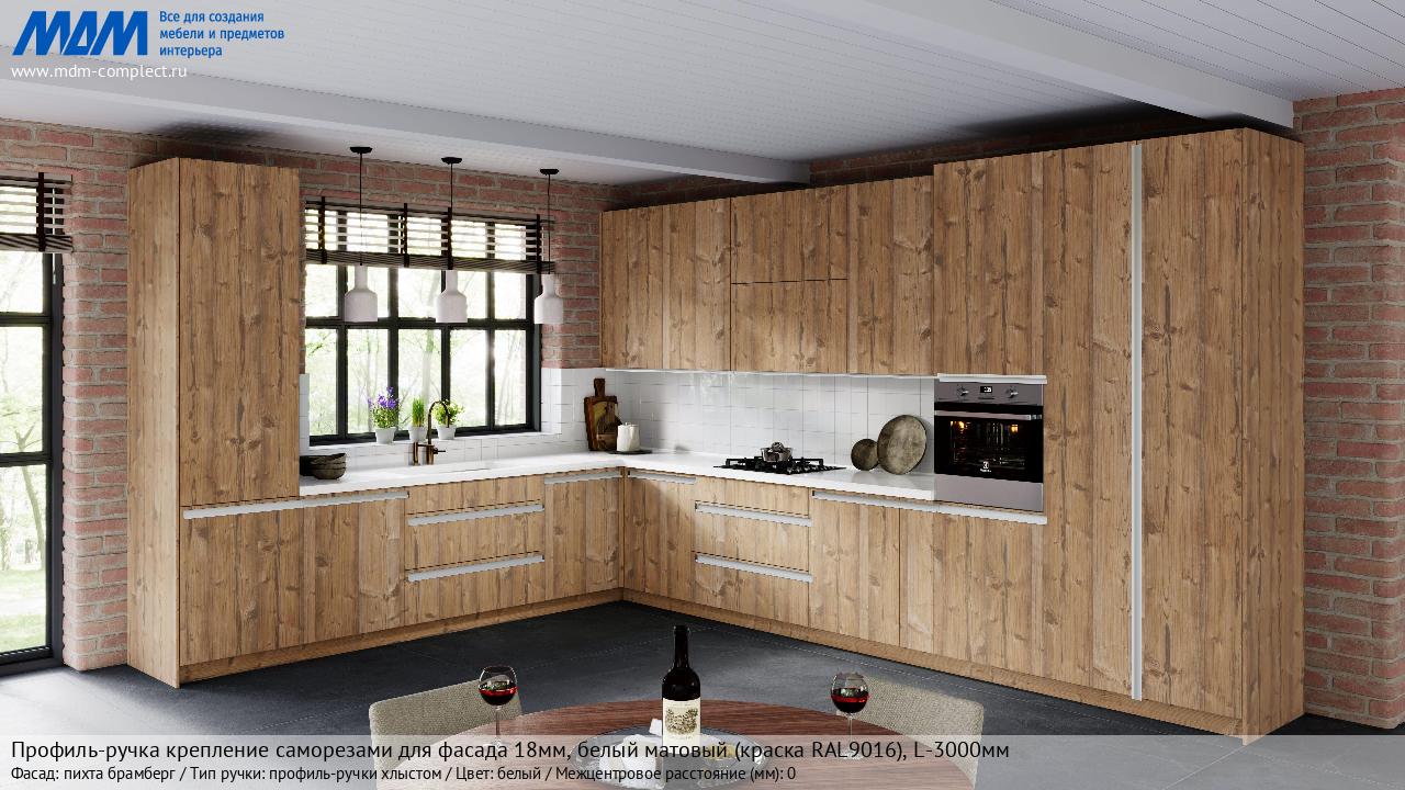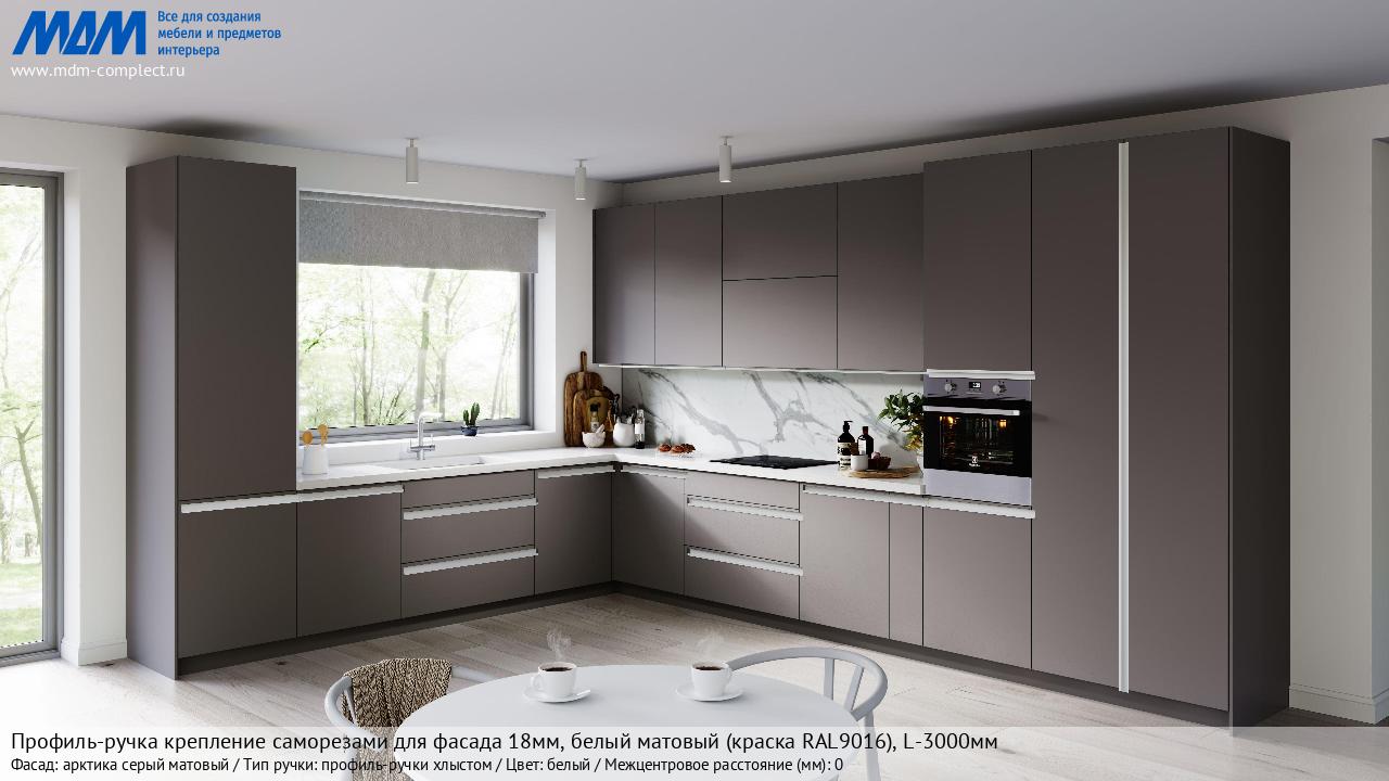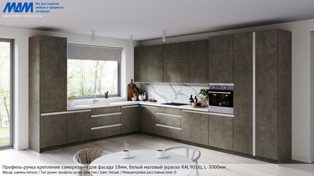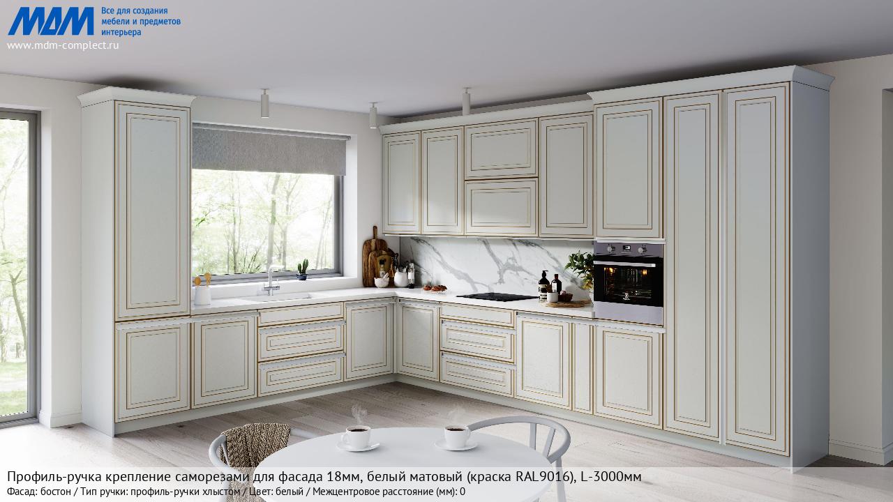 Мебельная Профиль-ручка крепление саморезами для фасада 18мм, белый матовый (краска RAL9016), L-3000мм на различных фасадах в кухонном интерьере в стиле классика, лофт, модерн.