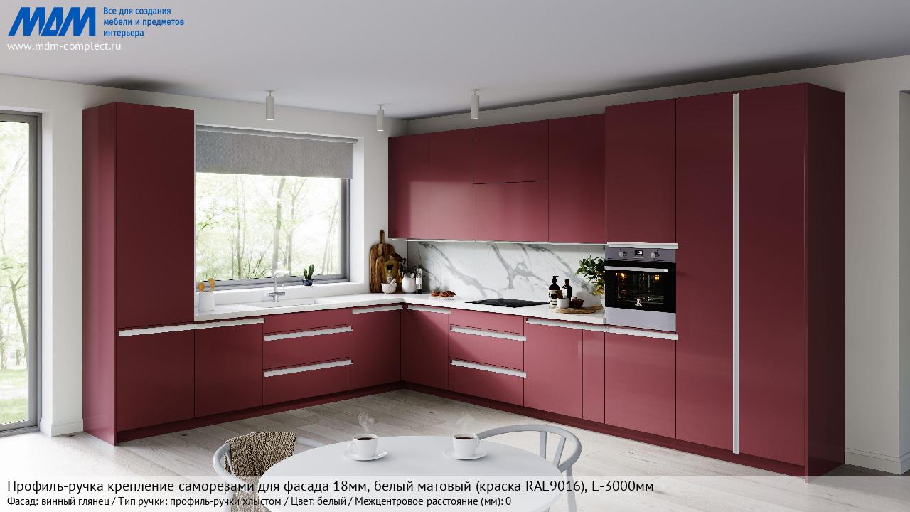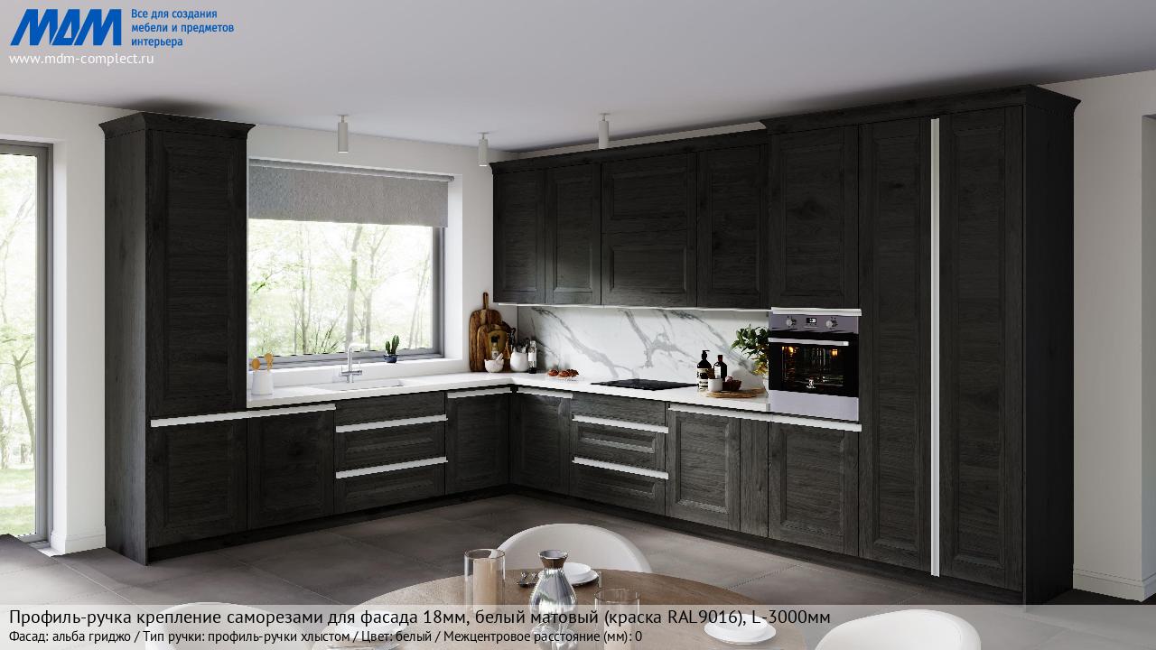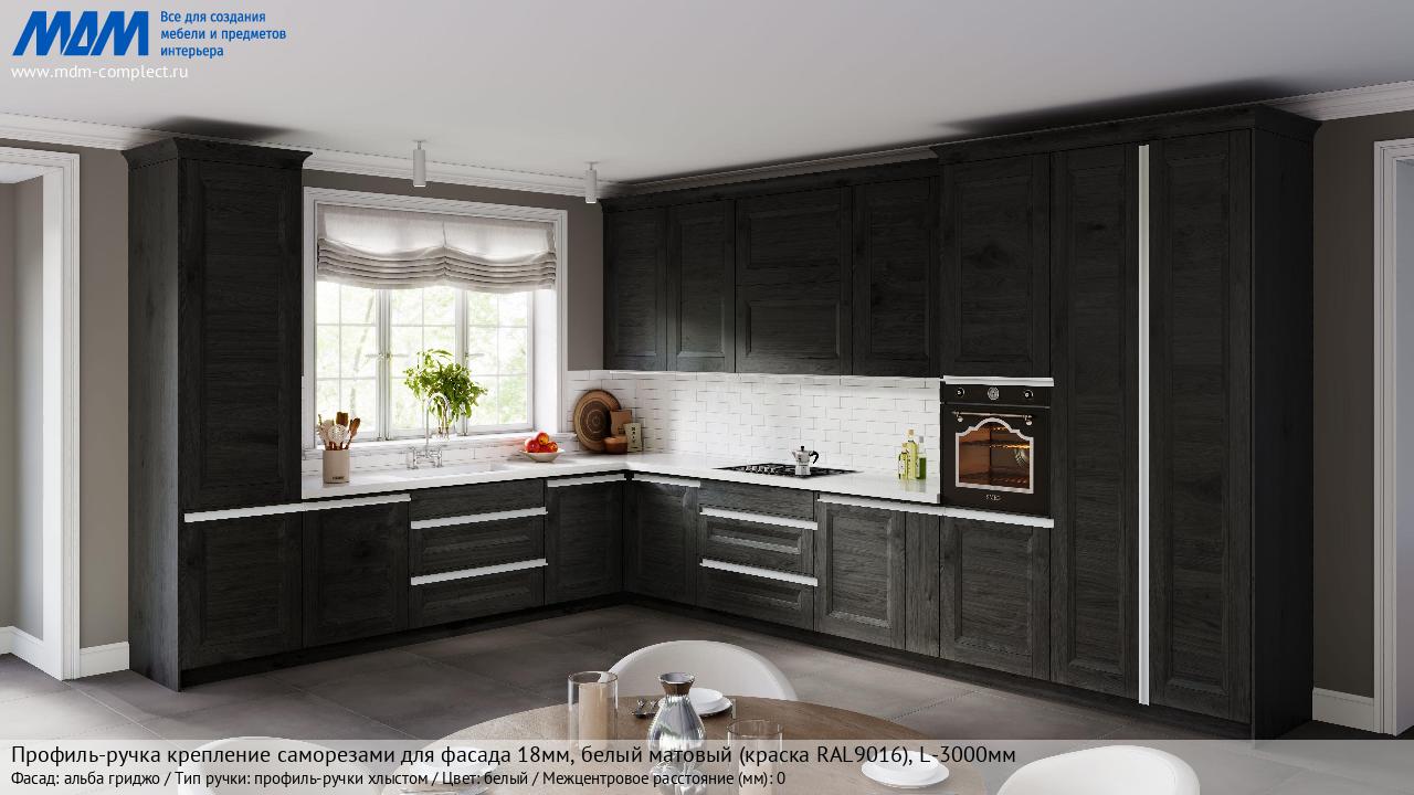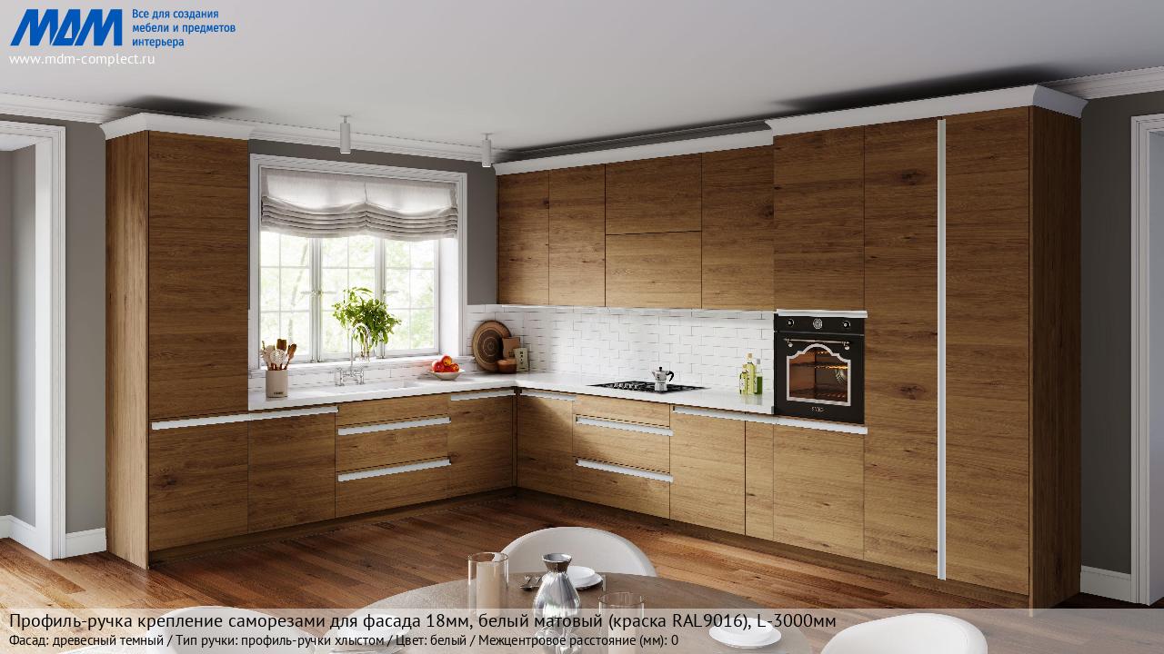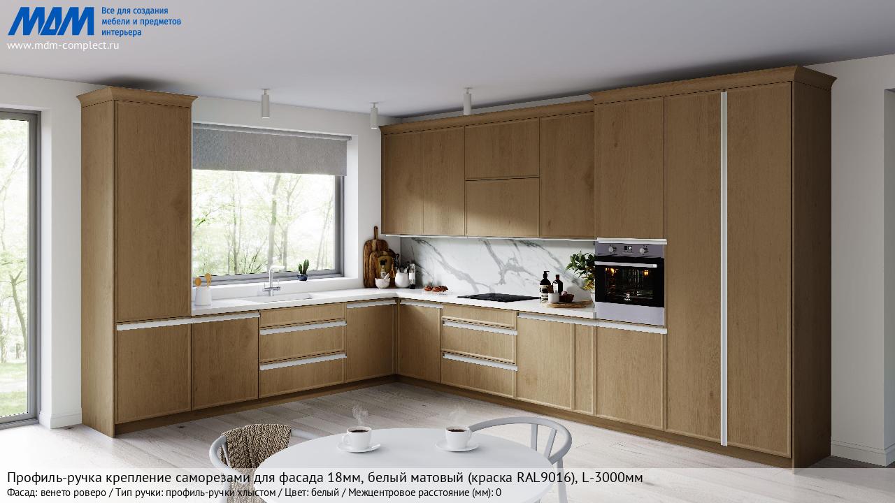 Мебельная Профиль-ручка крепление саморезами для фасада 18мм, белый матовый (краска RAL9016), L-3000мм на различных фасадах в кухонном интерьере в стиле классика, лофт, модерн.