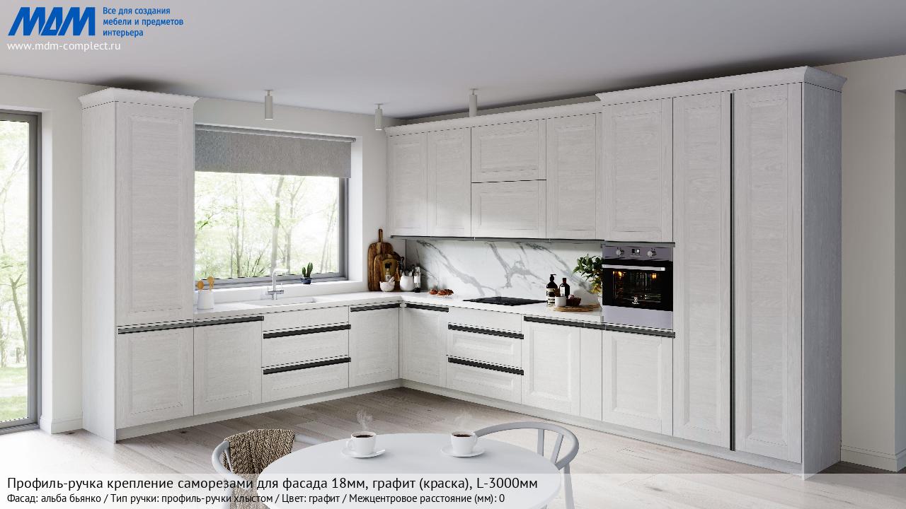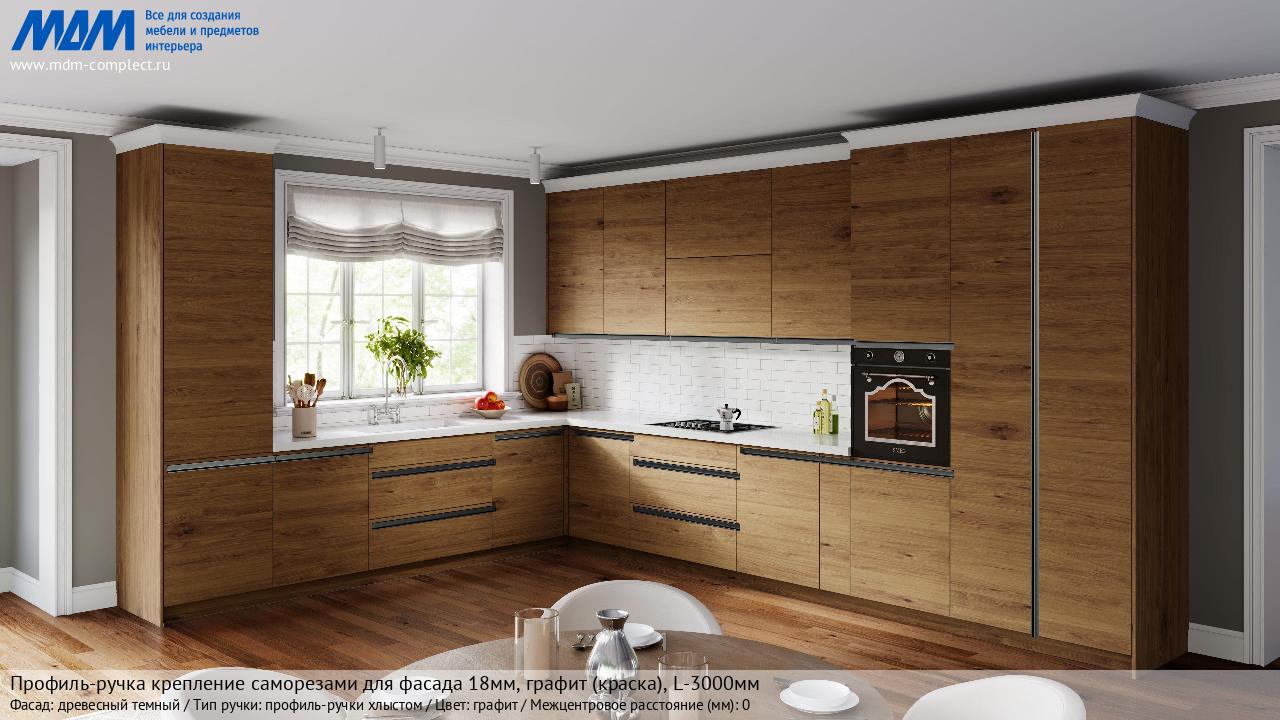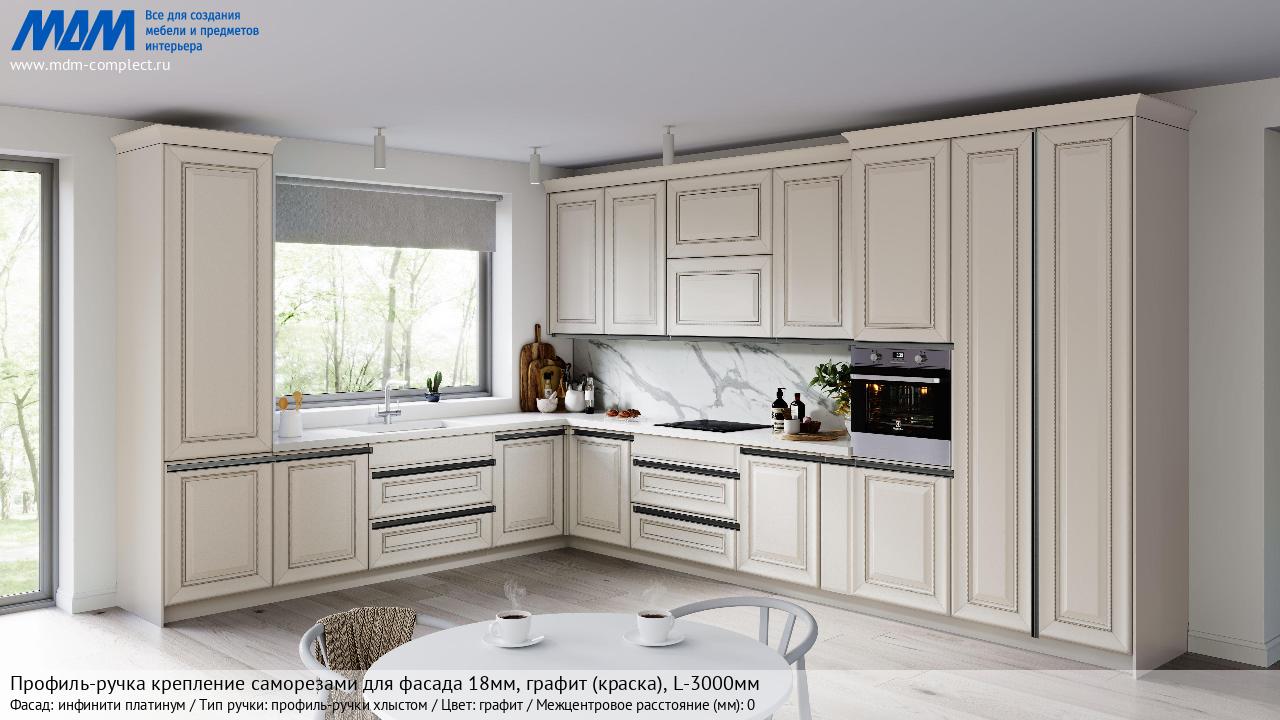 Мебельная Профиль-ручка крепление саморезами для фасада 18мм, графит (краска), L-3000мм на различных фасадах в кухонном интерьере в стиле классика, лофт, модерн.