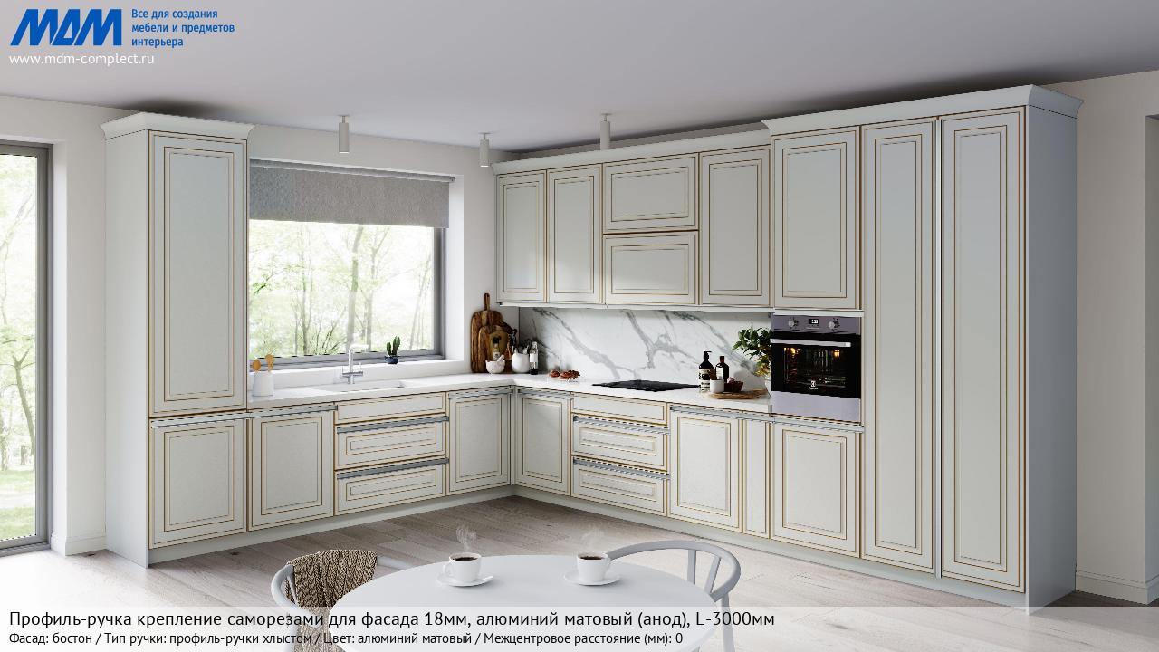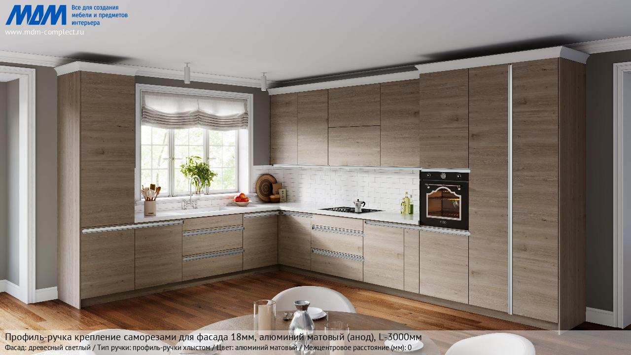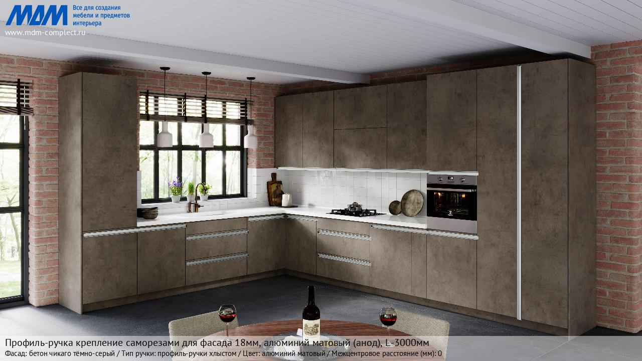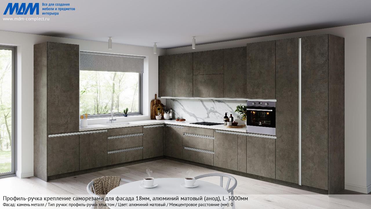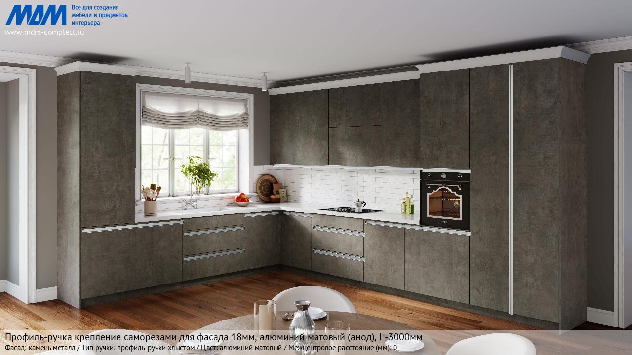 Мебельная Профиль-ручка крепление саморезами для фасада 18мм, алюминий матовый (анод), L-3000мм на различных фасадах в кухонном интерьере в стиле классика, лофт, модерн.