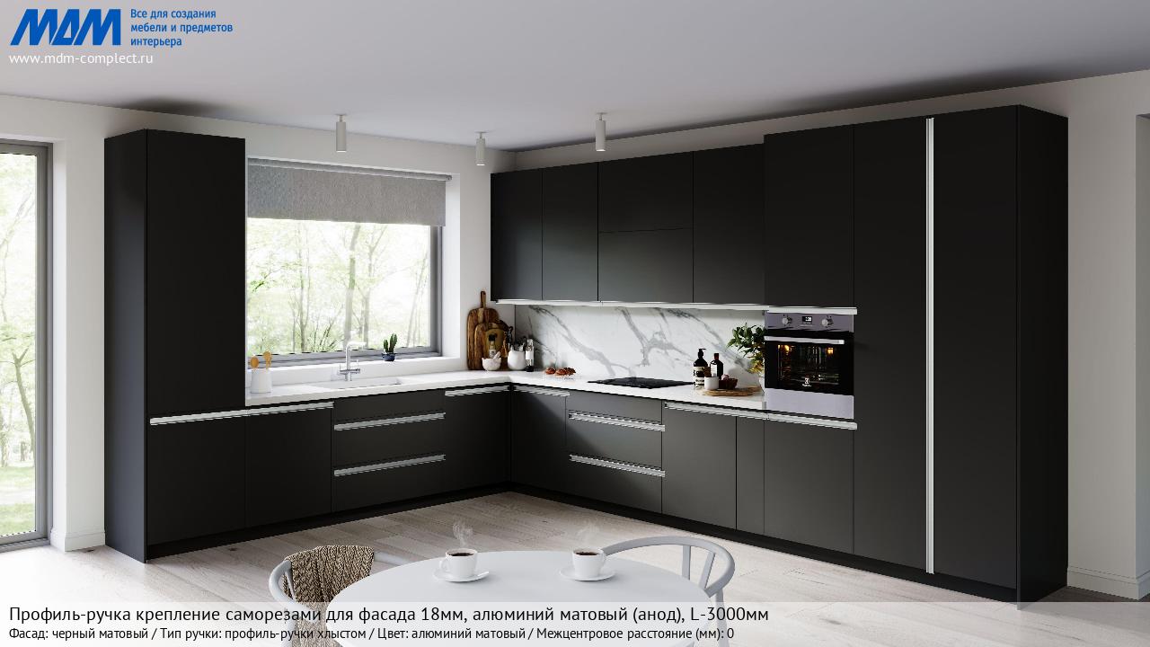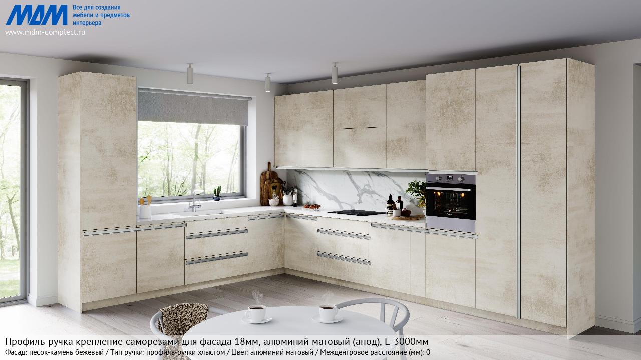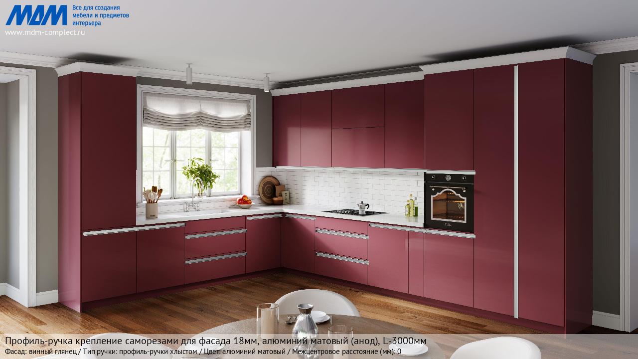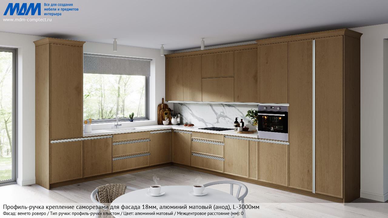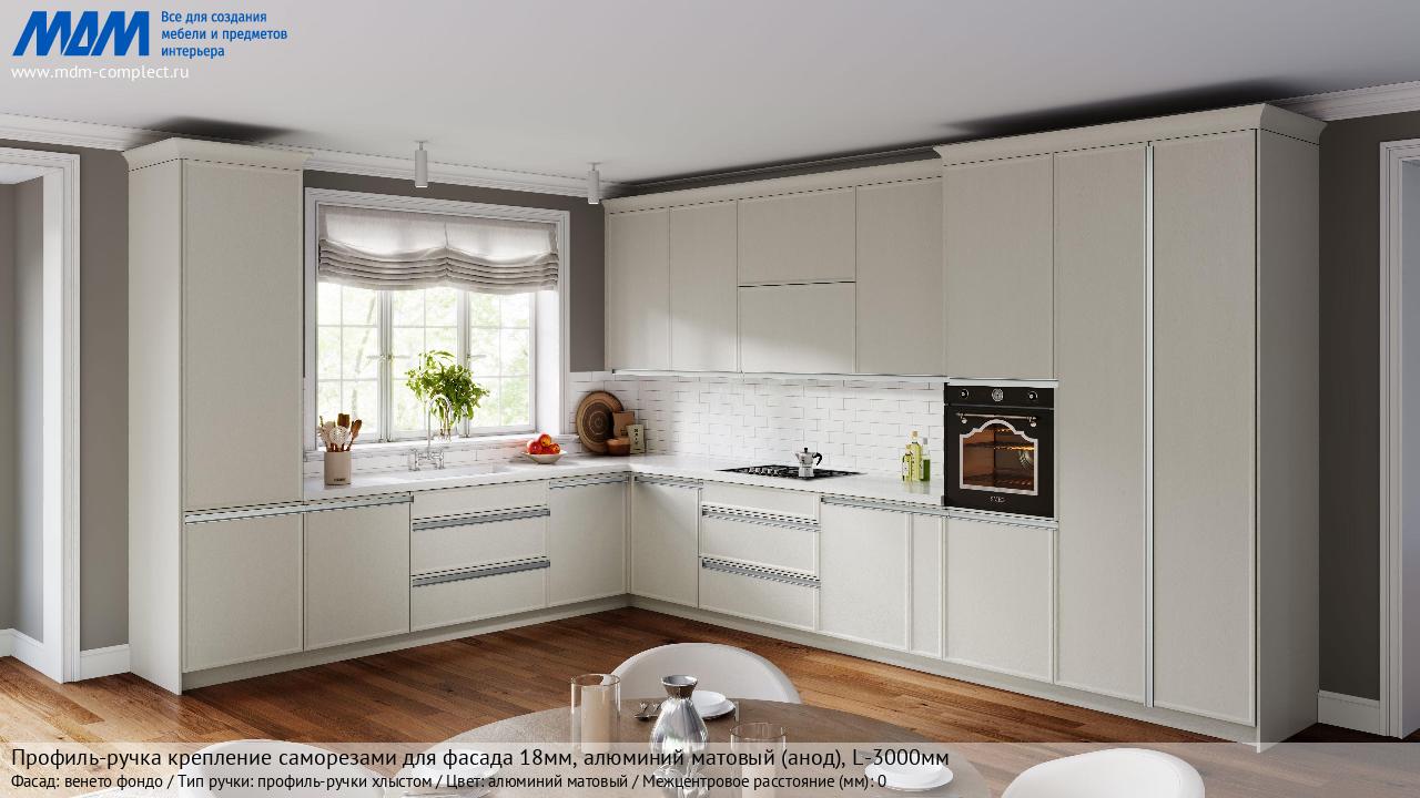 Мебельная Профиль-ручка крепление саморезами для фасада 18мм, алюминий матовый (анод), L-3000мм на различных фасадах в кухонном интерьере в стиле классика, лофт, модерн.