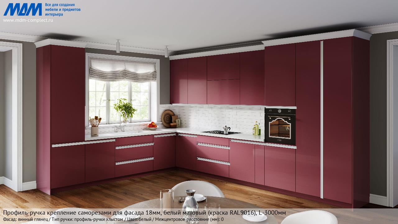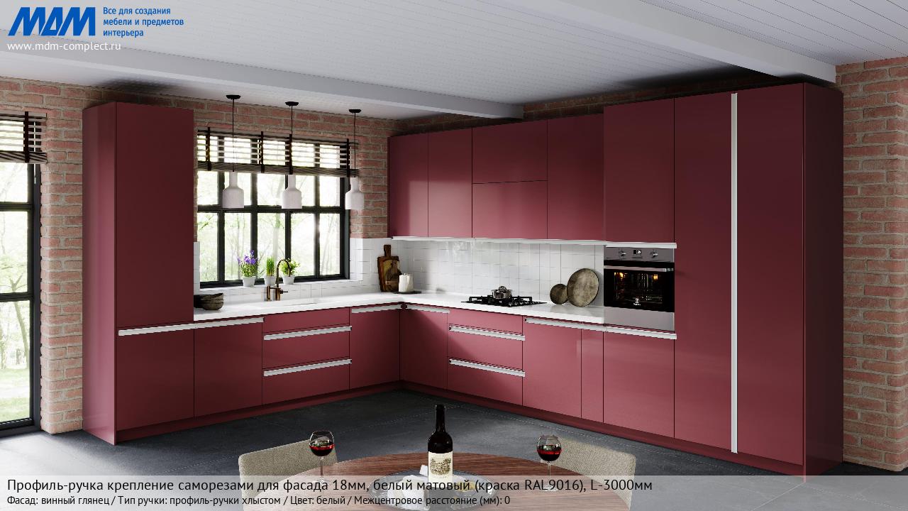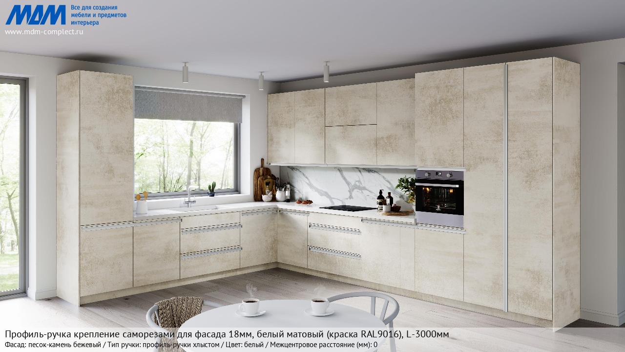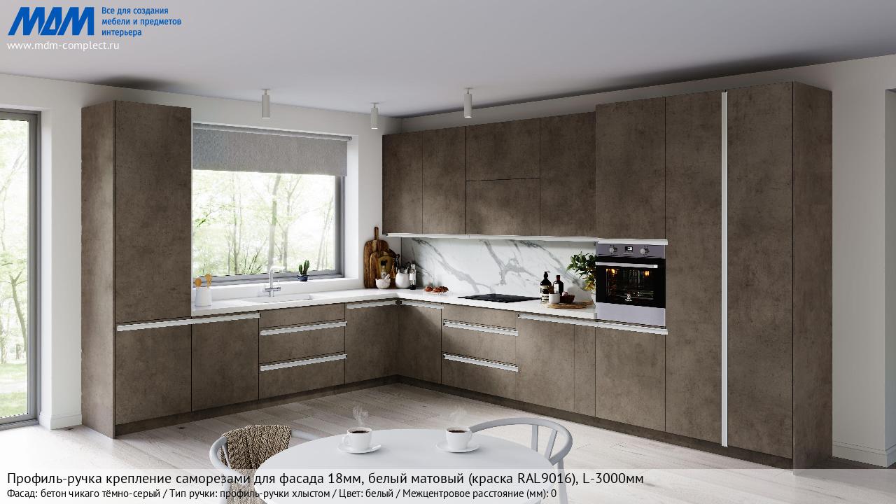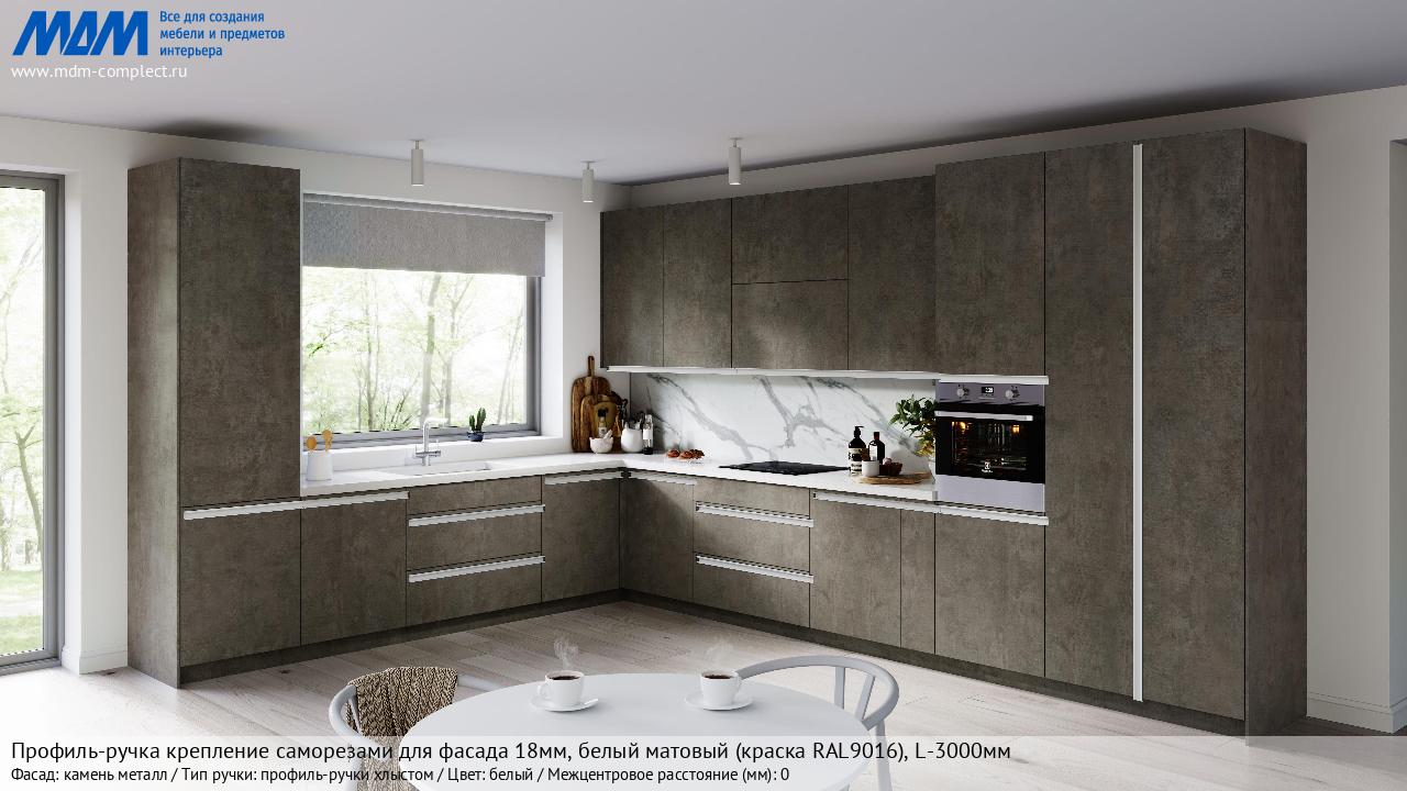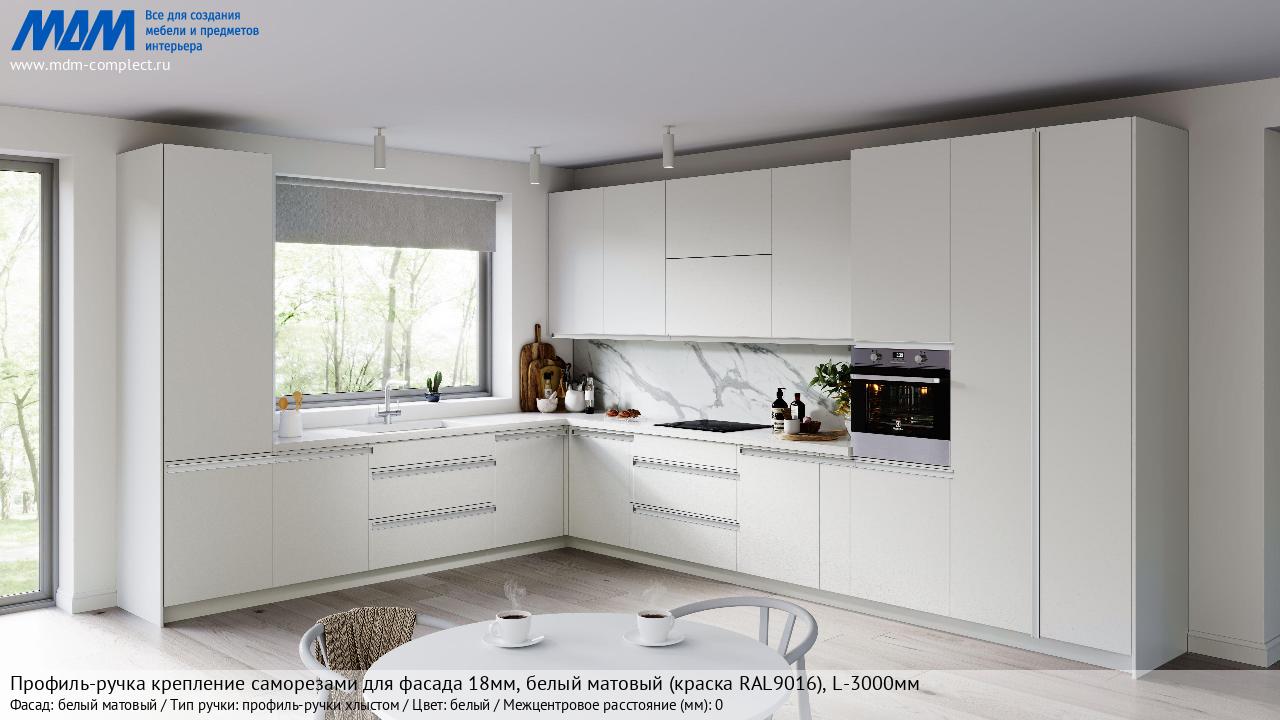 Мебельная Профиль-ручка крепление саморезами для фасада 18мм, белый матовый (краска RAL9016), L-3000мм на различных фасадах в кухонном интерьере в стиле классика, лофт, модерн.
